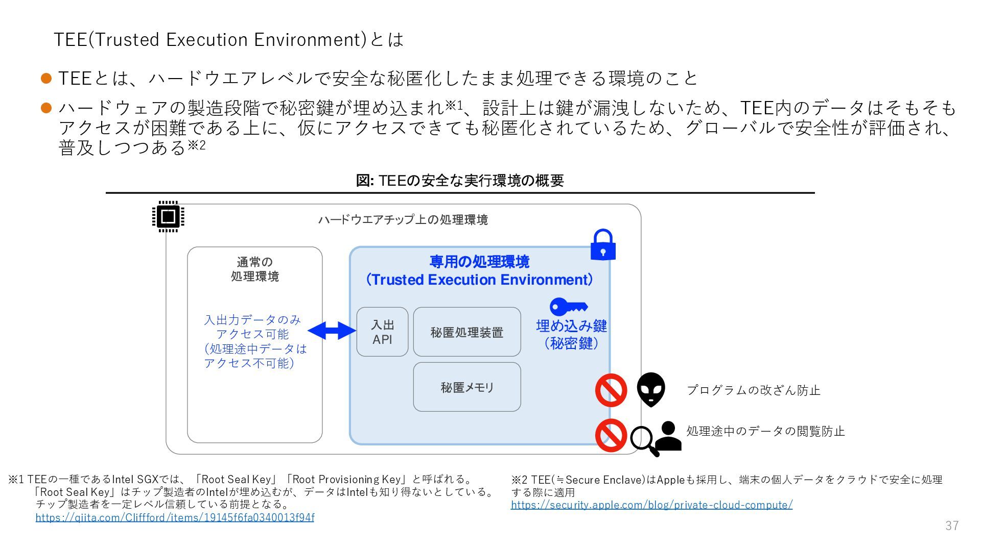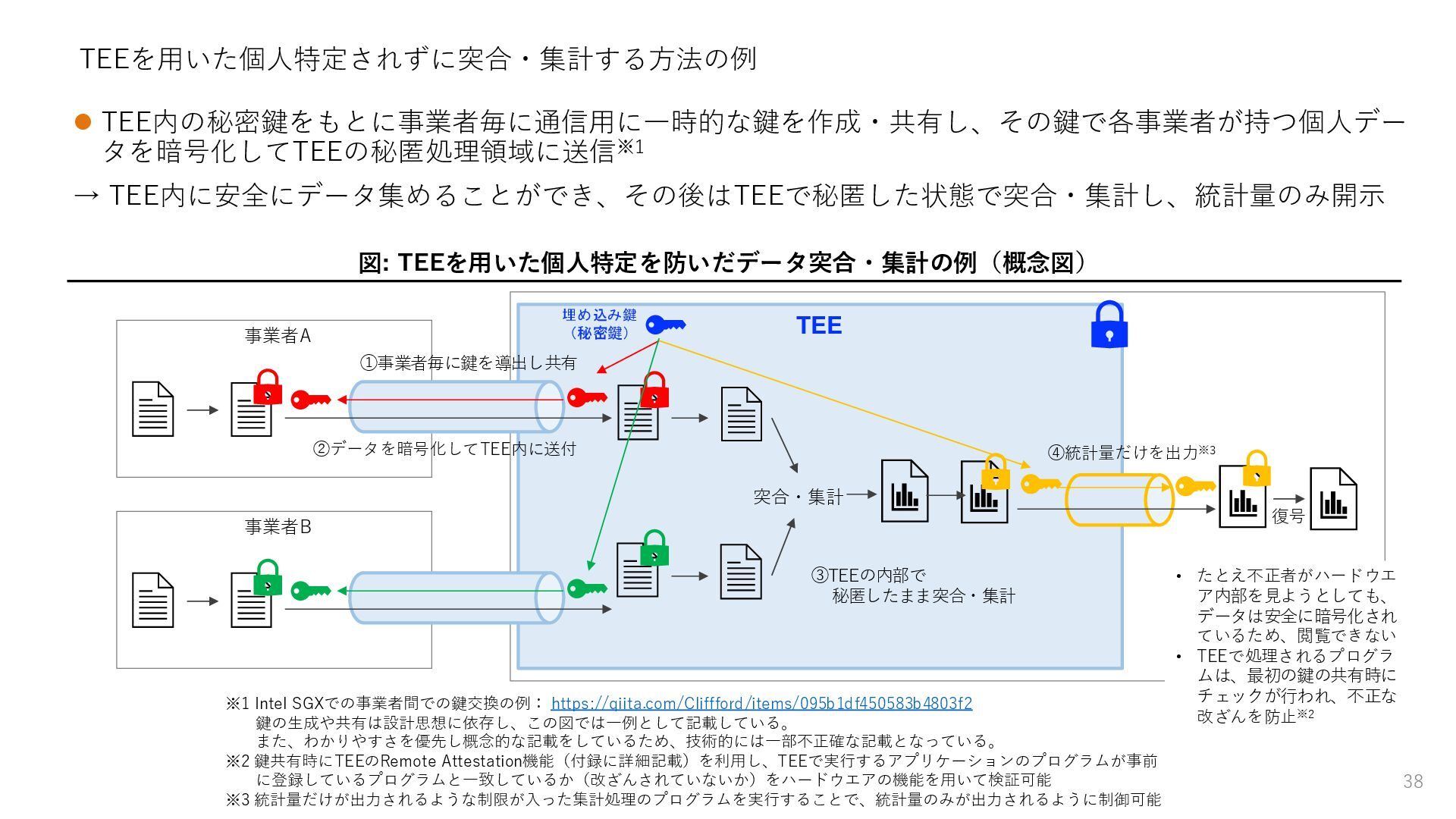 ア内部を見ようとしても、 データは安全に暗号化され ているため、閲覧できない • TEEで処理されるプログラ ムは、最初の鍵の共有時に チェックが行われ、不正な 改ざんを防止※2 ④統計量だけを出力※3 図: TEEを用いた個人特定を防いだデータ突合・集計の例(概念図) ※1 Intel SGXでの事業者間での鍵交換の例: https://qiita.com/Cliffford/items/095b1df450583b4803f2 鍵の生成や共有は設計思想に依存し、この図では一例として記載している。 また、わかりやすさを優先し概念的な記載をしているため、技術的には一部不正確な記載となっている。 ※2 鍵共有時にTEEのRemote Attestation機能(付録に詳細記載)を利用し、TEEで実行するアプリケーションのプログラムが事前 に登録しているプログラムと一致しているか(改ざんされていないか)をハードウエアの機能を用いて検証可能 ※3 統計量だけが出力されるような制限が入った集計処理のプログラムを実行することで、統計量のみが出力されるように制御可能 復号 埋め込み鍵 (秘密鍵) ①事業者毎に鍵を導出し共有 事業者B ⚫ TEE内の秘密鍵をもとに事業者毎に通信用に一時的な鍵を作成・共有し、その鍵で各事業者が持つ個人デー タを暗号化してTEEの秘匿処理領域に送信※1 → TEE内に安全にデータ集めることができ、その後はTEEで秘匿した状態で突合・集計し、統計量のみ開示