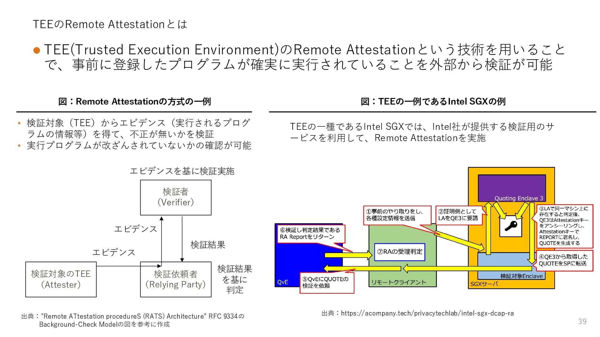 Party) 検証者 (Verifier) 検証対象のTEE (Attester) 図:Remote Attestationの方式の一例 図:TEEの一例であるIntel SGXの例 検証結果 • 検証対象(TEE)からエビデンス(実行されるプログ ラムの情報等)を得て、不正が無いかを検証 • 実行プログラムが改ざんされていないかの確認が可能 エビデンスを基に検証実施 エビデンス 検証結果 を基に 判定 TEEの一種であるIntel SGXでは、Intel社が提供する検証用のサ ービスを利用して、Remote Attestationを実施 出典:”Remote ATtestation procedureS (RATS) Architecture” RFC 9334の Background-Check Modelの図を参考に作成 出典:https://acompany.tech/privacytechlab/intel-sgx-dcap-ra エビデンス 39