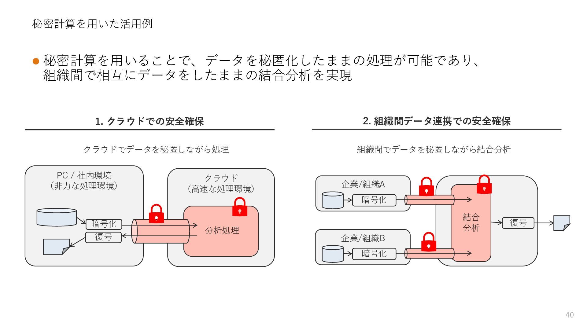 26. TEEを用いた個人特定されずに突合・集計する方法の例 38 TEE 事業者A 突合・集計 ②データを暗号化してTEE内に送付 ③TEEの内部で 秘匿したまま突合・集計 • たとえ不正者がハードウエ