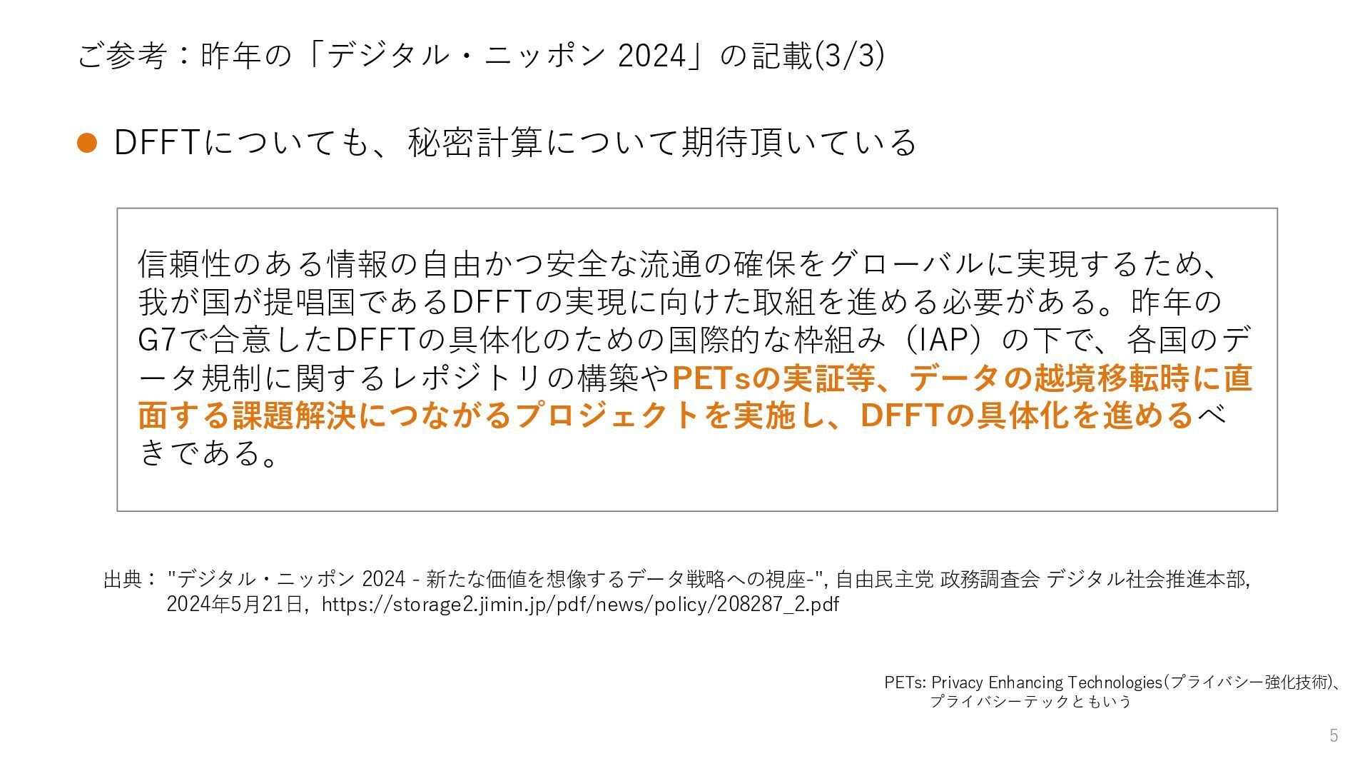自由民主党 政務調査会 デジタル社会推進本部, 2024年5月21日, https://storage2.jimin.jp/pdf/news/policy/208287_2.pdf 信頼性のある情報の自由かつ安全な流通の確保をグローバルに実現するため、 我が国が提唱国であるDFFTの実現に向けた取組を進める必要がある。昨年の G7で合意したDFFTの具体化のための国際的な枠組み(IAP)の下で、各国のデ ータ規制に関するレポジトリの構築やPETsの実証等、データの越境移転時に直 面する課題解決につながるプロジェクトを実施し、DFFTの具体化を進めるべ きである。 PETs: Privacy Enhancing Technologies(プライバシー強化技術)、 プライバシーテックともいう