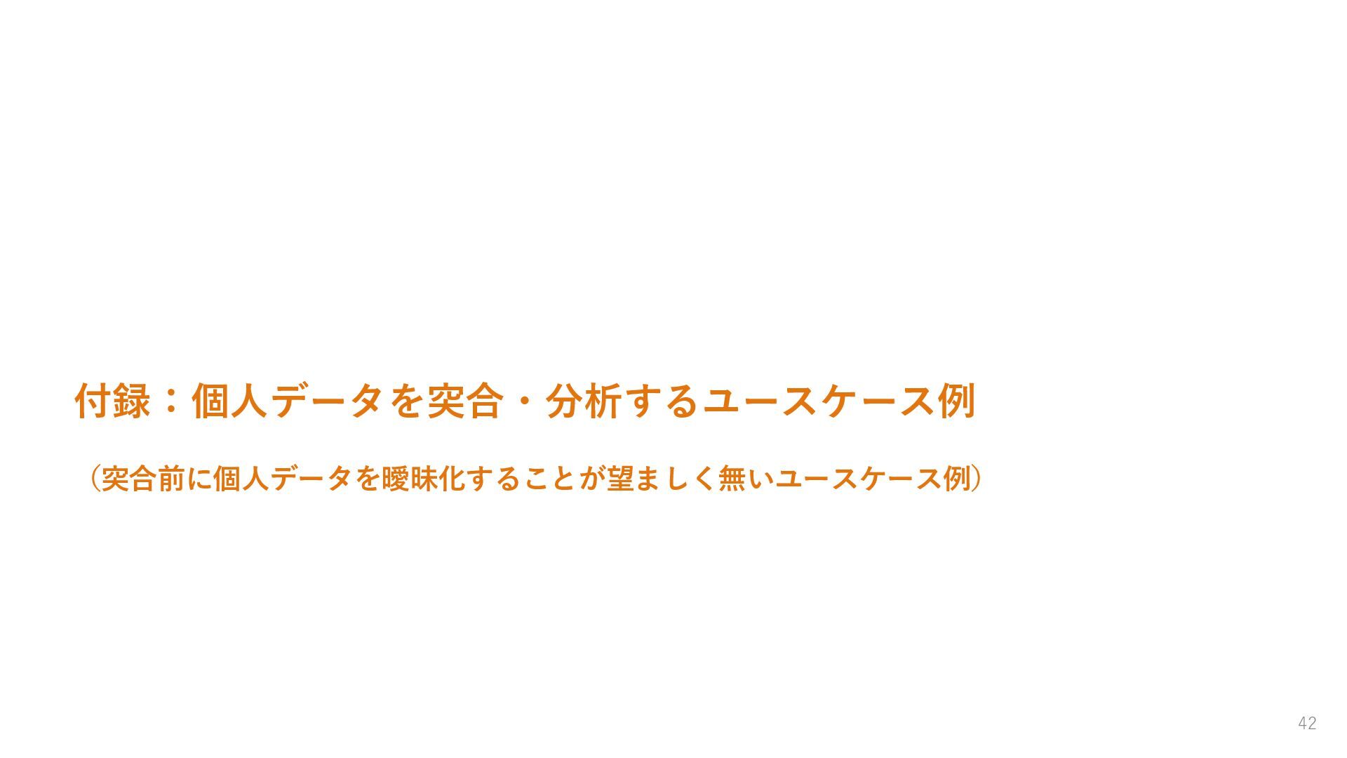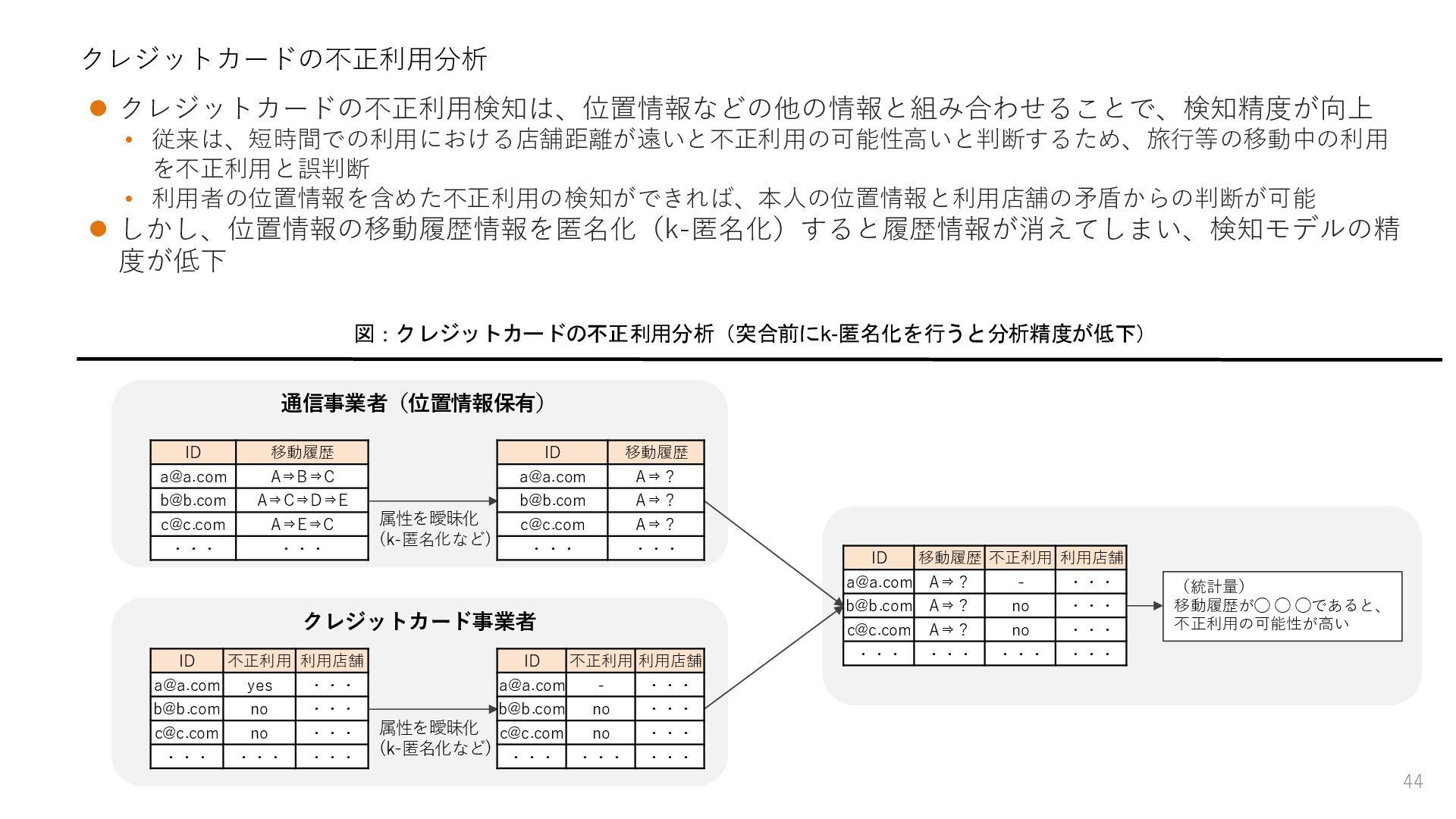 ・・・ ・・・ ID 不正利用 利用店舗 [email protected] yes ・・・ [email protected] no ・・・ [email protected] no ・・・ ・・・ ・・・ ・・・ ID 移動履歴 不正利用 利用店舗 [email protected] A⇒? - ・・・ [email protected] A⇒? no ・・・ [email protected] A⇒? no ・・・ ・・・ ・・・ ・・・ ・・・ (統計量) 移動履歴が◯ ◯ ◯であると、 不正利用の可能性が高い 通信事業者(位置情報保有) クレジットカード事業者 ID 移動履歴 [email protected] A⇒? [email protected] A⇒? [email protected] A⇒? ・・・ ・・・ ID 不正利用 利用店舗 [email protected] - ・・・ [email protected] no ・・・ [email protected] no ・・・ ・・・ ・・・ ・・・ 属性を曖昧化 (k-匿名化など) 図:クレジットカードの不正利用分析(突合前にk-匿名化を行うと分析精度が低下) 属性を曖昧化 (k-匿名化など) ⚫ クレジットカードの不正利用検知は、位置情報などの他の情報と組み合わせることで、検知精度が向上 • 従来は、短時間での利用における店舗距離が遠いと不正利用の可能性高いと判断するため、旅行等の移動中の利用 を不正利用と誤判断 • 利用者の位置情報を含めた不正利用の検知ができれば、本人の位置情報と利用店舗の矛盾からの判断が可能 ⚫ しかし、位置情報の移動履歴情報を匿名化(k-匿名化)すると履歴情報が消えてしまい、検知モデルの精 度が低下