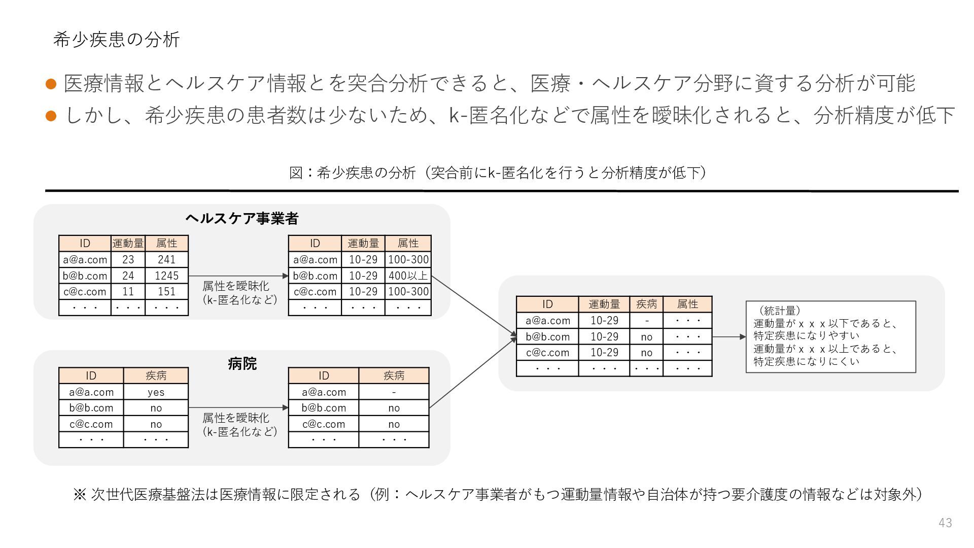 23 241 [email protected] 24 1245 [email protected] 11 151 ・・・ ・・・ ・・・ ID 疾病 [email protected] yes [email protected] no [email protected] no ・・・ ・・・ ID 運動量 疾病 属性 [email protected] 10-29 - ・・・ [email protected] 10-29 no ・・・ [email protected] 10-29 no ・・・ ・・・ ・・・ ・・・ ・・・ (統計量) 運動量がxxx以下であると、 特定疾患になりやすい 運動量がxxx以上であると、 特定疾患になりにくい ヘルスケア事業者 病院 ID 運動量 属性 [email protected] 10-29 100-300 [email protected] 10-29 400以上 [email protected] 10-29 100-300 ・・・ ・・・ ・・・ ID 疾病 [email protected] - [email protected] no [email protected] no ・・・ ・・・ ※ 次世代医療基盤法は医療情報に限定される(例:ヘルスケア事業者がもつ運動量情報や自治体が持つ要介護度の情報などは対象外) 属性を曖昧化 (k-匿名化など) 図:希少疾患の分析(突合前にk-匿名化を行うと分析精度が低下) 属性を曖昧化 (k-匿名化など)
