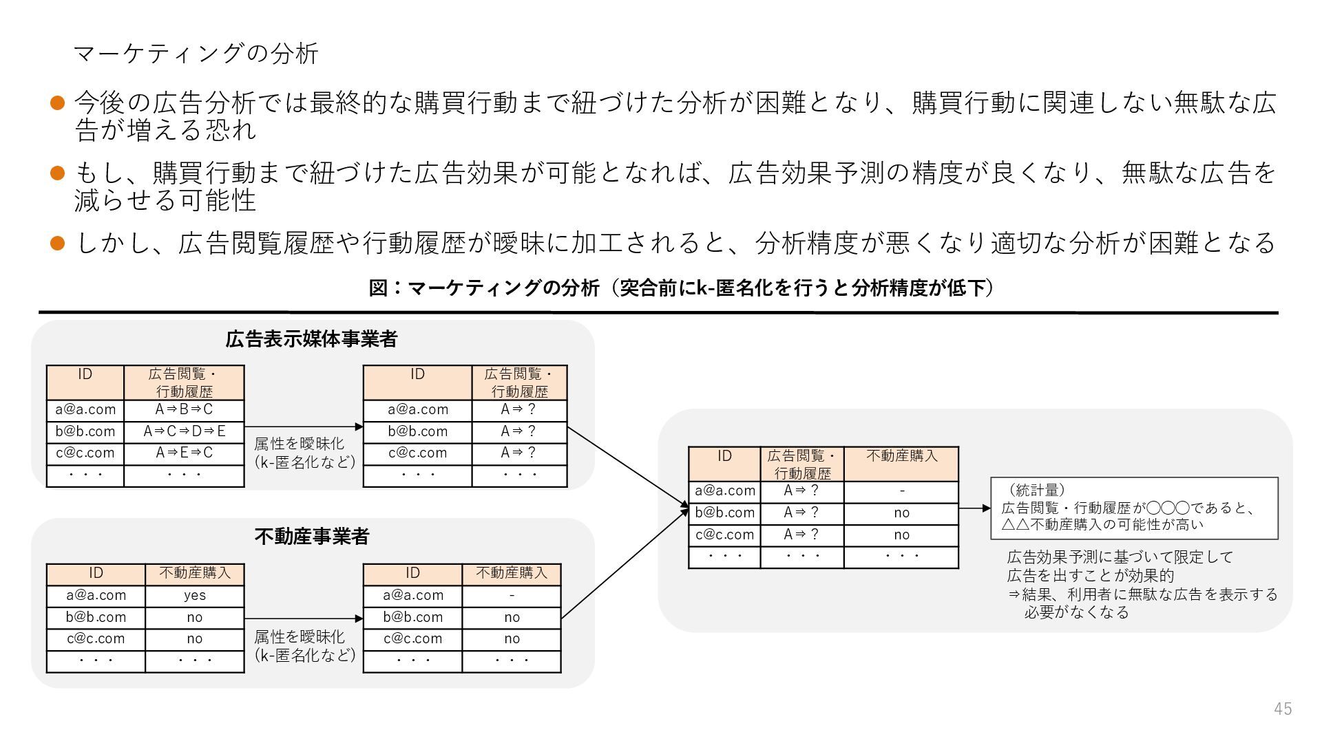 ID 広告閲覧・ 行動履歴 [email protected] A⇒B⇒C [email protected] A⇒C⇒D⇒E [email protected] A⇒E⇒C ・・・ ・・・ ID 不動産購入 [email protected] yes [email protected] no [email protected] no ・・・ ・・・ ID 広告閲覧・ 行動履歴 不動産購入 [email protected] A⇒? - [email protected] A⇒? no [email protected] A⇒? no ・・・ ・・・ ・・・ (統計量) 広告閲覧・行動履歴が◯◯◯であると、 △△不動産購入の可能性が高い 広告表示媒体事業者 不動産事業者 ID 広告閲覧・ 行動履歴 [email protected] A⇒? [email protected] A⇒? [email protected] A⇒? ・・・ ・・・ ID 不動産購入 [email protected] - [email protected] no [email protected] no ・・・ ・・・ 広告効果予測に基づいて限定して 広告を出すことが効果的 ⇒結果、利用者に無駄な広告を表示する 必要がなくなる 属性を曖昧化 (k-匿名化など) 図:マーケティングの分析(突合前にk-匿名化を行うと分析精度が低下) 属性を曖昧化 (k-匿名化など)