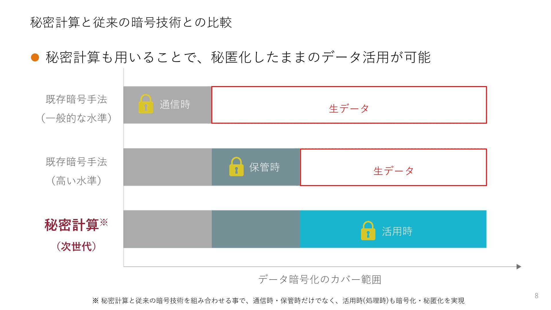 データ暗号化のカバー範囲 秘密計算※ (次世代) 生データ 生データ 通信時 ※ 秘密計算と従来の暗号技術を組み合わせる事で、通信時・保管時だけでなく、活用時(処理時)も暗号化・秘匿化を実現