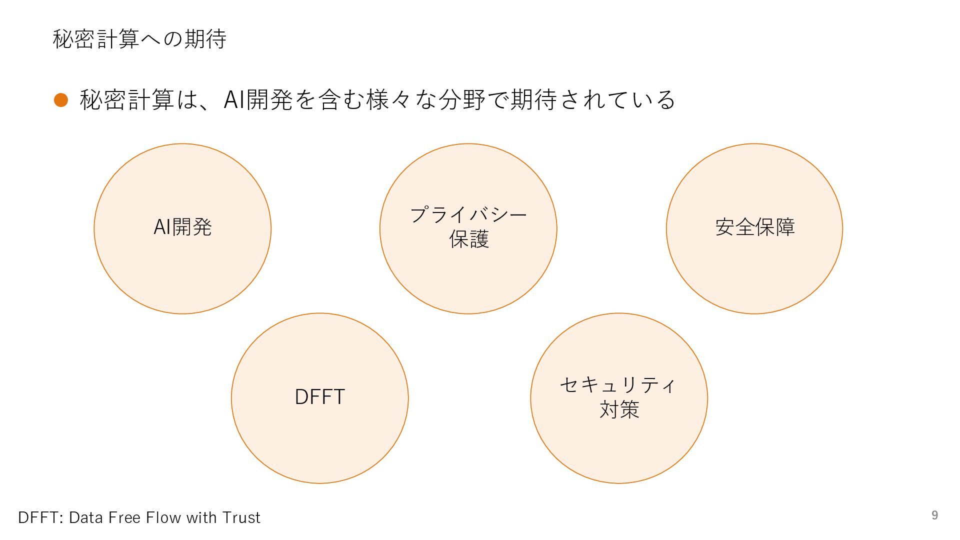 8. サーバ 秘密計算環境 スマホ 秘密計算環境 生成AI 処理 AI対応の秘密計算(TEE/機密コンピューティング) ⚫ AI対応の秘密計算は、生成AIの処理も高速に実行可能 ⚫