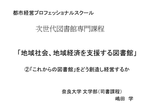 都市経営プロフェッショナルスクール 次世代図書館専門課程 「地域社会、地域経済を支援する図書館」 ②「これからの図書館」をどう創造し経営するか 奈良大学 文学部(司書課程) 嶋田 学