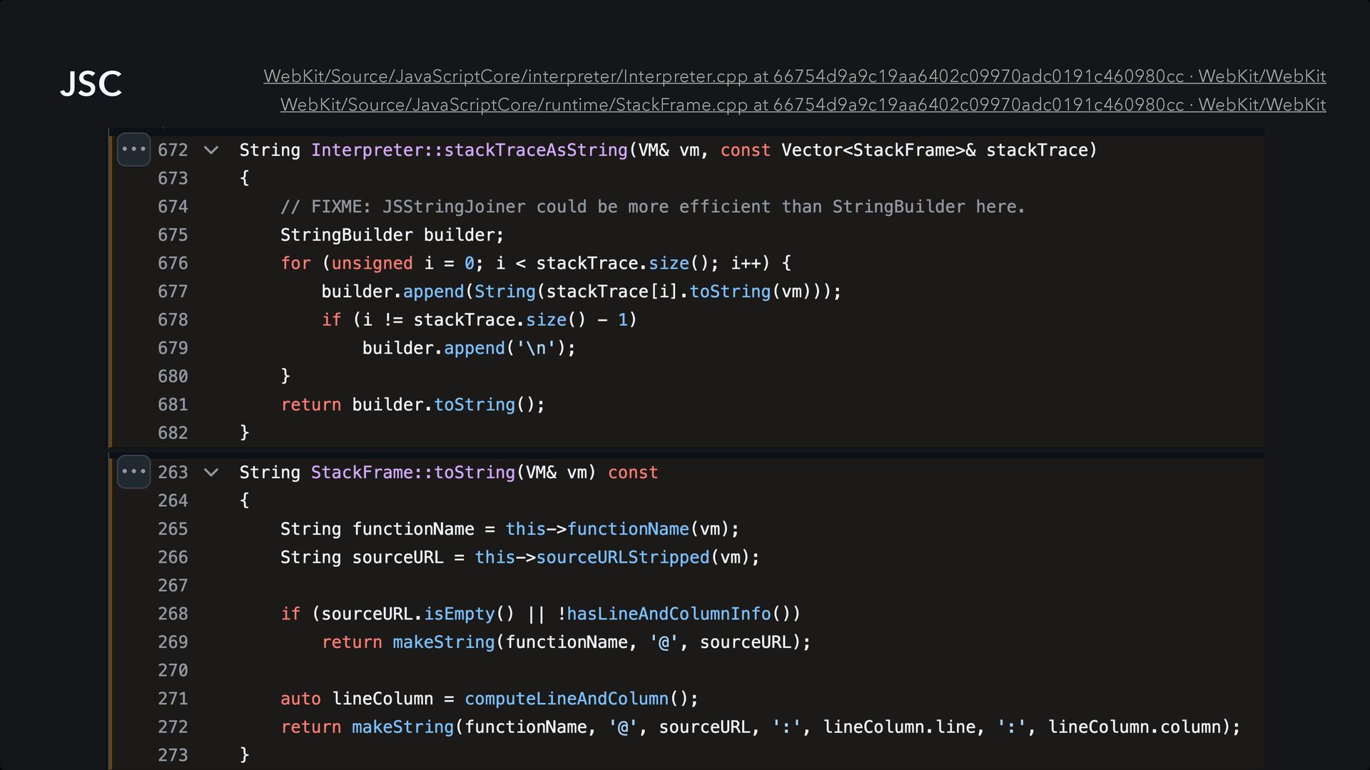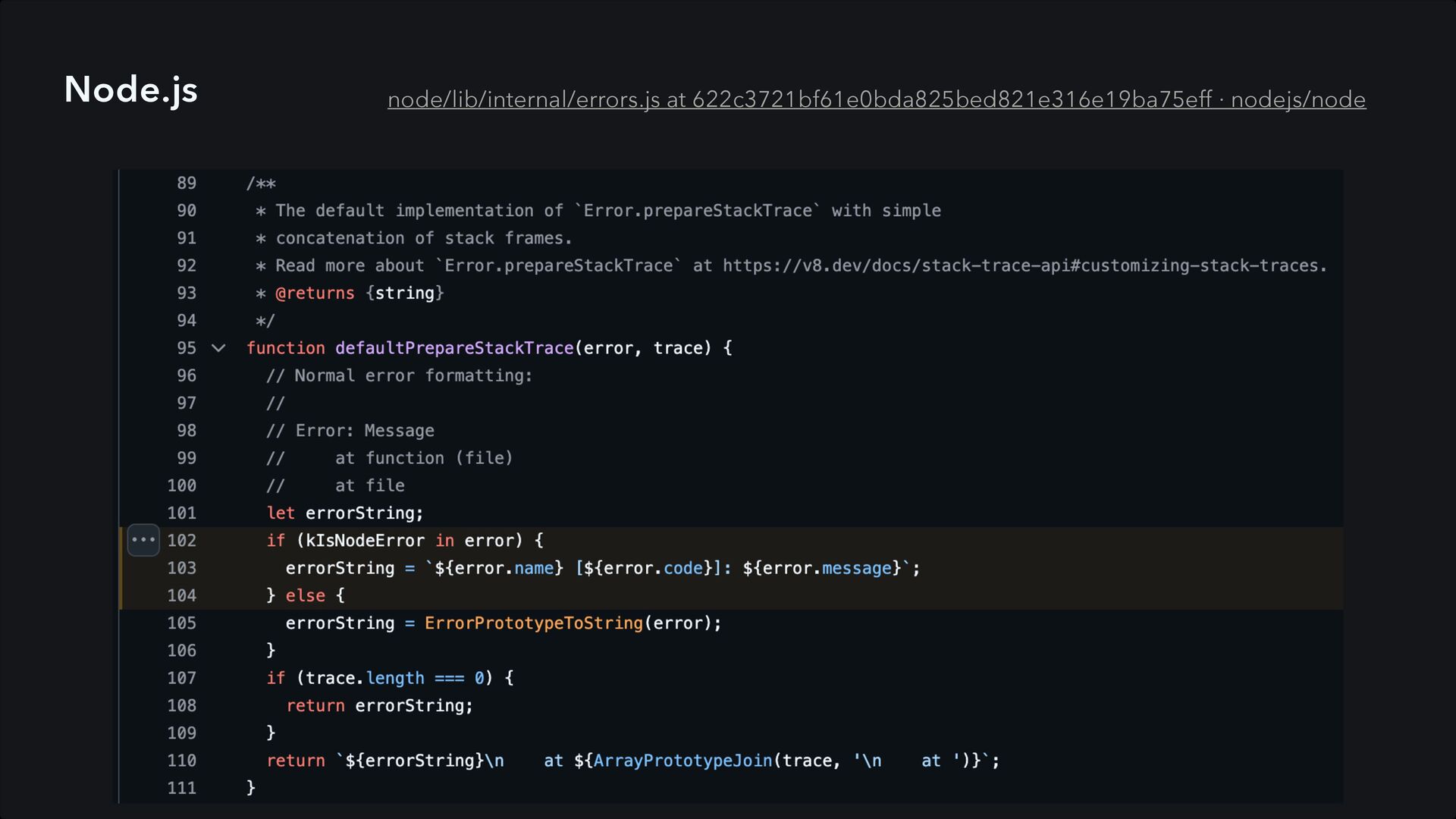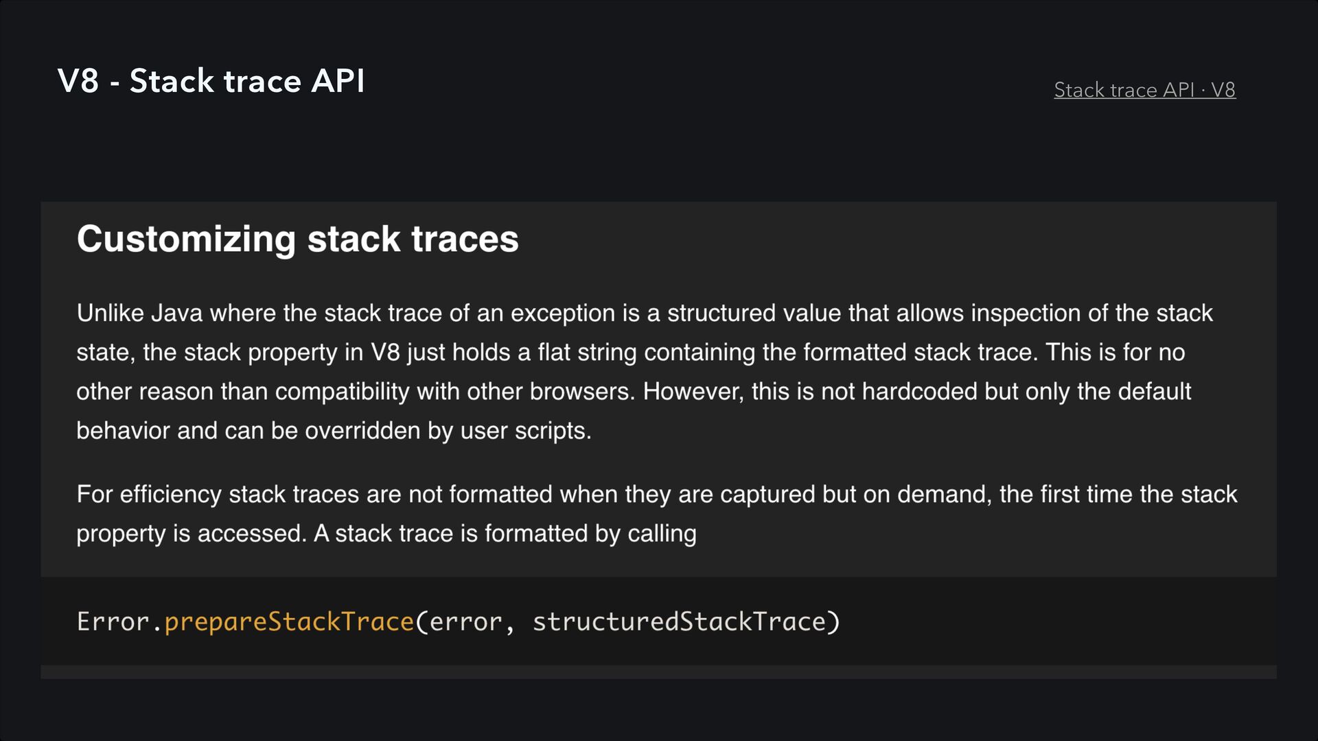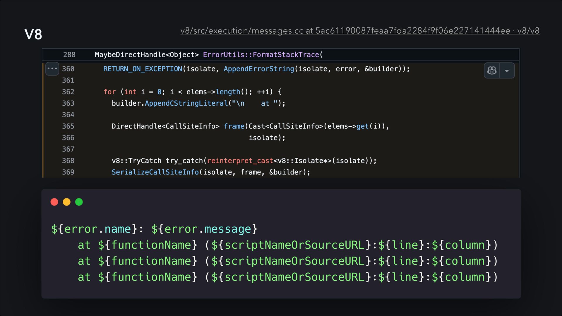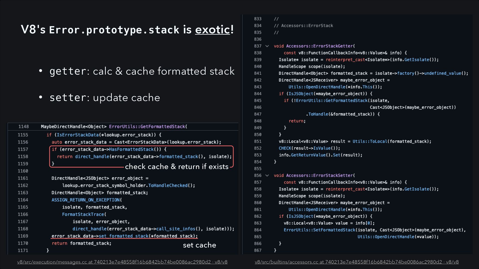 cache V8's Error.prototype.stack is exotic! v8/src/execution/messages.cc at 740213e7e48558f16b6842bb74be0086ac2980d2 · v8/v8 v8/src/builtins/accessors.cc at 740213e7e48558f16b6842bb74be0086ac2980d2 · v8/v8 check cache & return if exists set cache