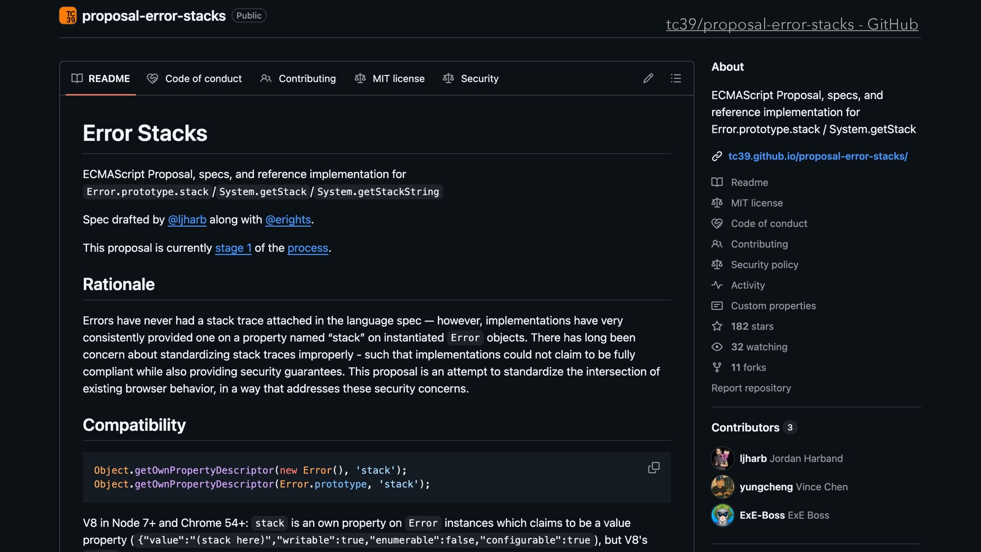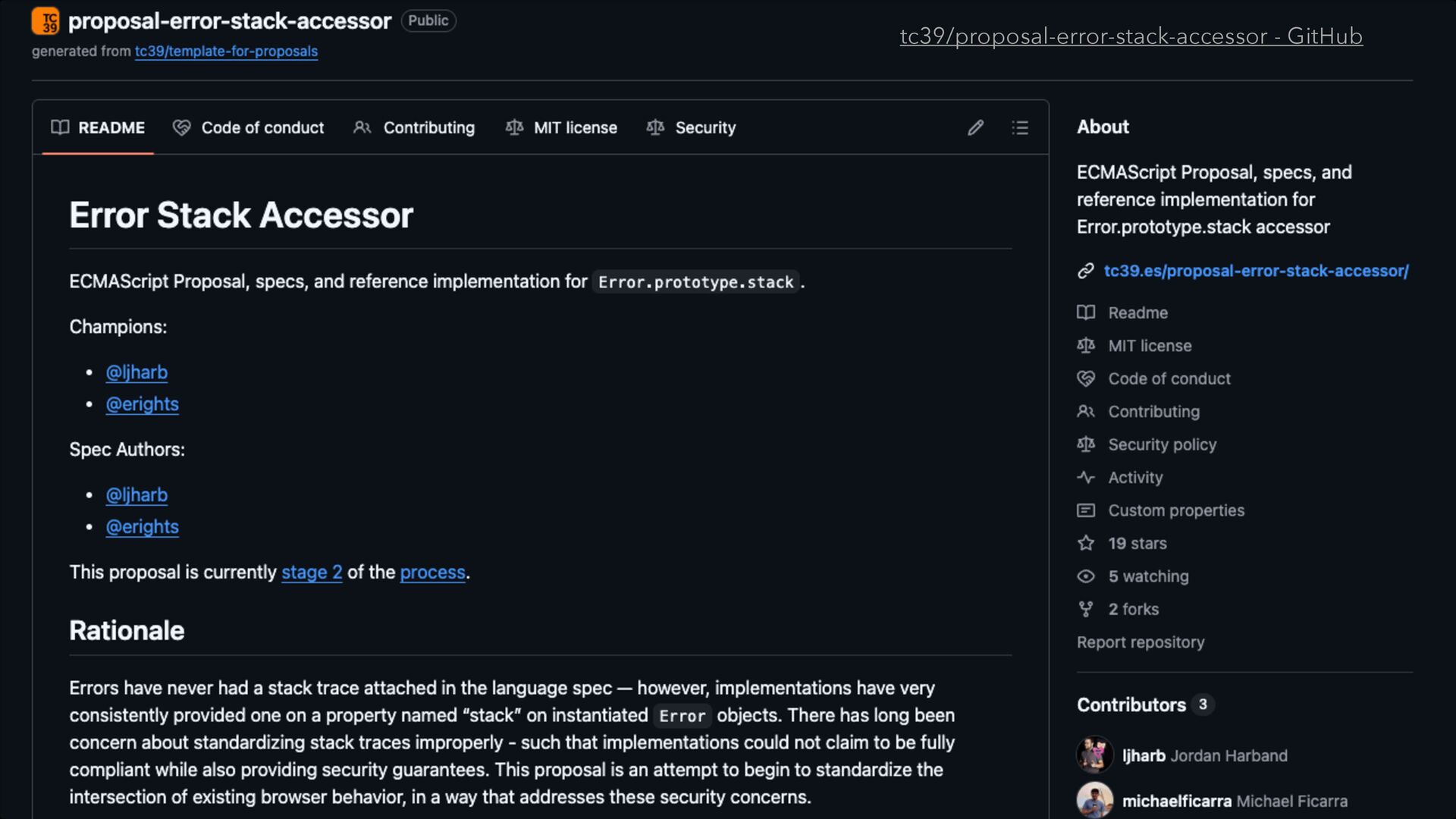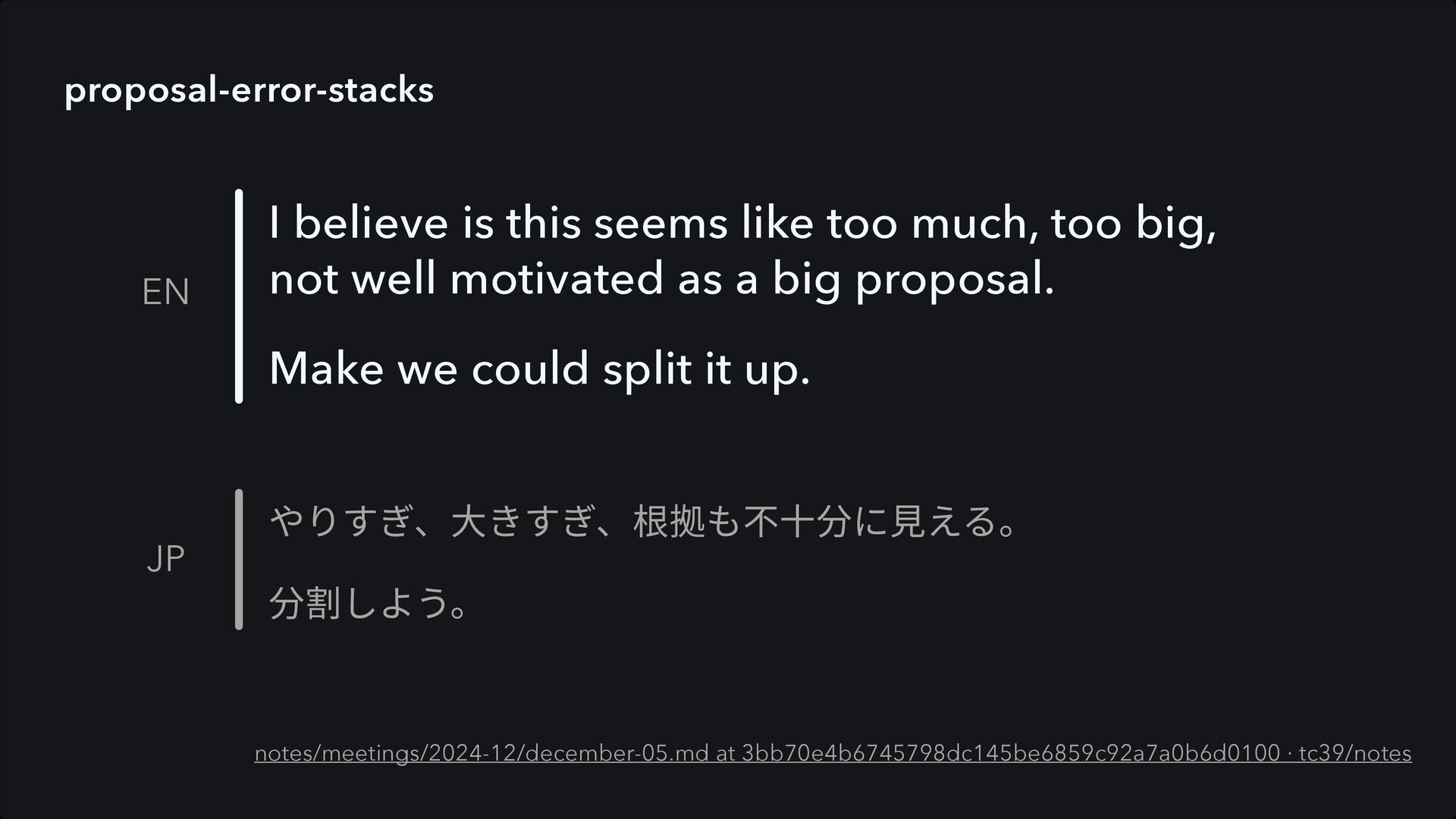 not well motivated as a big proposal. Make we could split it up. やりすぎ、 大 きすぎ、根拠も不 十 分に 見 える。 分割しよう。 notes/meetings/2024-12/december-05.md at 3bb70e4b6745798dc145be6859c92a7a0b6d0100 · tc39/notes proposal-error-stacks EN JP