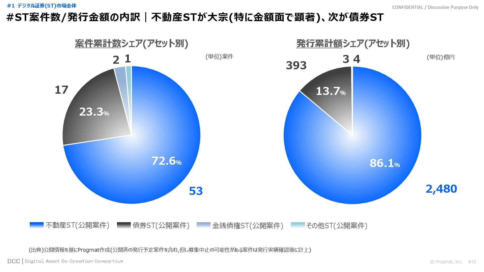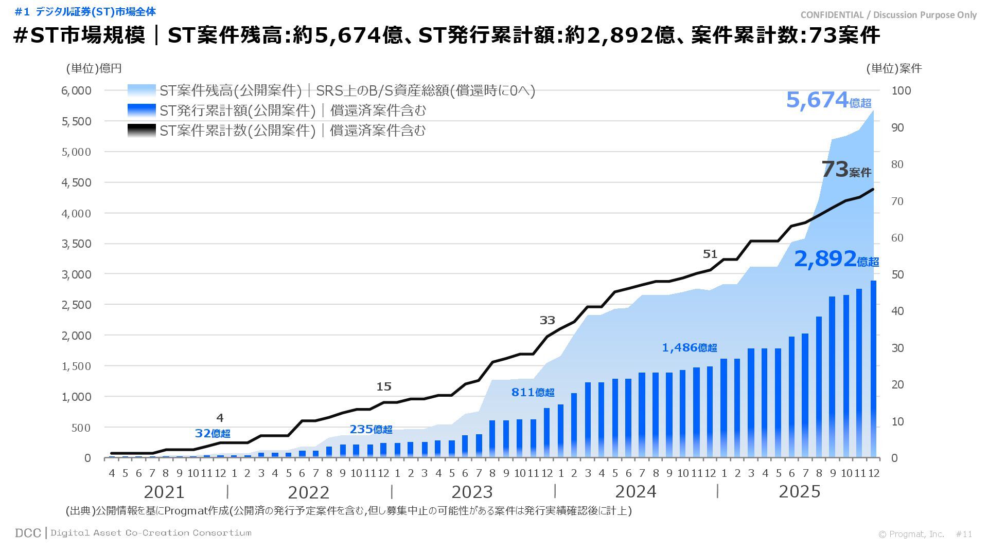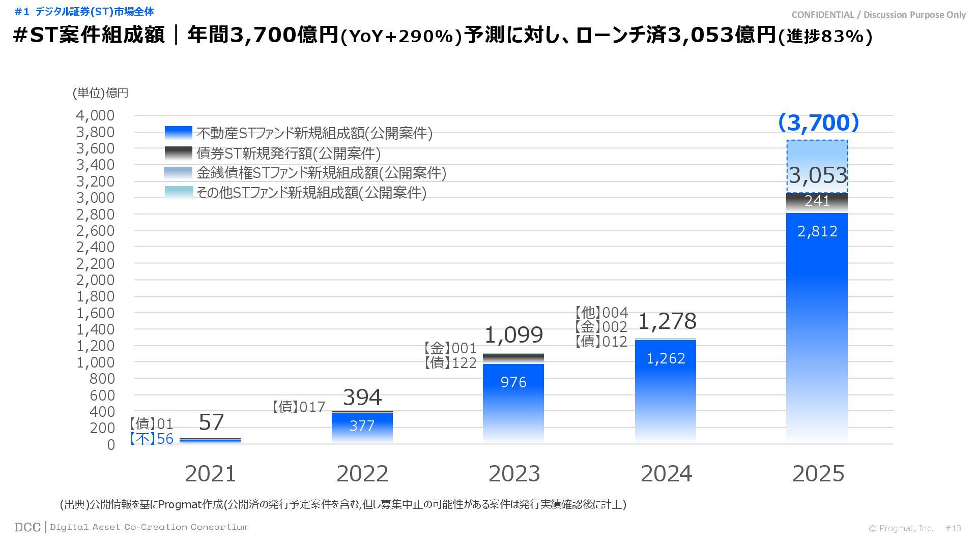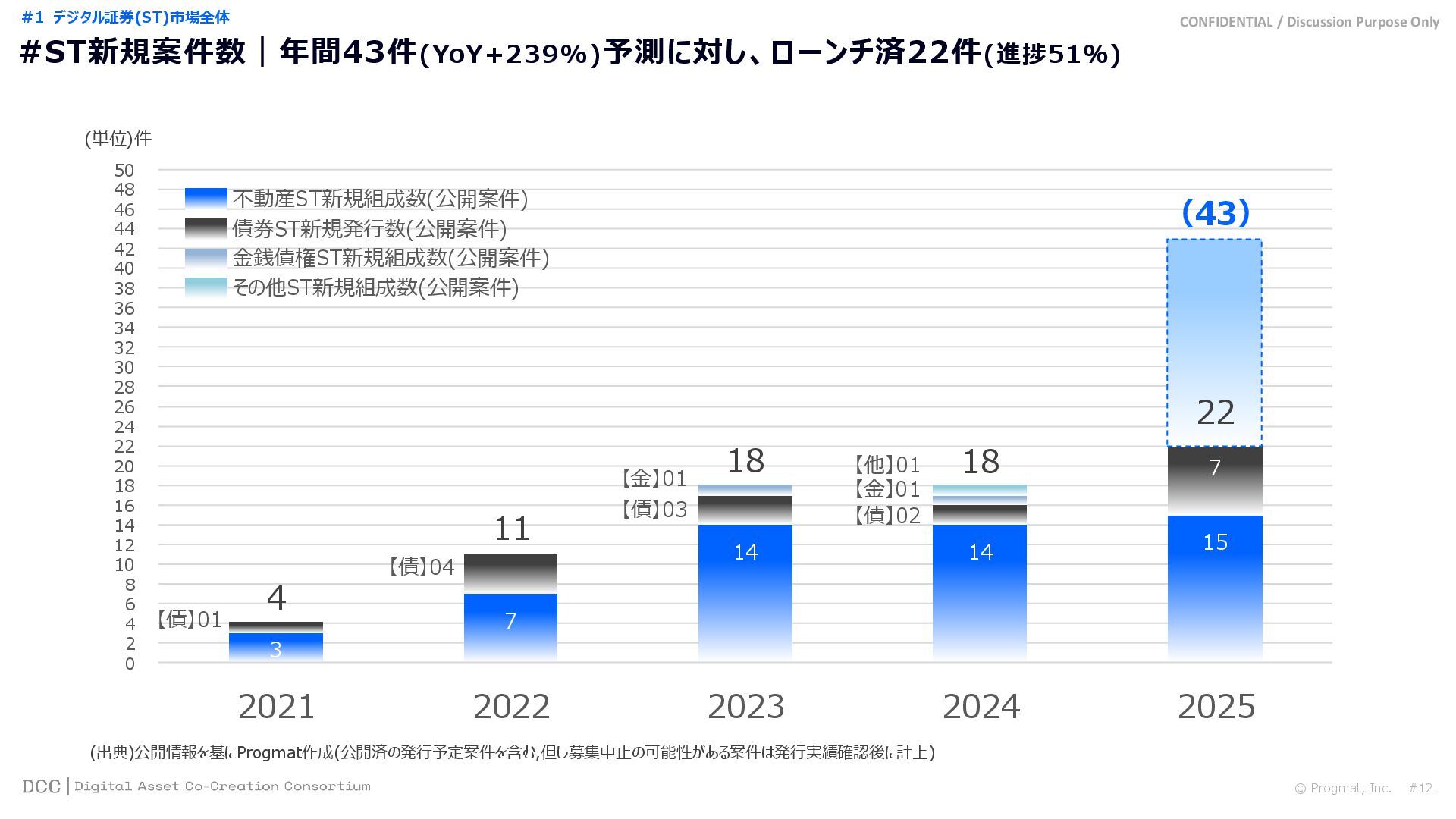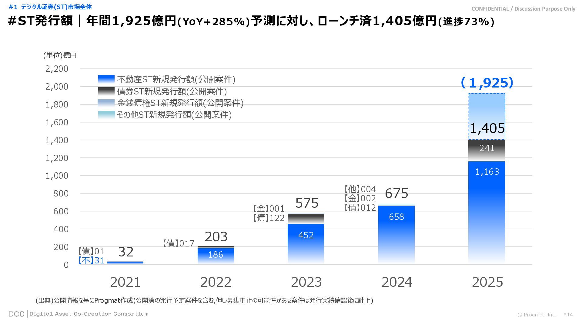 0 200 400 600 800 1,000 1,200 1,400 1,600 1,800 2,000 2,200 2,400 2,600 2,800 3,000 3,200 3,400 3,600 3,800 4,000 2021 2022 2023 2024 2025 【不】56 【債】01 【債】017 【債】122 【金】001 57 394 1,099 (単位)億円 不動産STファンド新規組成額(公開案件) 債券ST新規発行額(公開案件) 金銭債権STファンド新規組成額(公開案件) 【債】012 【金】002 1,278 その他STファンド新規組成額(公開案件) 【他】004 (3,700) 3,053 (出典)公開情報を基にProgmat作成(公開済の発行予定案件を含む,但し募集中止の可能性がある案件は発行実績確認後に計上) #13 #ST案件組成額|年間3,700億円(YoY+290%)予測に対し、ローンチ済3,053億円(進捗83%) © Progmat, Inc. #1 デジタル証券(ST)市場全体