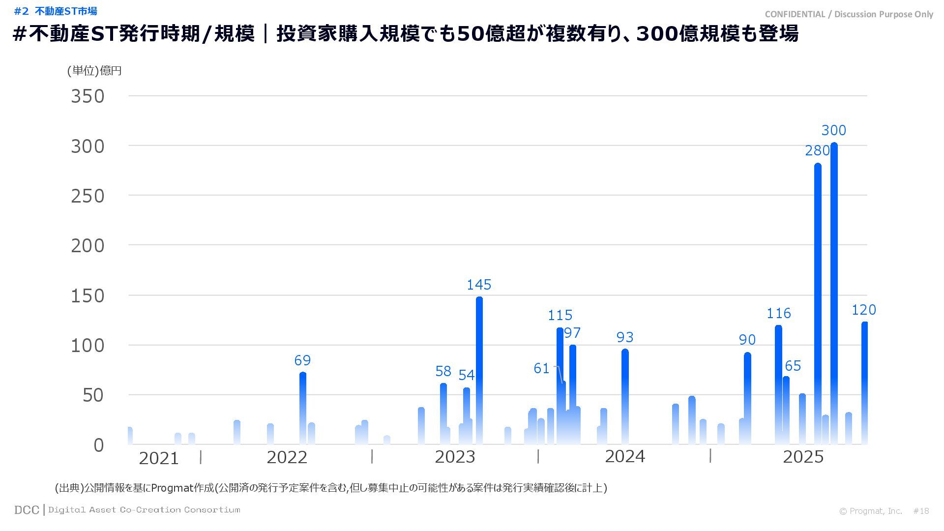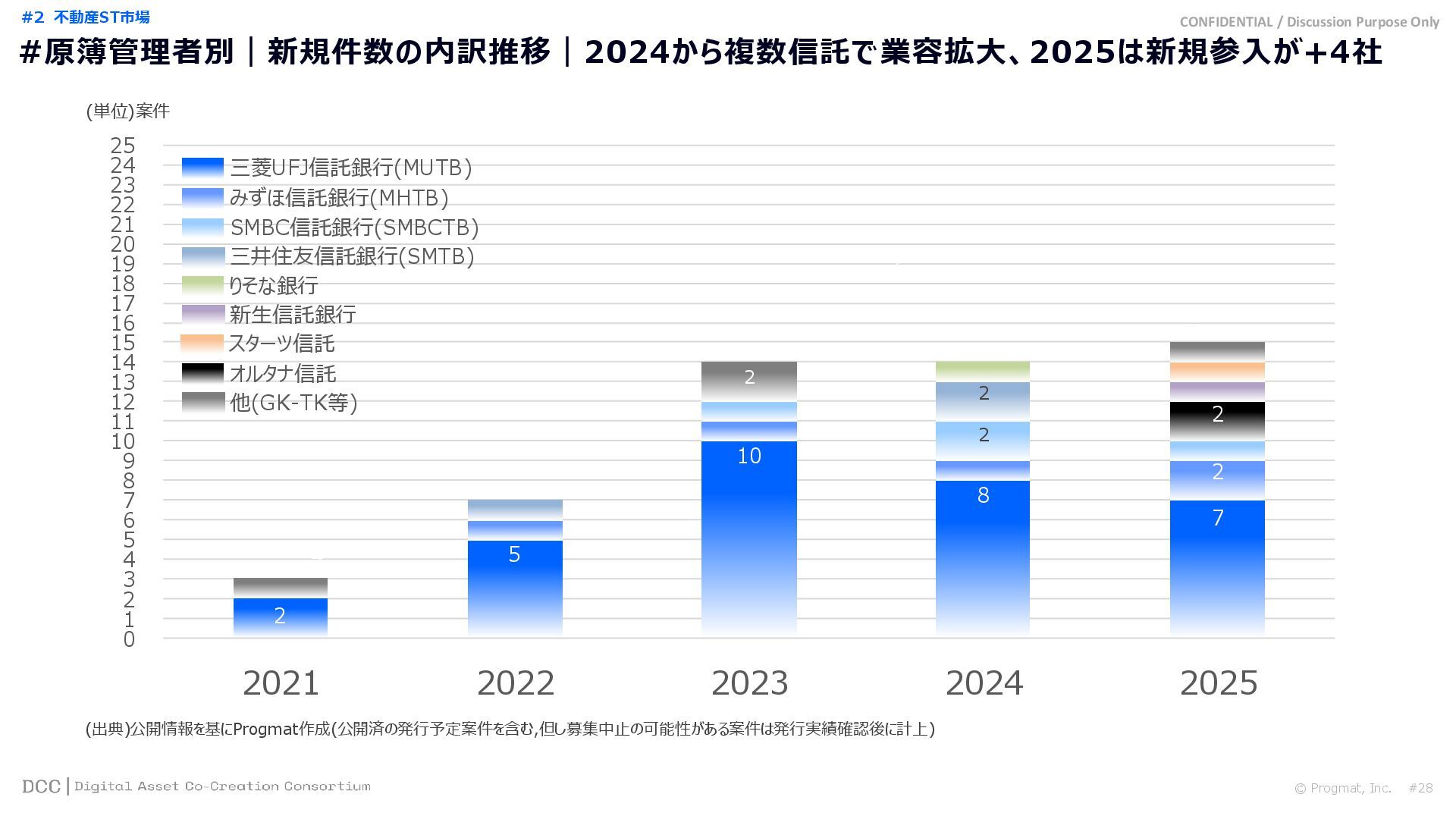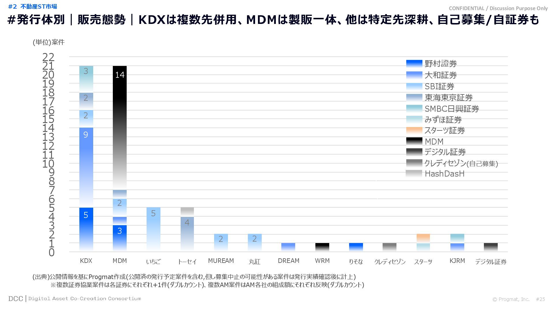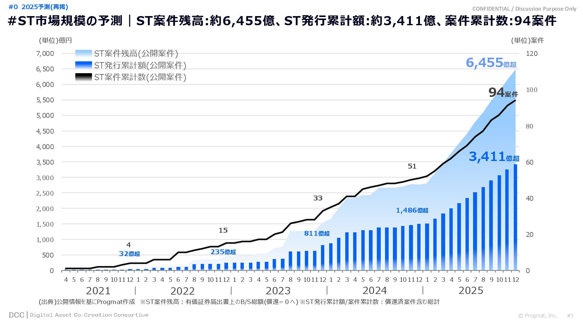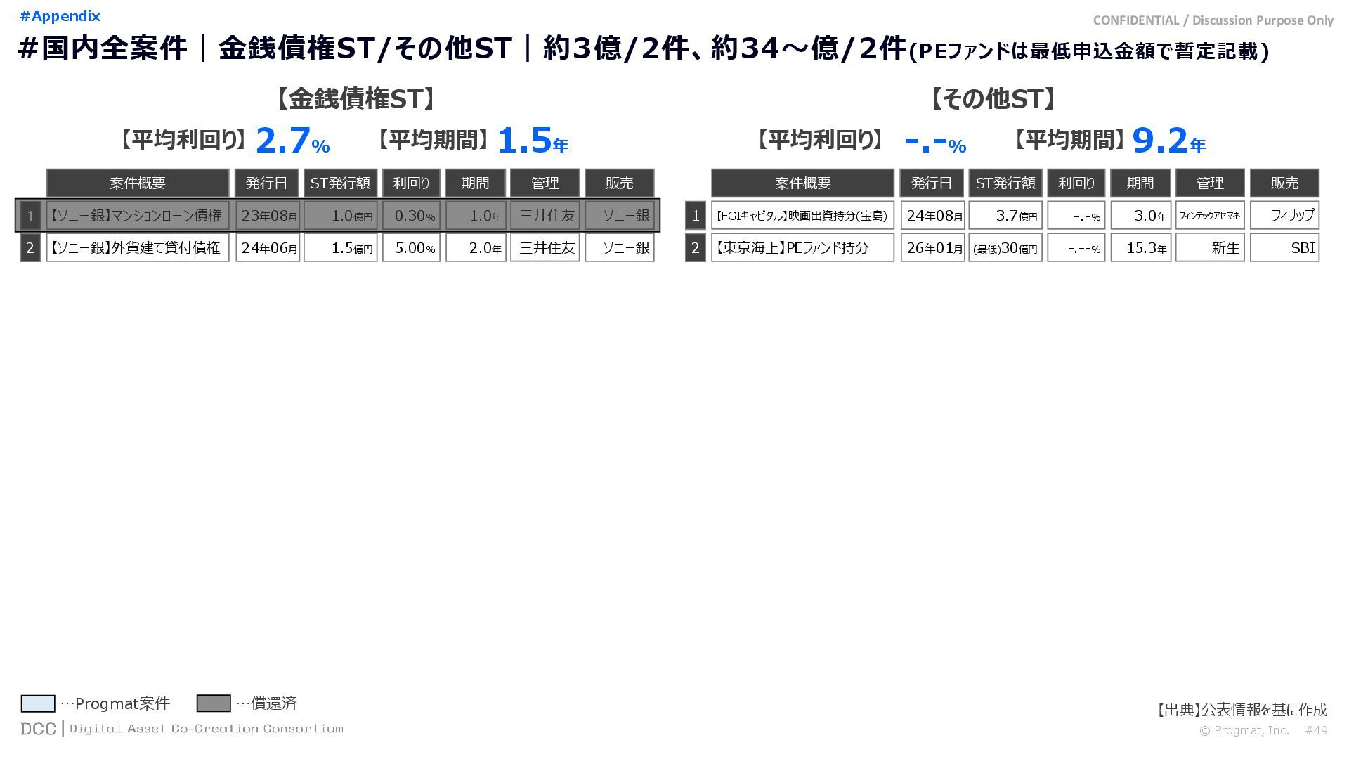 0 200 400 600 800 1,000 1,200 1,400 1,600 1,800 2,000 2,200 2,400 2,600 2,800 3,000 3,200 3,400 3,600 3,800 4,000 2021 2022 2023 2024 2025 【不】56 【債】01 【債】017 【債】122 【金】001 57 394 1,099 (単位)億円 不動産STファンド新規組成額(公開案件) 債券ST新規発行額(公開案件) 金銭債権STファンド新規組成額(公開案件) 【債】012 【金】002 1,278 その他STファンド新規組成額(公開案件) 【他】004 (3,700) 3,053 (出典)公開情報を基にProgmat作成(公開済の発行予定案件を含む,但し募集中止の可能性がある案件は発行実績確認後に計上) #13 #ST案件組成額|年間3,700億円(YoY+290%)予測に対し、ローンチ済3,053億円(進捗83%) © Progmat, Inc. #1 デジタル証券(ST)市場全体