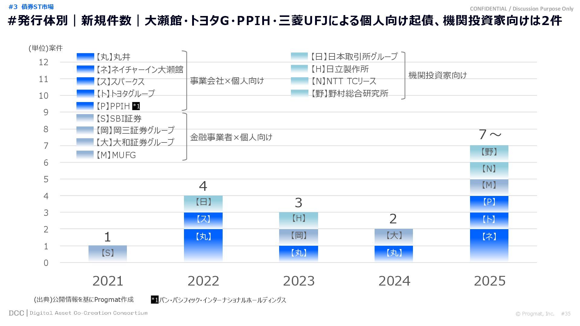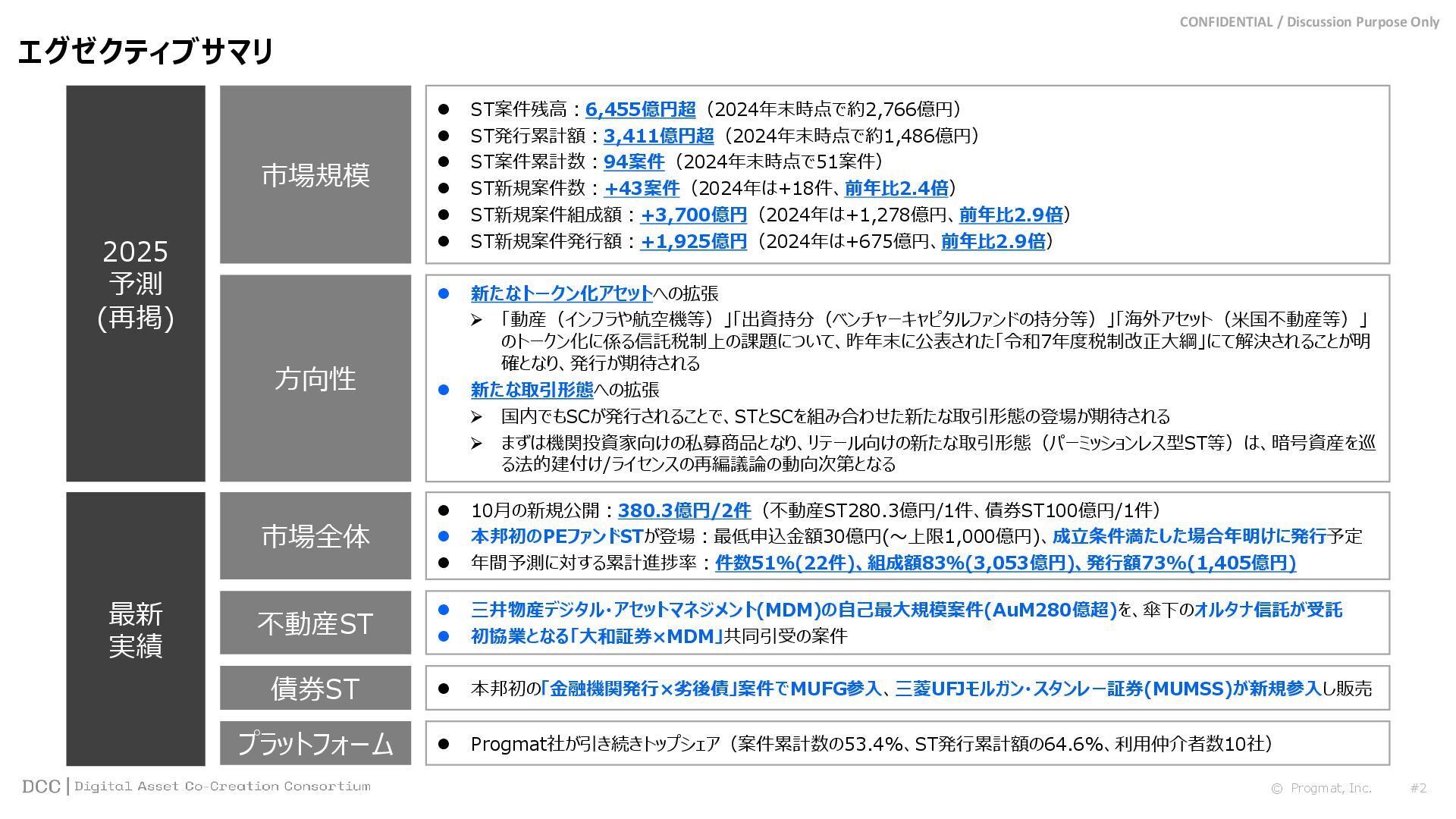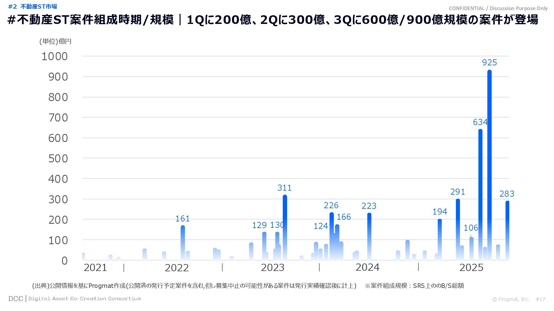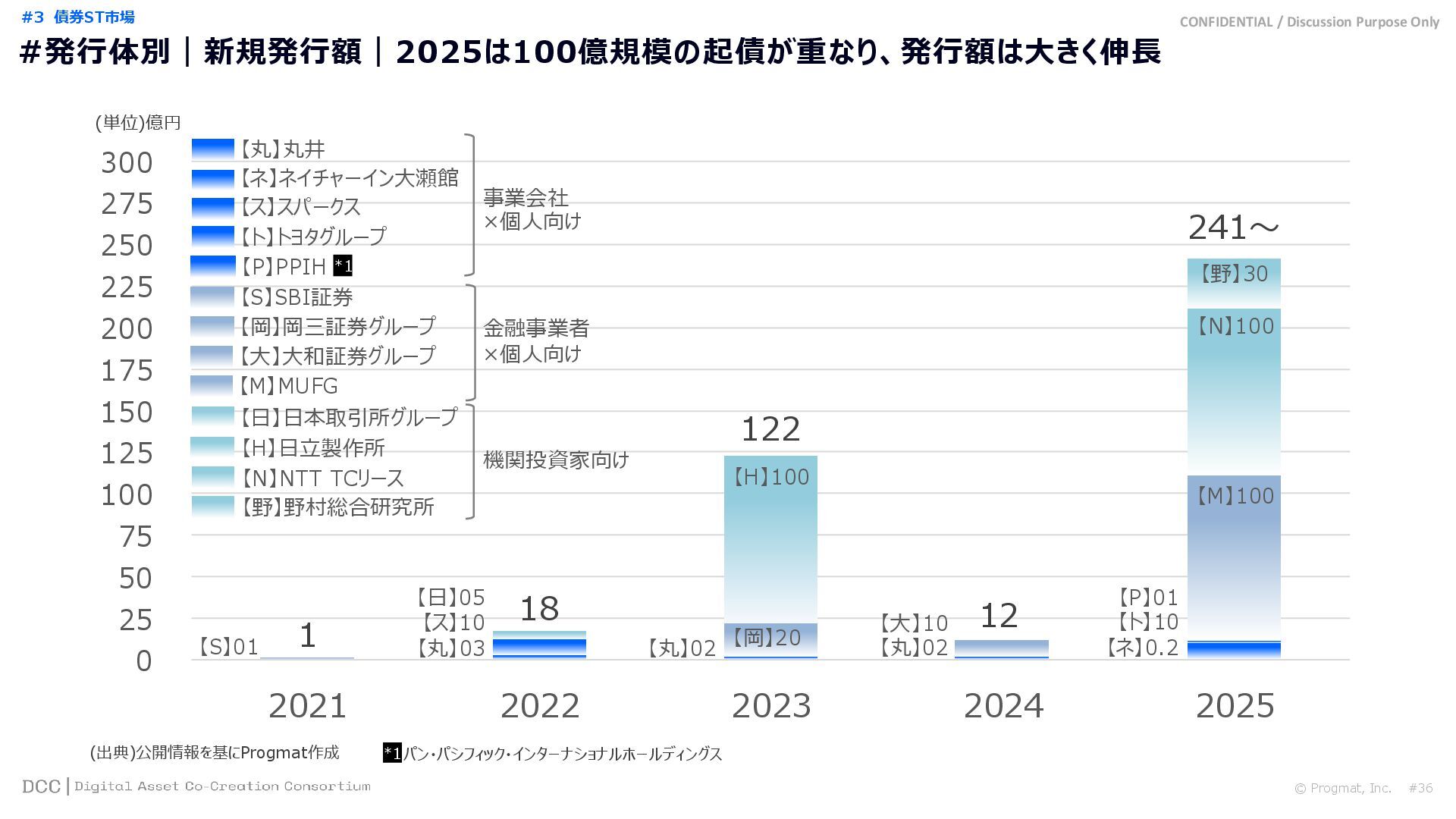 0 200 400 600 800 1,000 1,200 1,400 1,600 1,800 2,000 2,200 2,400 2,600 2,800 3,000 3,200 3,400 3,600 3,800 4,000 2021 2022 2023 2024 2025 【不】56 【債】01 【債】017 【債】122 【金】001 57 394 1,099 (単位)億円 不動産STファンド新規組成額(公開案件) 債券ST新規発行額(公開案件) 金銭債権STファンド新規組成額(公開案件) 【債】012 【金】002 1,278 その他STファンド新規組成額(公開案件) 【他】004 (3,700) 3,053 (出典)公開情報を基にProgmat作成(公開済の発行予定案件を含む,但し募集中止の可能性がある案件は発行実績確認後に計上) #13 #ST案件組成額|年間3,700億円(YoY+290%)予測に対し、ローンチ済3,053億円(進捗83%) © Progmat, Inc. #1 デジタル証券(ST)市場全体