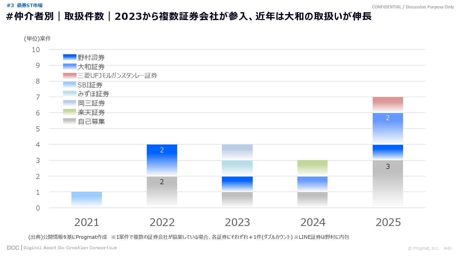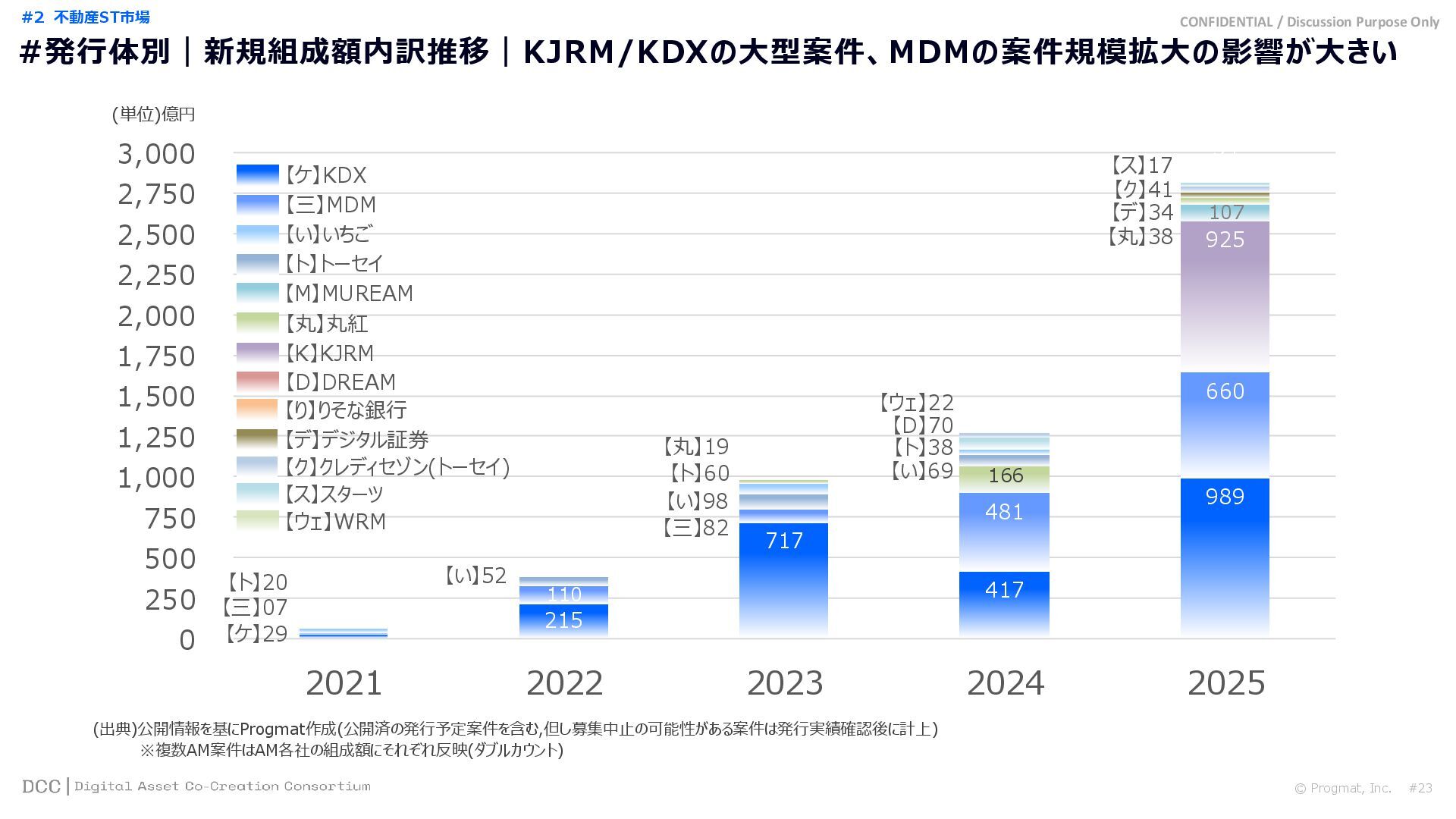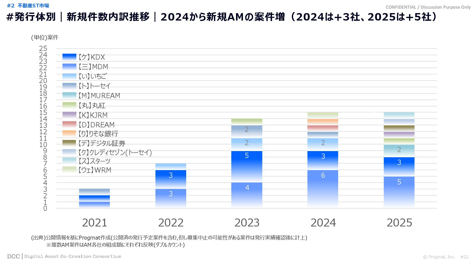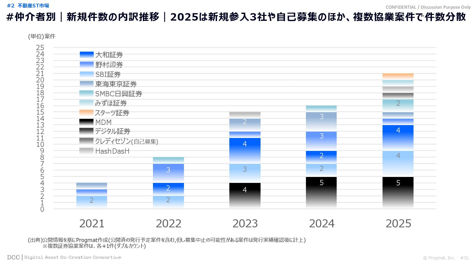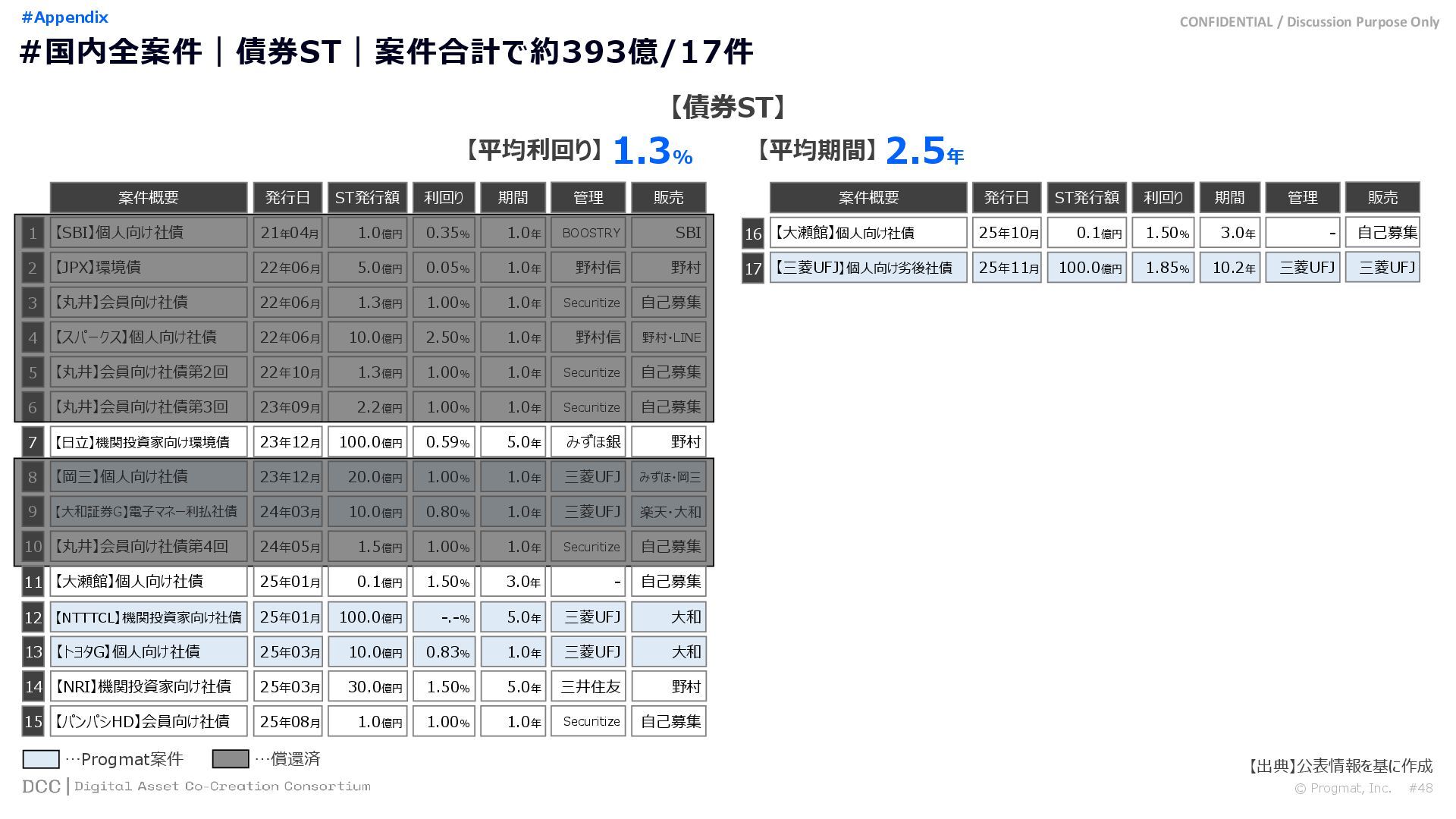 0 200 400 600 800 1,000 1,200 1,400 1,600 1,800 2,000 2,200 2,400 2,600 2,800 3,000 3,200 3,400 3,600 3,800 4,000 2021 2022 2023 2024 2025 【不】56 【債】01 【債】017 【債】122 【金】001 57 394 1,099 (単位)億円 不動産STファンド新規組成額(公開案件) 債券ST新規発行額(公開案件) 金銭債権STファンド新規組成額(公開案件) 【債】012 【金】002 1,278 その他STファンド新規組成額(公開案件) 【他】004 (3,700) 3,053 (出典)公開情報を基にProgmat作成(公開済の発行予定案件を含む,但し募集中止の可能性がある案件は発行実績確認後に計上) #13 #ST案件組成額|年間3,700億円(YoY+290%)予測に対し、ローンチ済3,053億円(進捗83%) © Progmat, Inc. #1 デジタル証券(ST)市場全体