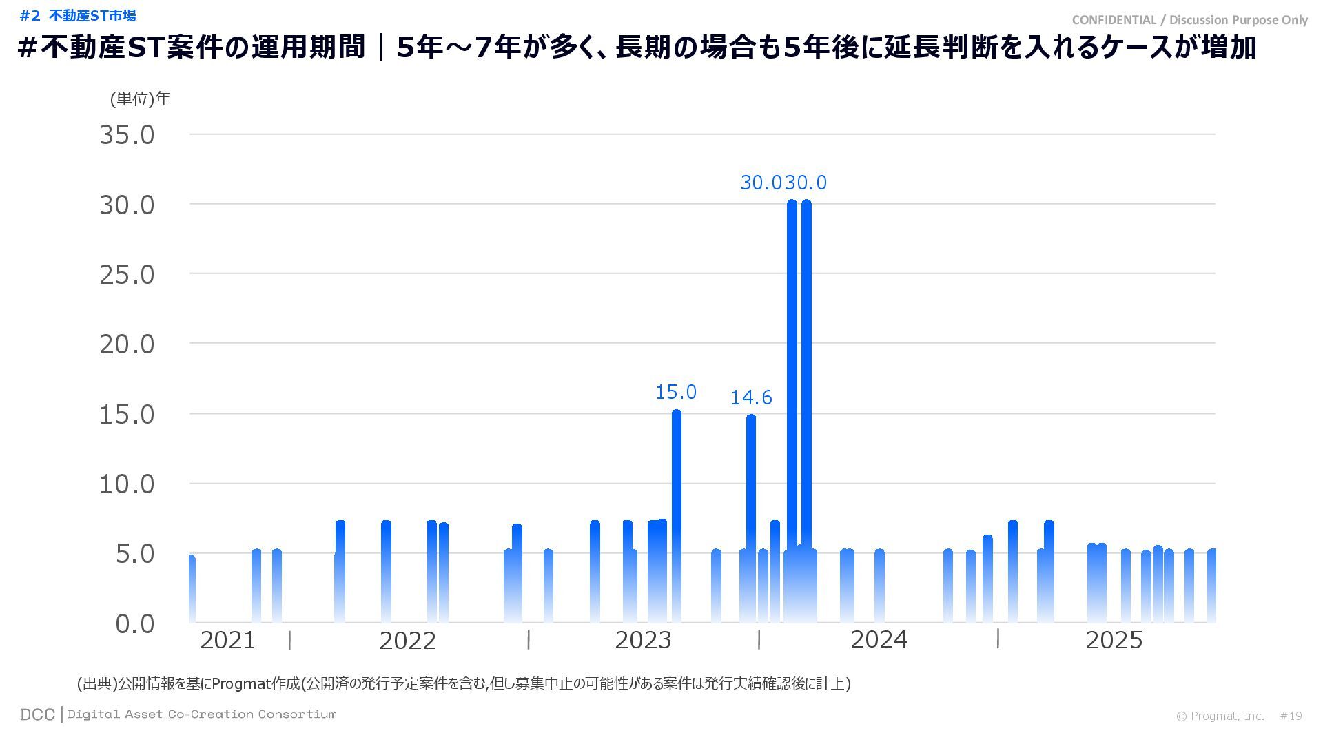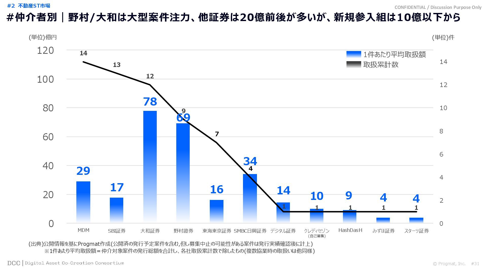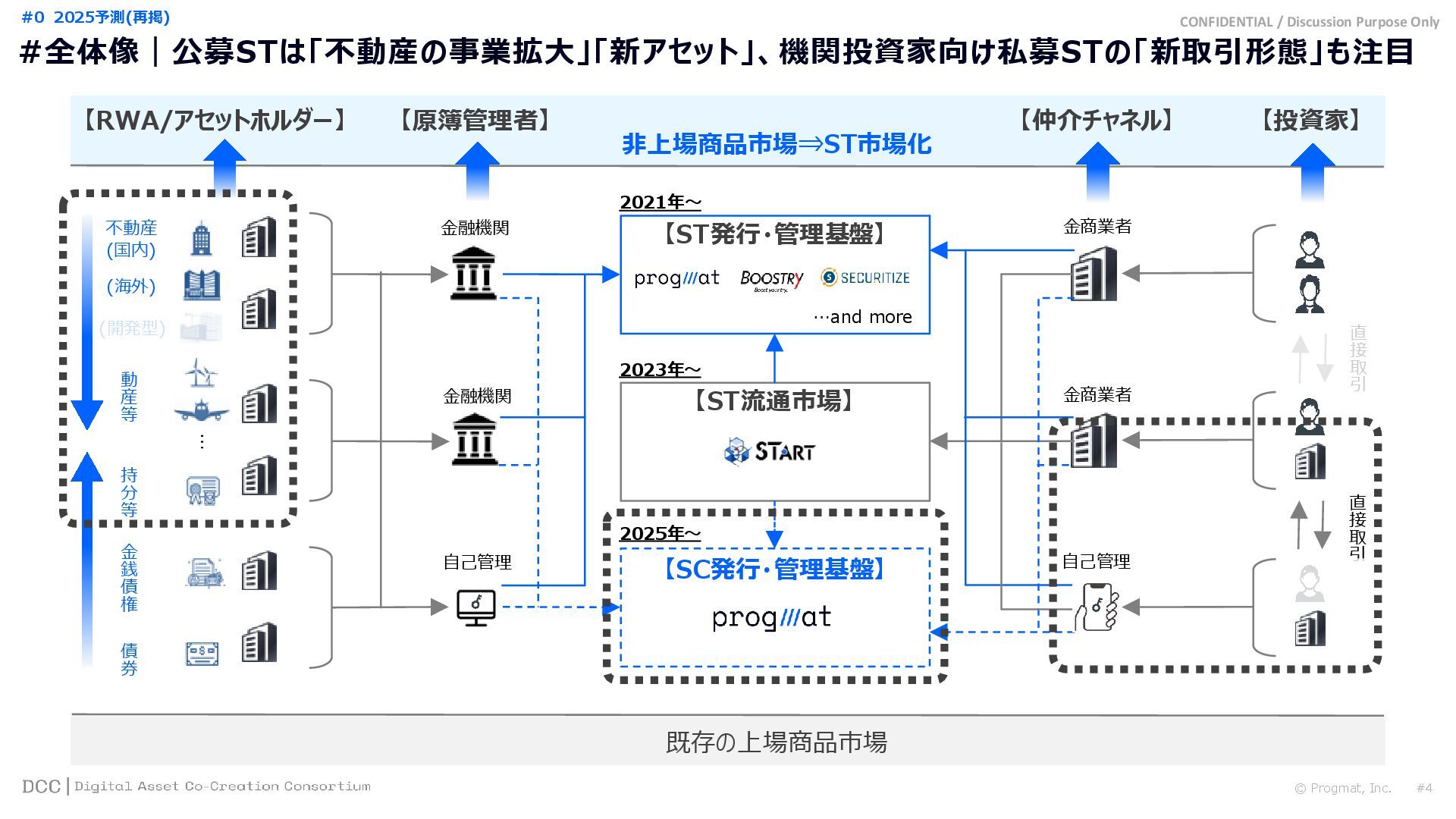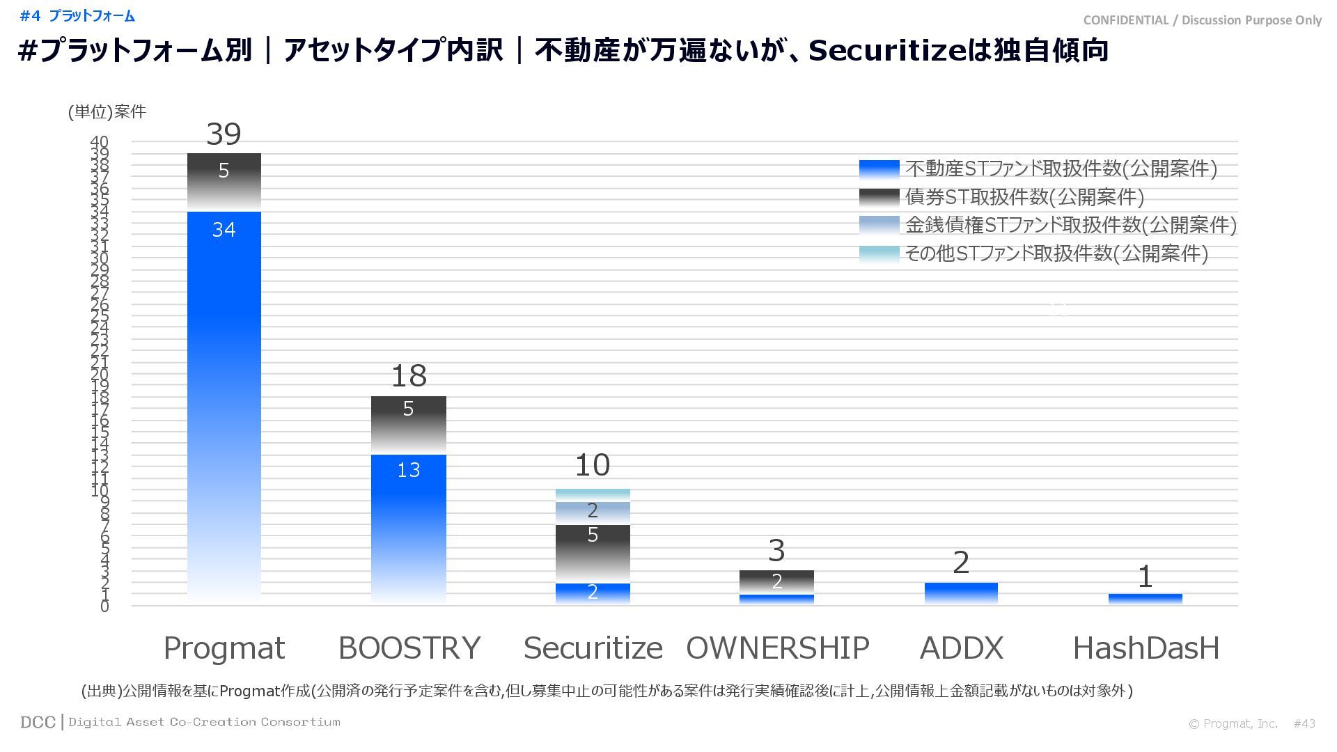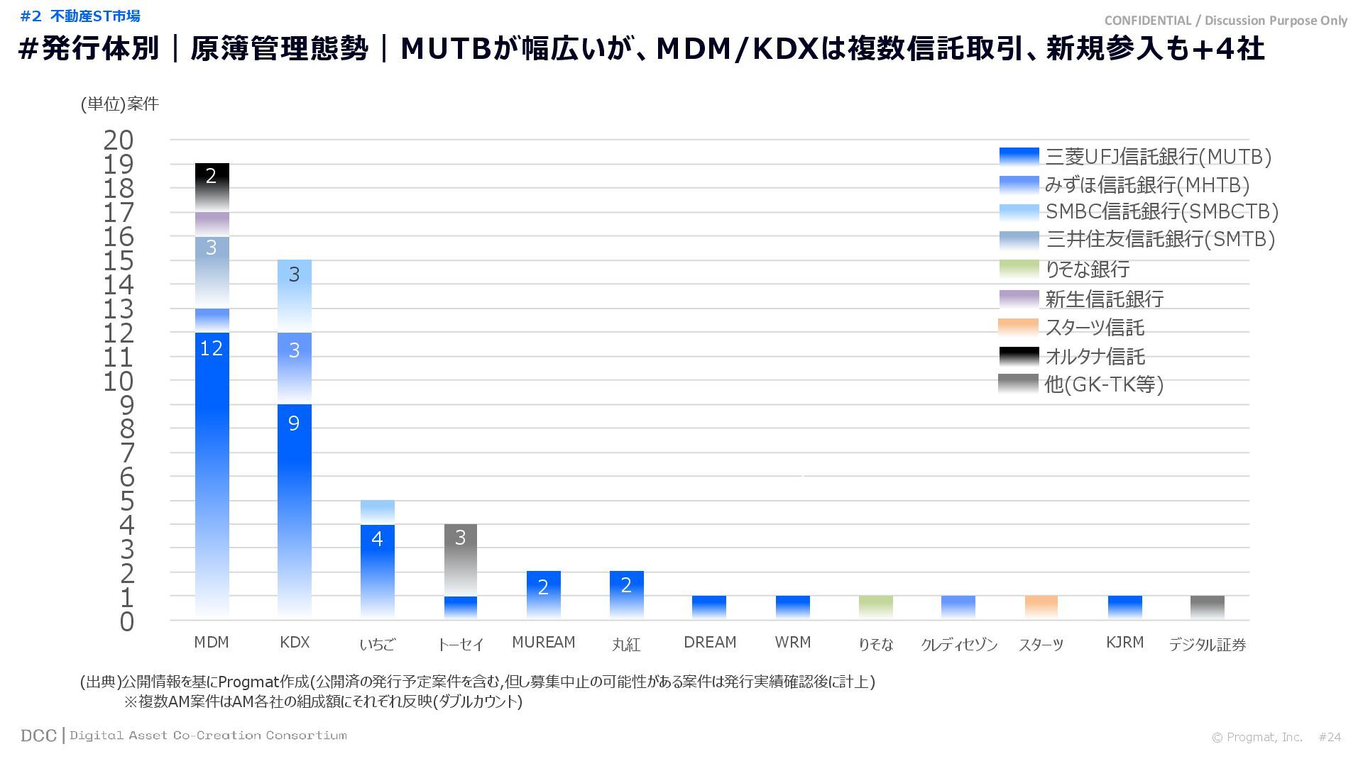 0 200 400 600 800 1,000 1,200 1,400 1,600 1,800 2,000 2,200 2,400 2,600 2,800 3,000 3,200 3,400 3,600 3,800 4,000 2021 2022 2023 2024 2025 【不】56 【債】01 【債】017 【債】122 【金】001 57 394 1,099 (単位)億円 不動産STファンド新規組成額(公開案件) 債券ST新規発行額(公開案件) 金銭債権STファンド新規組成額(公開案件) 【債】012 【金】002 1,278 その他STファンド新規組成額(公開案件) 【他】004 (3,700) 3,053 (出典)公開情報を基にProgmat作成(公開済の発行予定案件を含む,但し募集中止の可能性がある案件は発行実績確認後に計上) #13 #ST案件組成額|年間3,700億円(YoY+290%)予測に対し、ローンチ済3,053億円(進捗83%) © Progmat, Inc. #1 デジタル証券(ST)市場全体