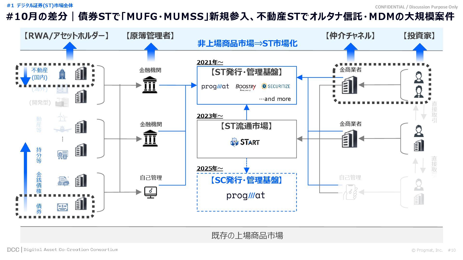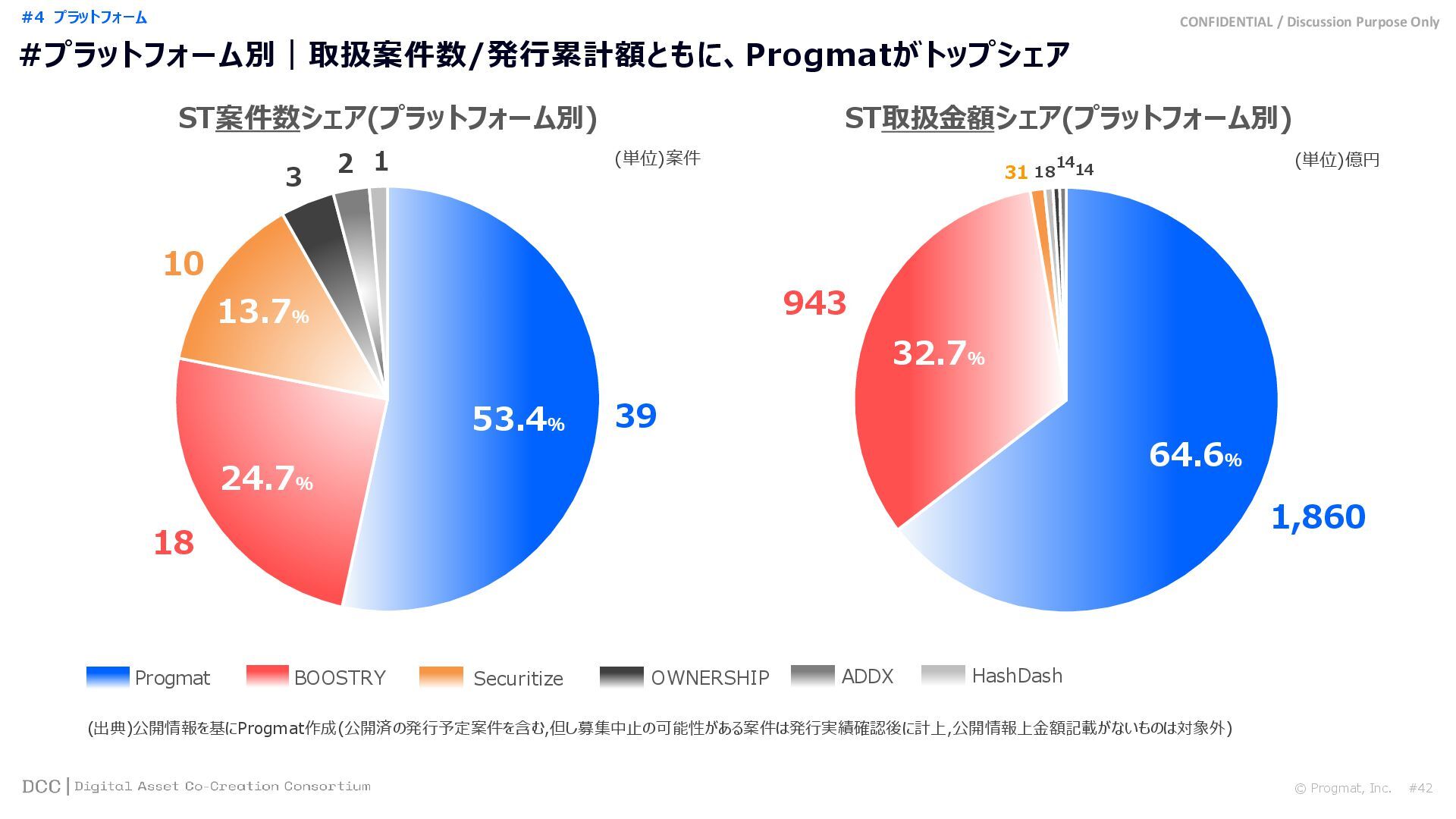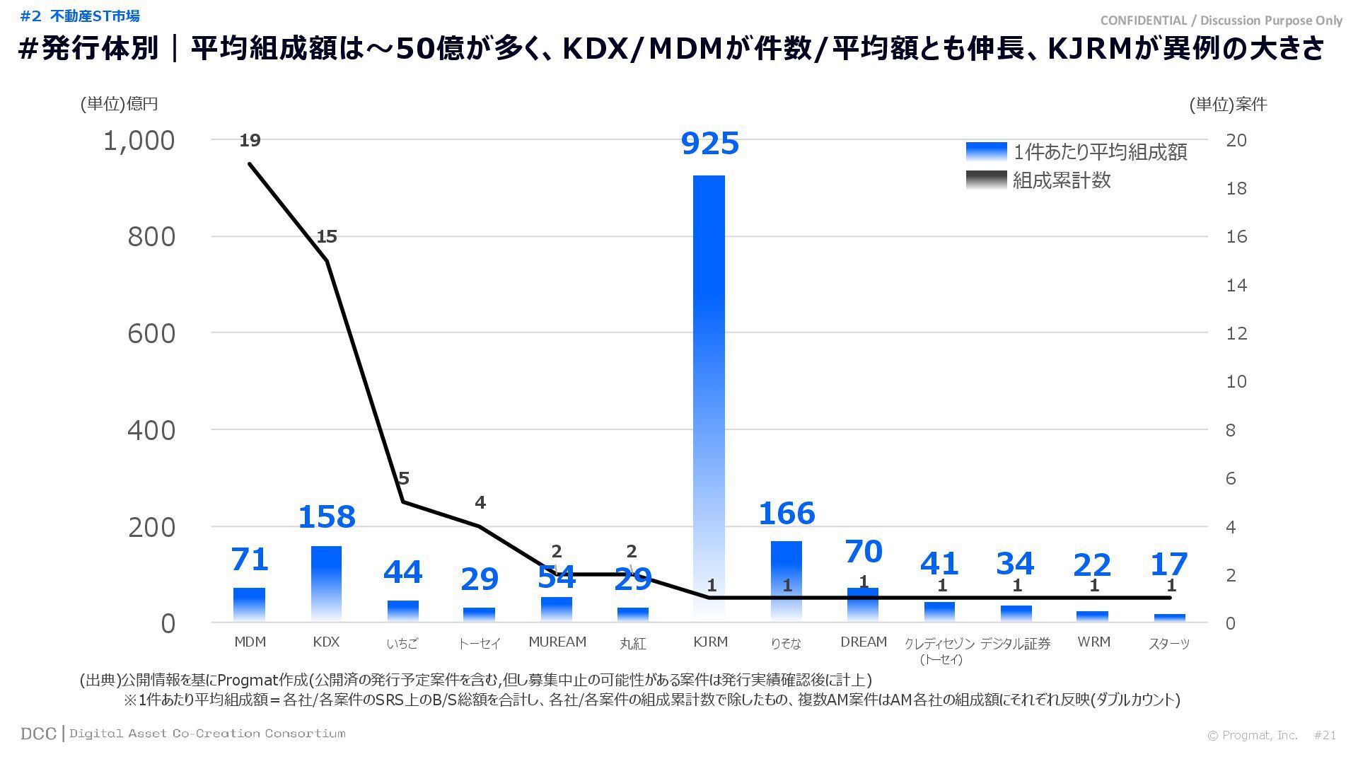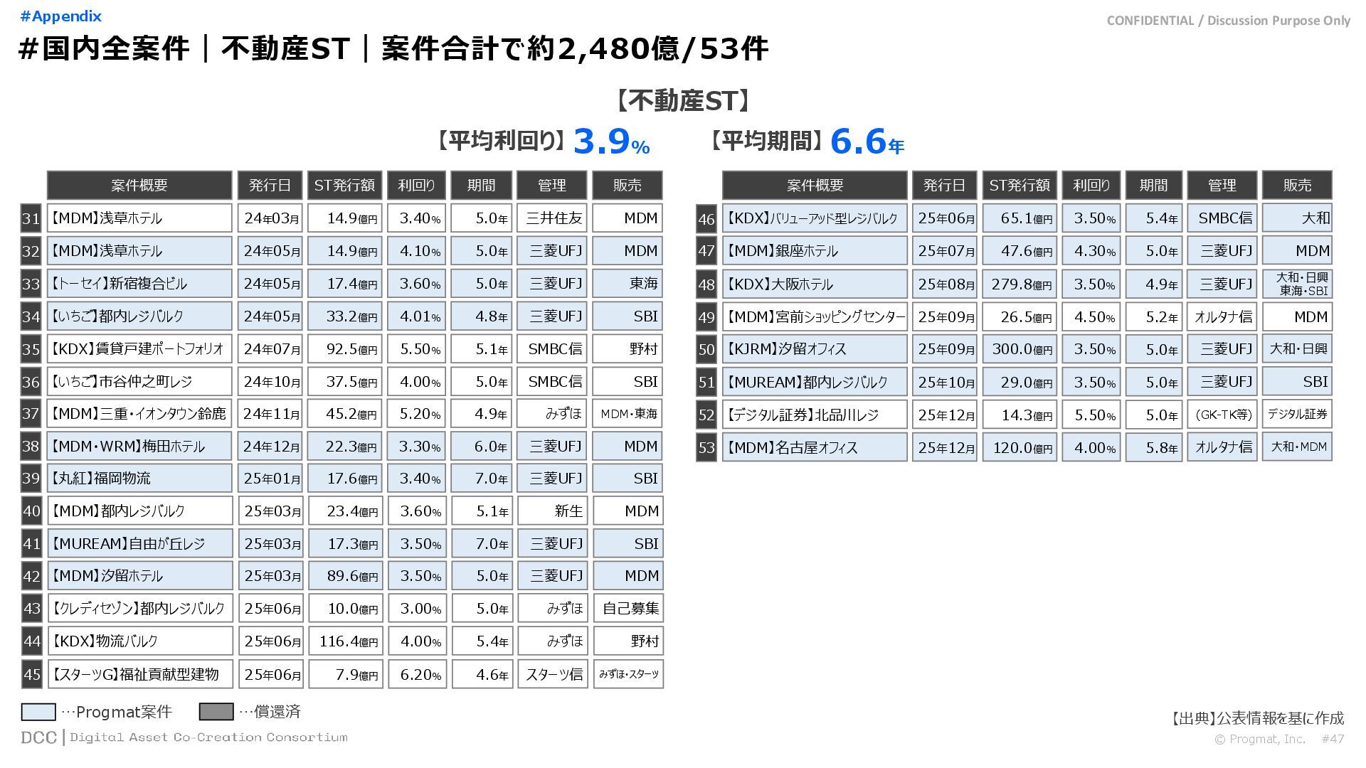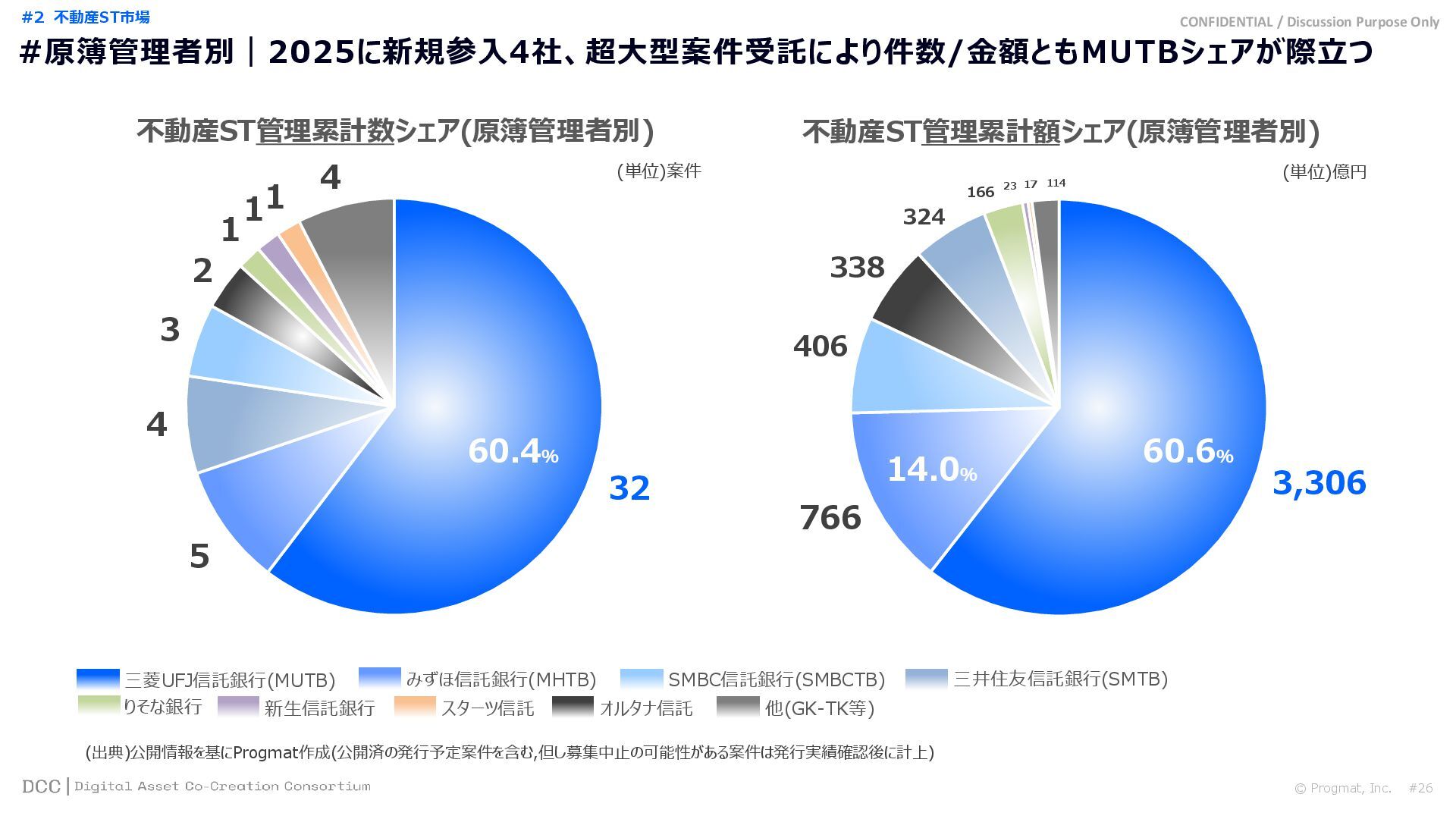 0 200 400 600 800 1,000 1,200 1,400 1,600 1,800 2,000 2,200 2,400 2,600 2,800 3,000 3,200 3,400 3,600 3,800 4,000 2021 2022 2023 2024 2025 【不】56 【債】01 【債】017 【債】122 【金】001 57 394 1,099 (単位)億円 不動産STファンド新規組成額(公開案件) 債券ST新規発行額(公開案件) 金銭債権STファンド新規組成額(公開案件) 【債】012 【金】002 1,278 その他STファンド新規組成額(公開案件) 【他】004 (3,700) 3,053 (出典)公開情報を基にProgmat作成(公開済の発行予定案件を含む,但し募集中止の可能性がある案件は発行実績確認後に計上) #13 #ST案件組成額|年間3,700億円(YoY+290%)予測に対し、ローンチ済3,053億円(進捗83%) © Progmat, Inc. #1 デジタル証券(ST)市場全体