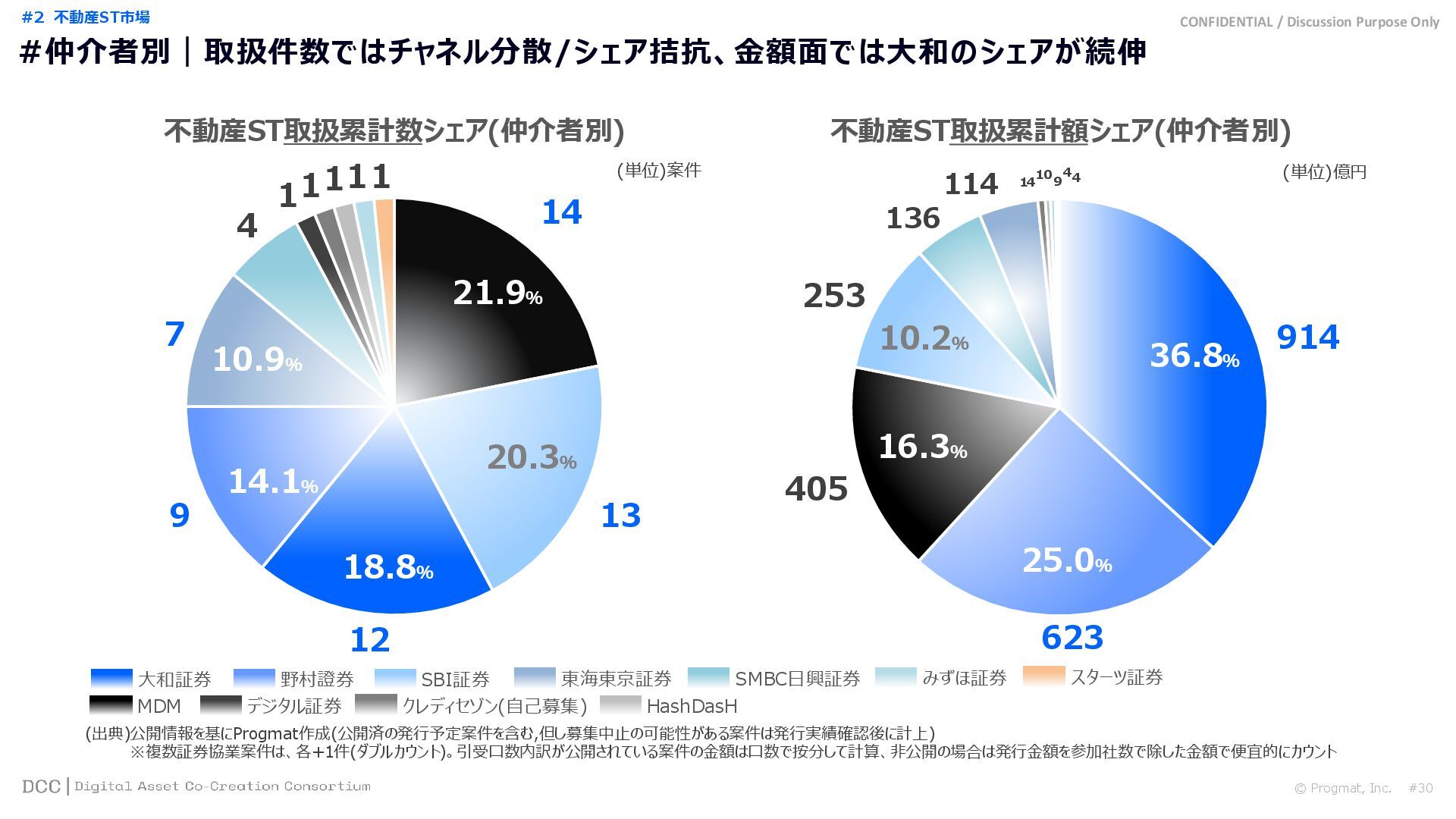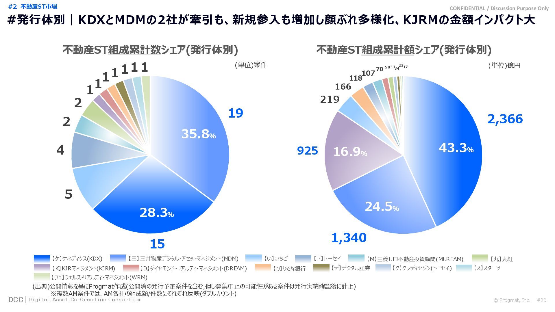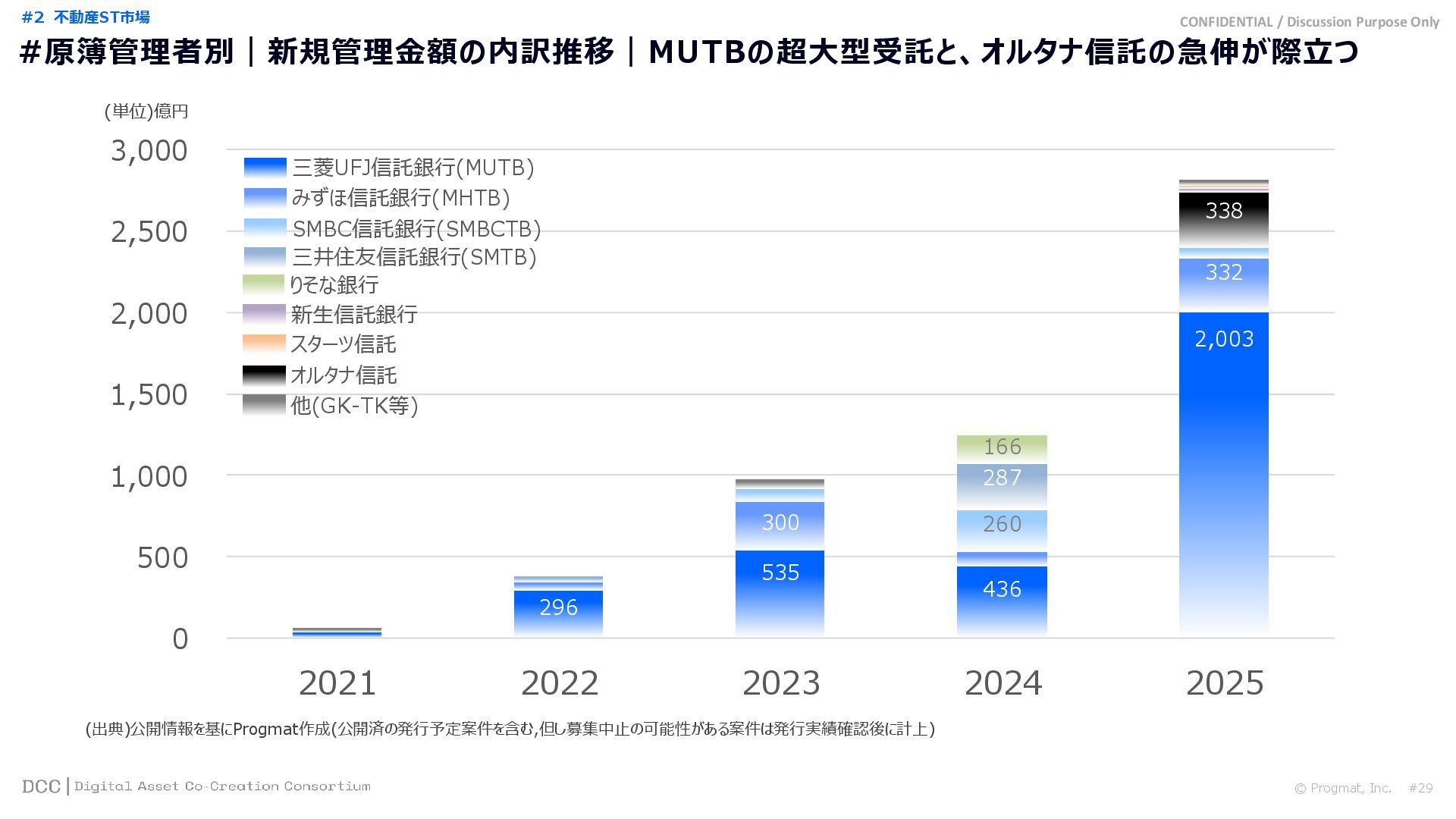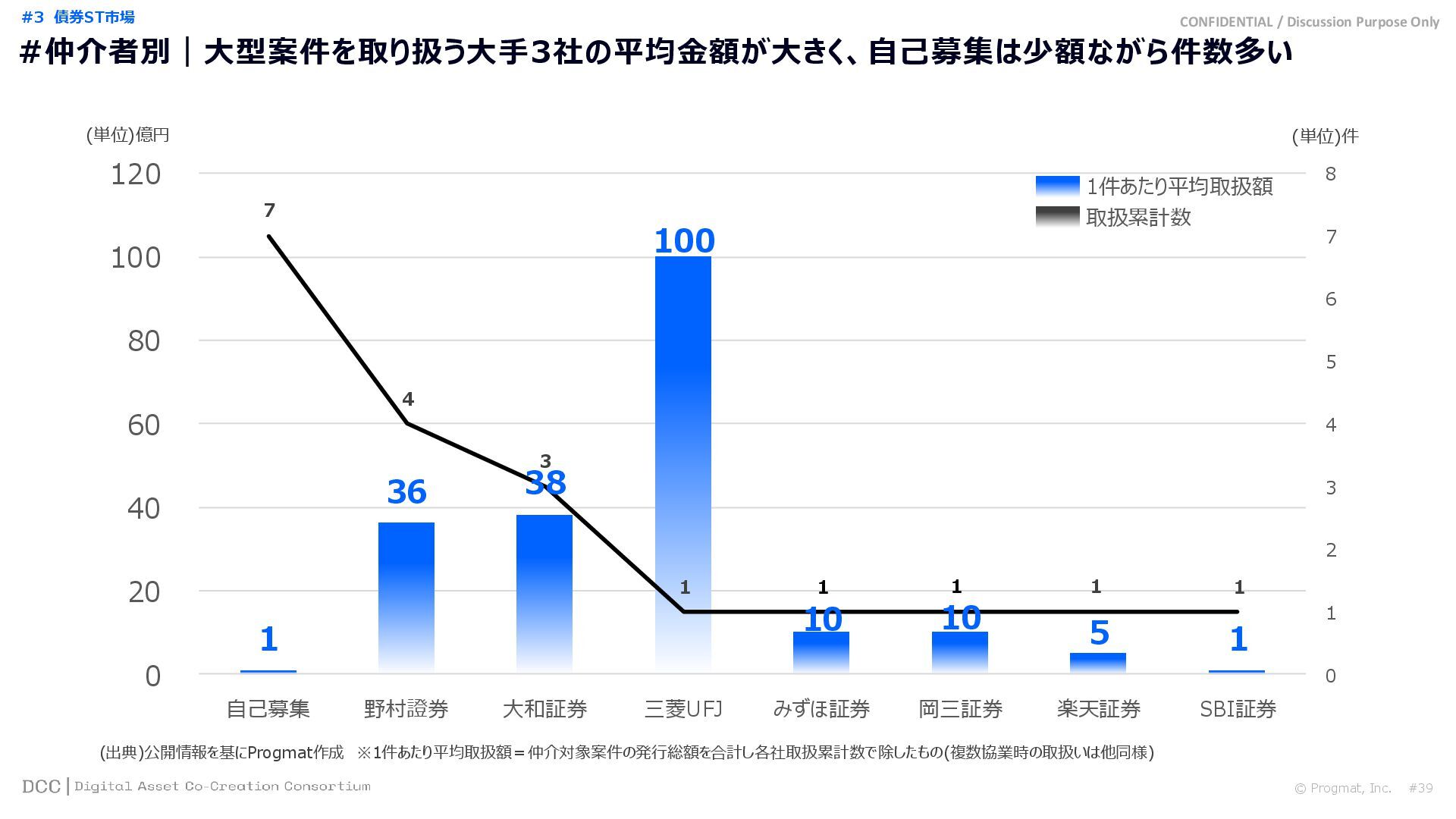 0 200 400 600 800 1,000 1,200 1,400 1,600 1,800 2,000 2,200 2,400 2,600 2,800 3,000 3,200 3,400 3,600 3,800 4,000 2021 2022 2023 2024 2025 【不】56 【債】01 【債】017 【債】122 【金】001 57 394 1,099 (単位)億円 不動産STファンド新規組成額(公開案件) 債券ST新規発行額(公開案件) 金銭債権STファンド新規組成額(公開案件) 【債】012 【金】002 1,278 その他STファンド新規組成額(公開案件) 【他】004 (3,700) 3,053 (出典)公開情報を基にProgmat作成(公開済の発行予定案件を含む,但し募集中止の可能性がある案件は発行実績確認後に計上) #13 #ST案件組成額|年間3,700億円(YoY+290%)予測に対し、ローンチ済3,053億円(進捗83%) © Progmat, Inc. #1 デジタル証券(ST)市場全体