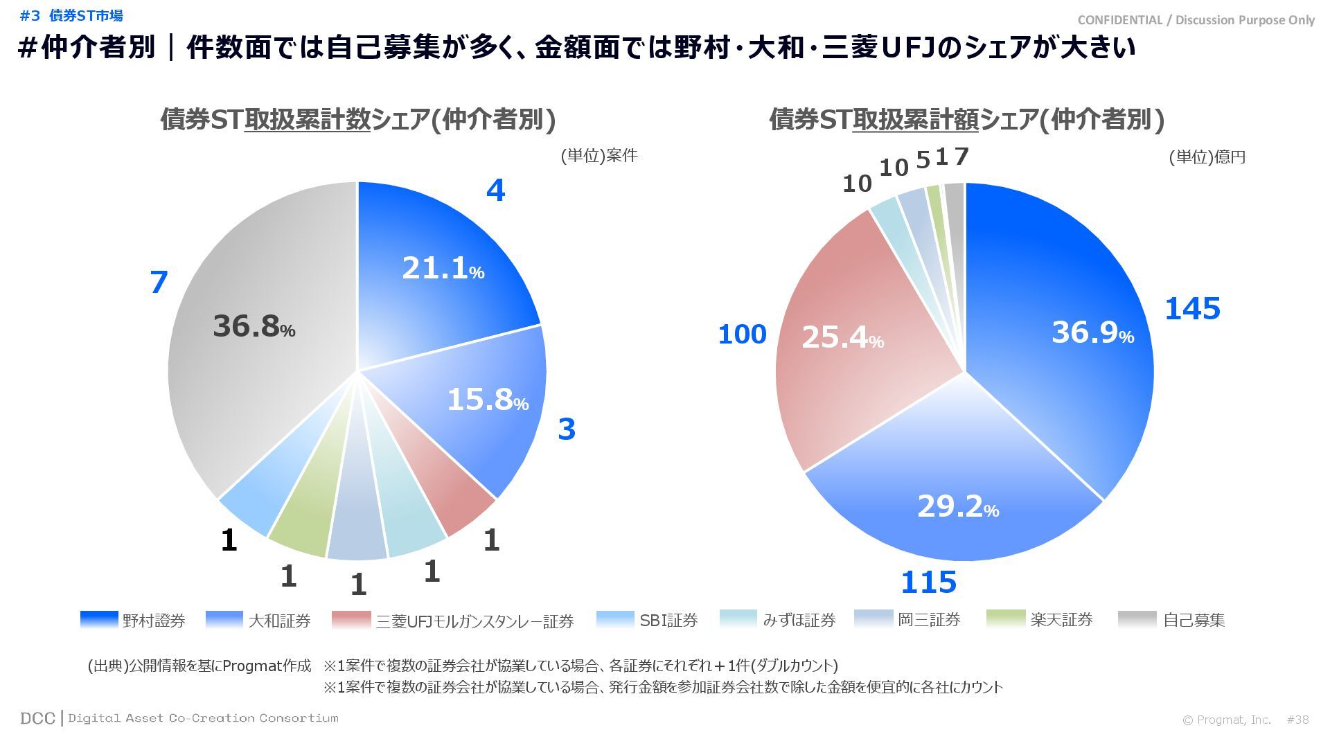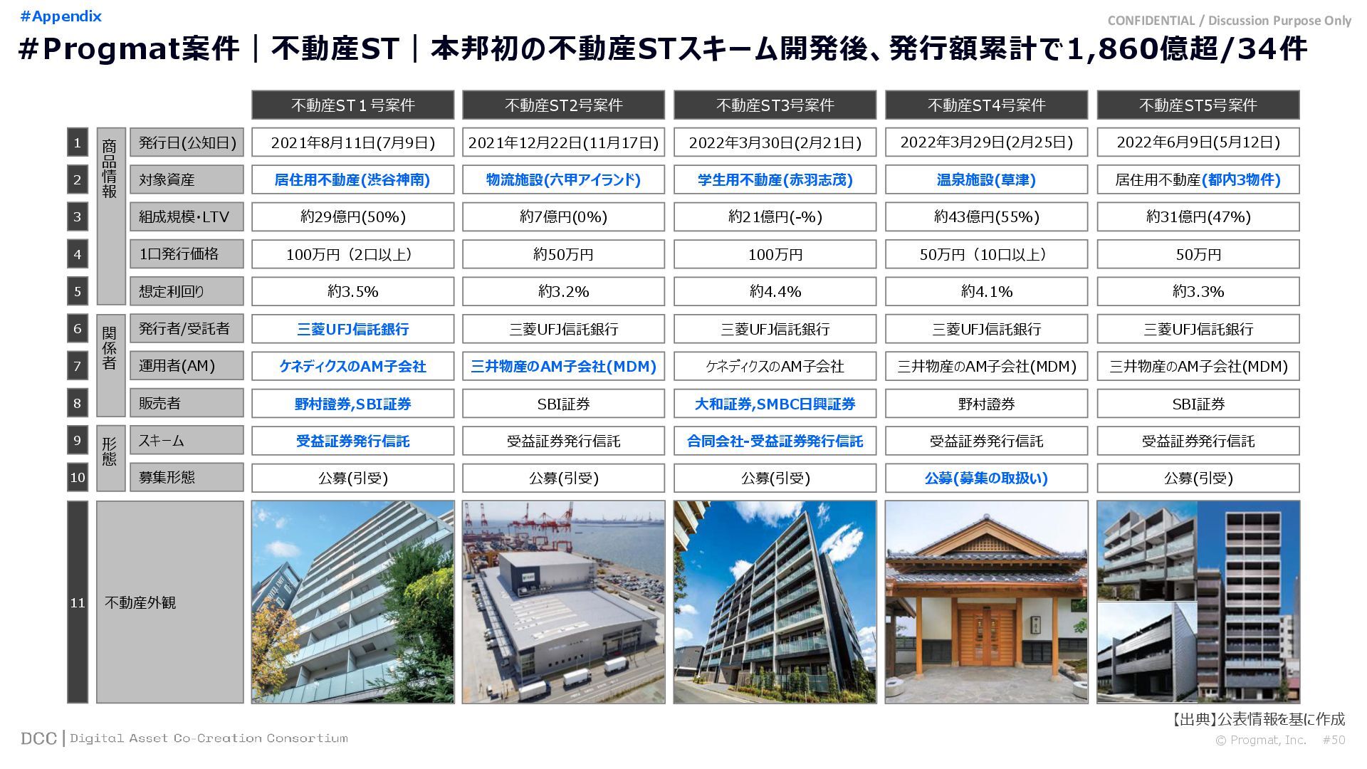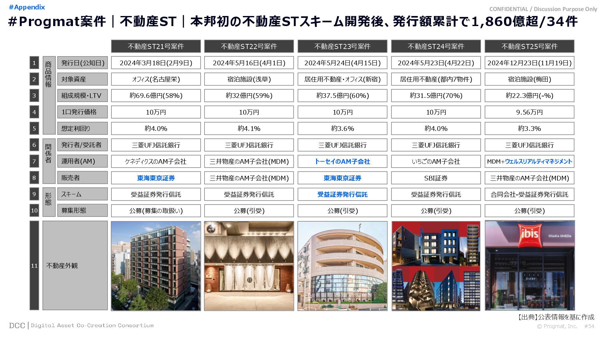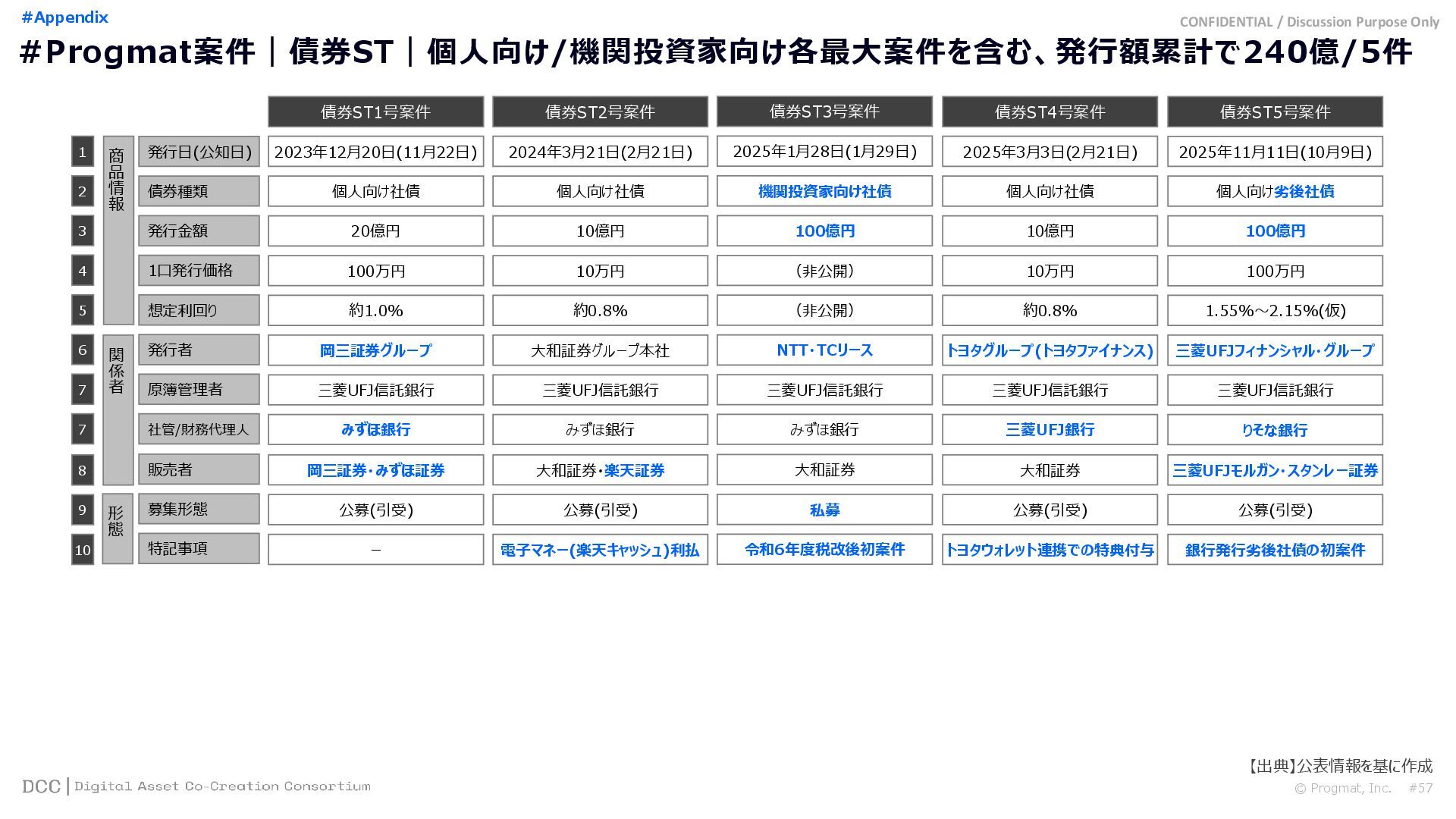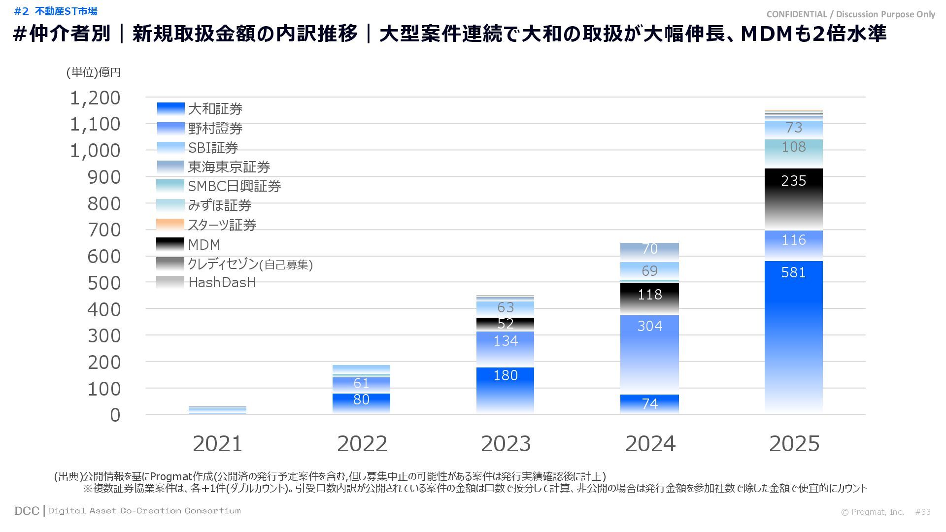 0 200 400 600 800 1,000 1,200 1,400 1,600 1,800 2,000 2,200 2,400 2,600 2,800 3,000 3,200 3,400 3,600 3,800 4,000 2021 2022 2023 2024 2025 【不】56 【債】01 【債】017 【債】122 【金】001 57 394 1,099 (単位)億円 不動産STファンド新規組成額(公開案件) 債券ST新規発行額(公開案件) 金銭債権STファンド新規組成額(公開案件) 【債】012 【金】002 1,278 その他STファンド新規組成額(公開案件) 【他】004 (3,700) 3,053 (出典)公開情報を基にProgmat作成(公開済の発行予定案件を含む,但し募集中止の可能性がある案件は発行実績確認後に計上) #13 #ST案件組成額|年間3,700億円(YoY+290%)予測に対し、ローンチ済3,053億円(進捗83%) © Progmat, Inc. #1 デジタル証券(ST)市場全体