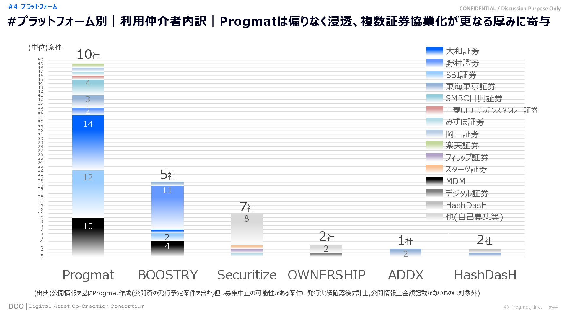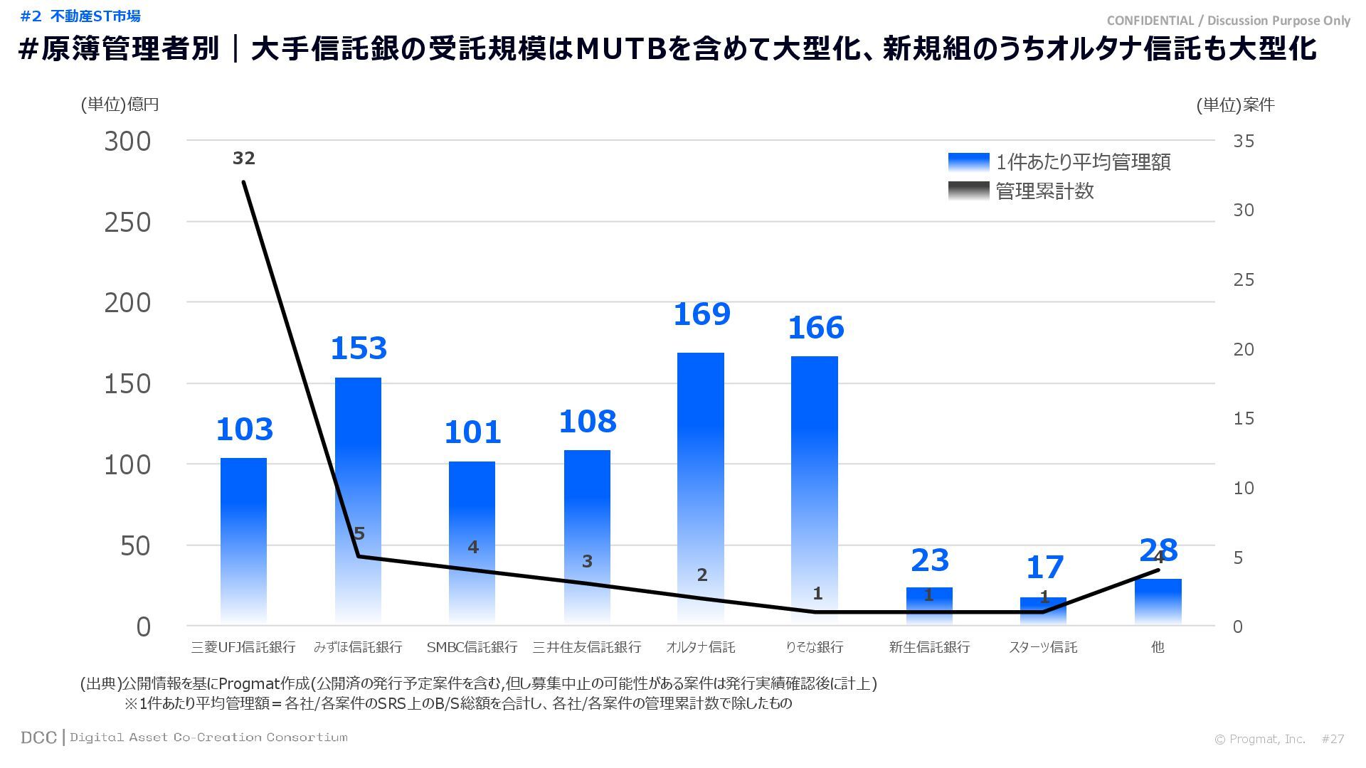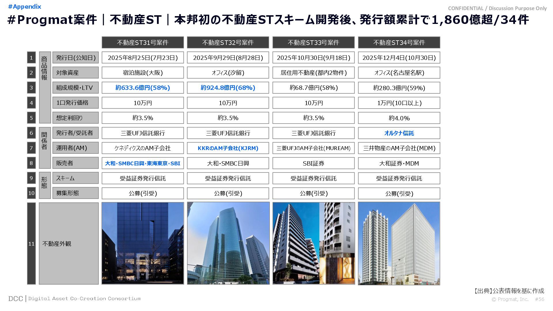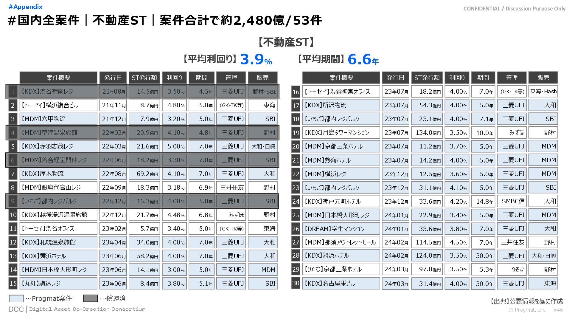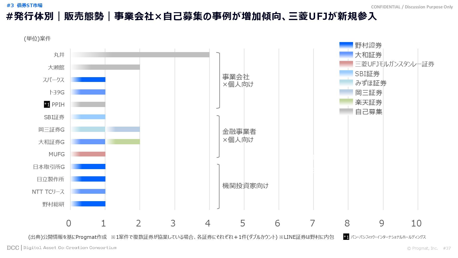 0 200 400 600 800 1,000 1,200 1,400 1,600 1,800 2,000 2,200 2,400 2,600 2,800 3,000 3,200 3,400 3,600 3,800 4,000 2021 2022 2023 2024 2025 【不】56 【債】01 【債】017 【債】122 【金】001 57 394 1,099 (単位)億円 不動産STファンド新規組成額(公開案件) 債券ST新規発行額(公開案件) 金銭債権STファンド新規組成額(公開案件) 【債】012 【金】002 1,278 その他STファンド新規組成額(公開案件) 【他】004 (3,700) 3,053 (出典)公開情報を基にProgmat作成(公開済の発行予定案件を含む,但し募集中止の可能性がある案件は発行実績確認後に計上) #13 #ST案件組成額|年間3,700億円(YoY+290%)予測に対し、ローンチ済3,053億円(進捗83%) © Progmat, Inc. #1 デジタル証券(ST)市場全体