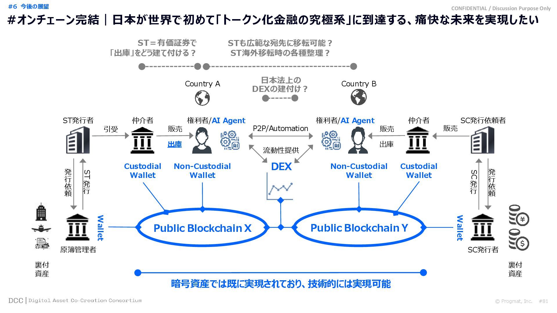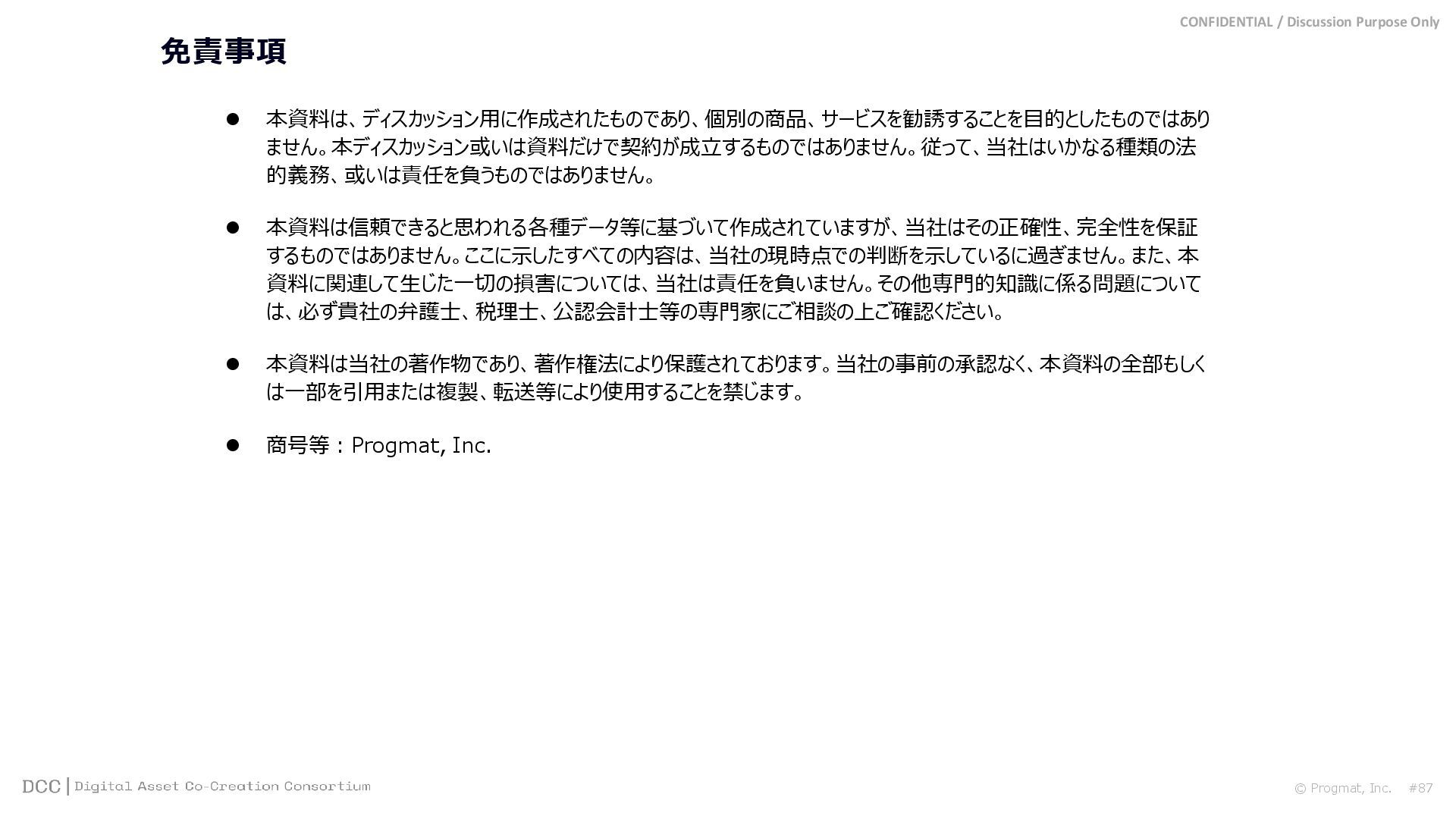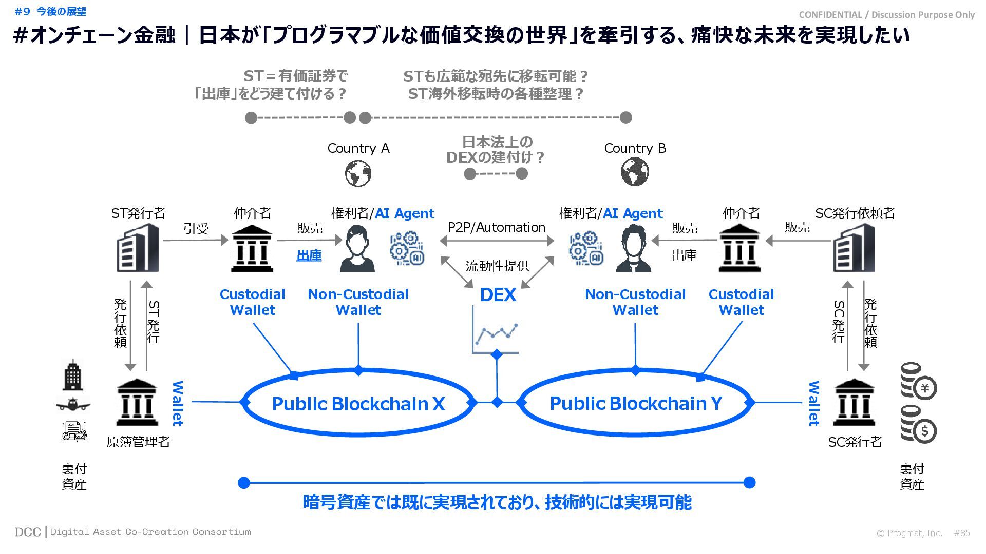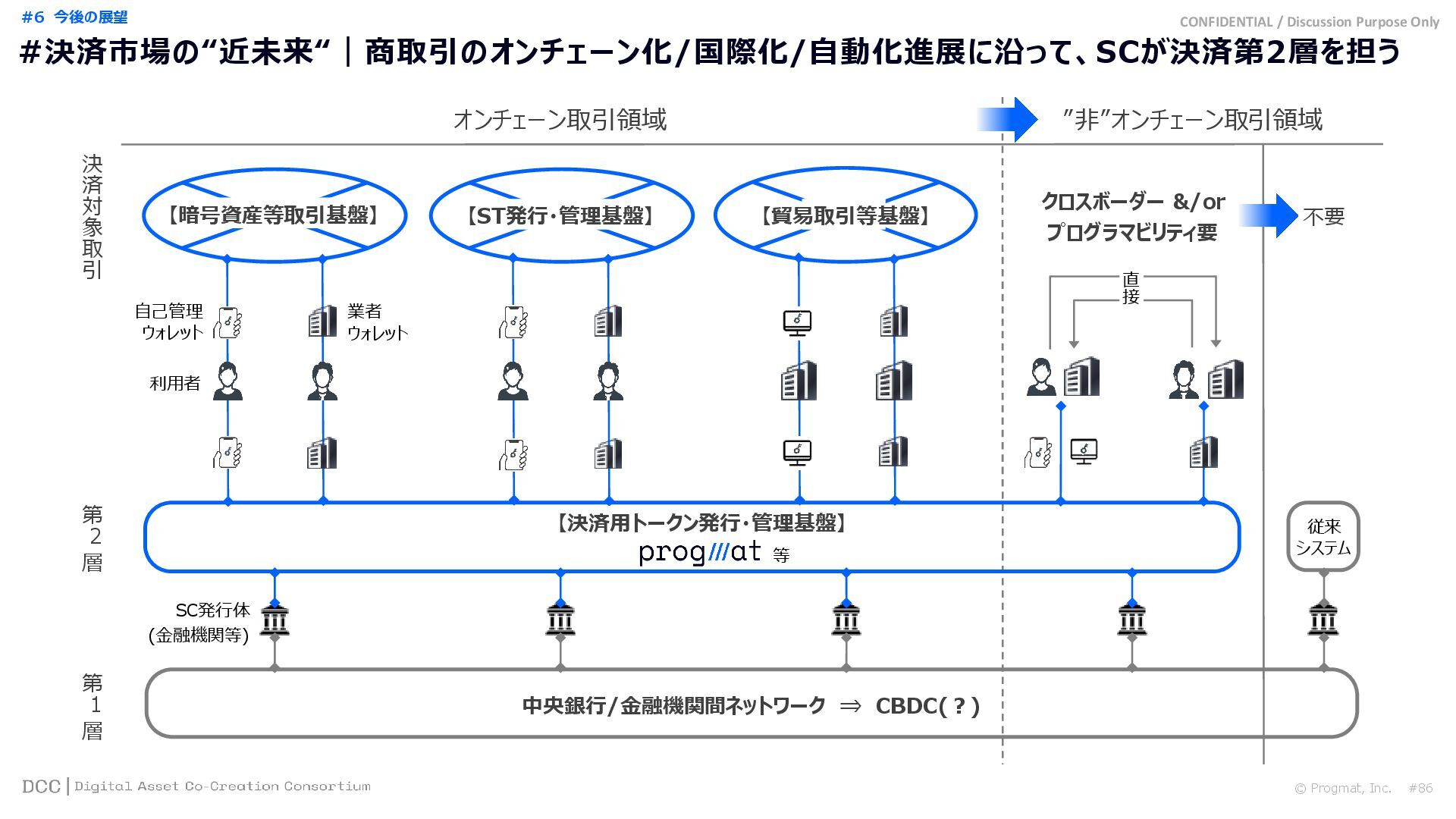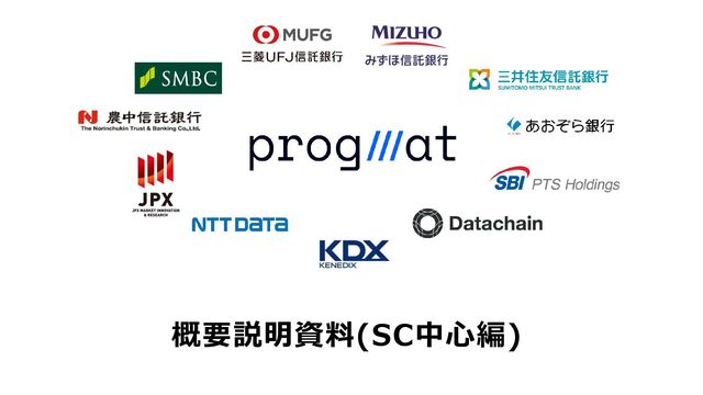 #1 What is Progmat インフラ層 Ⅰ サービス層 Ⅱ Progmat, Inc.…「Core Developer」兼「コンソーシアム(DCC)事務局」 ST UT Coin DCC事務局 信託銀行 A 信託銀行 B 信託銀行 C 銀行 D 銀行 E 証券 F 証券 G エクスチェンジ H コア機能提供 利用料 & 各発行体 役務 対価 Service Developers 株主企業群=アライアンスパートナー 出資 利益還元 スピンアウト (独立化) DCC会員 による 分権運営 インフラ としての 中立的 資本構成 (競争領域) (共創領域)