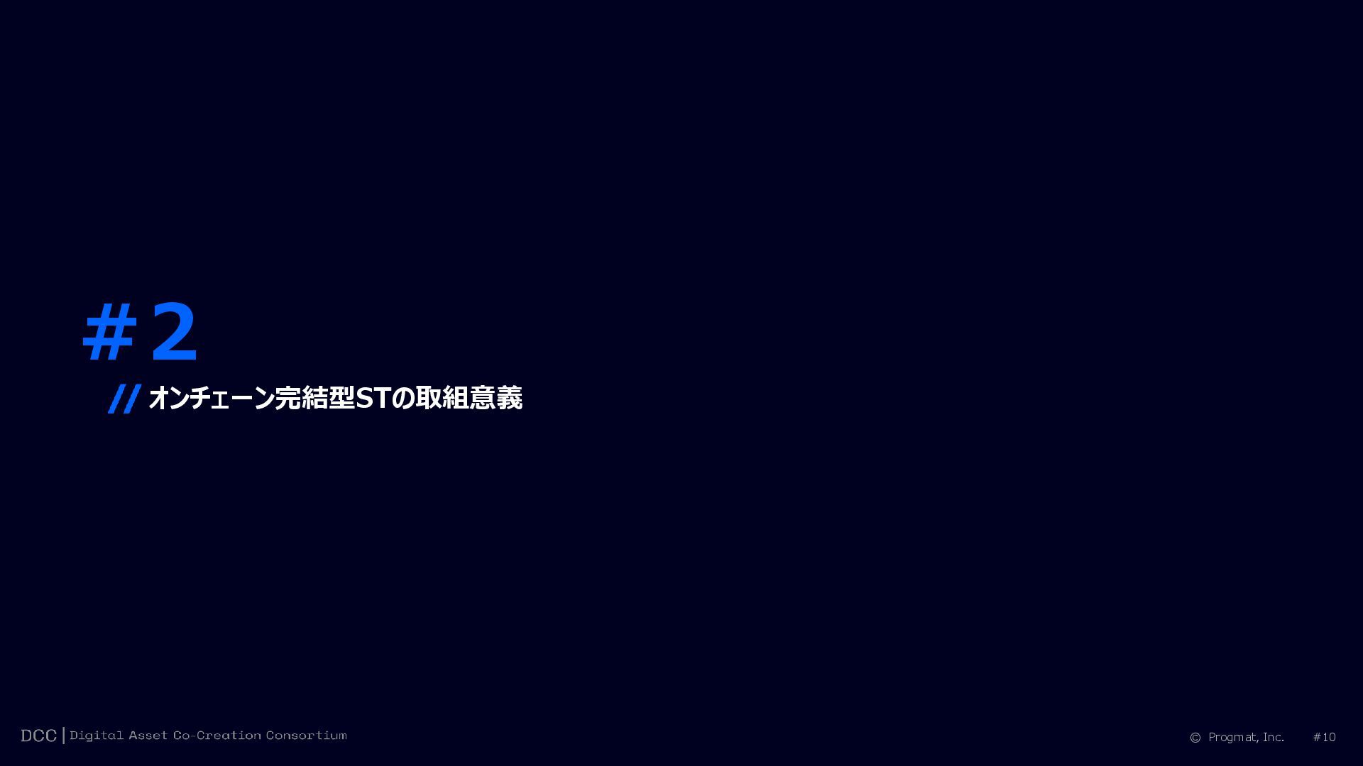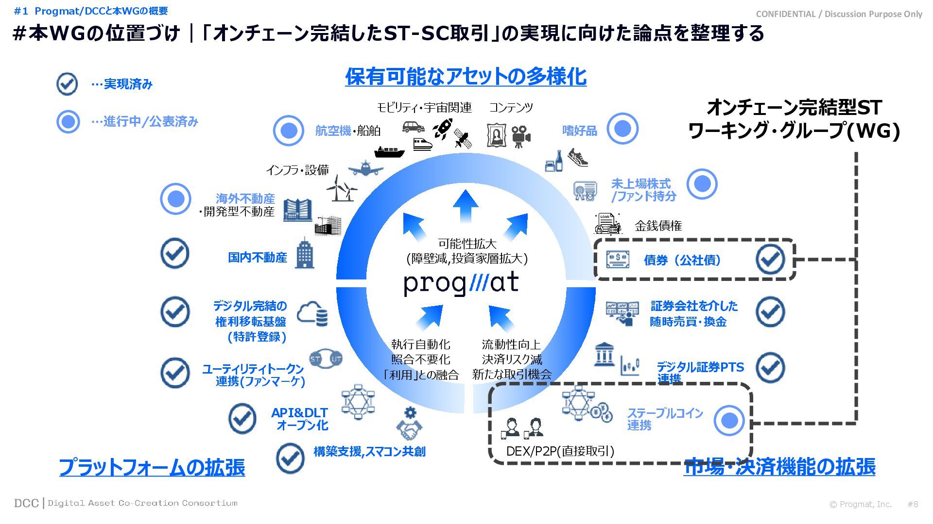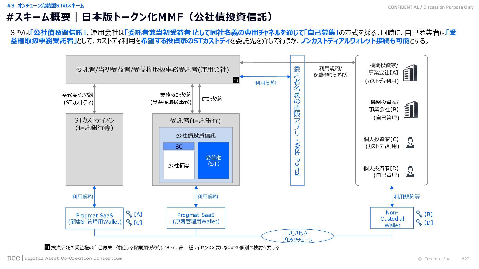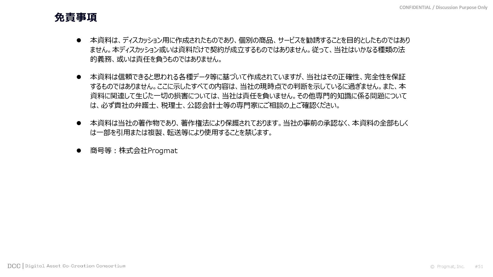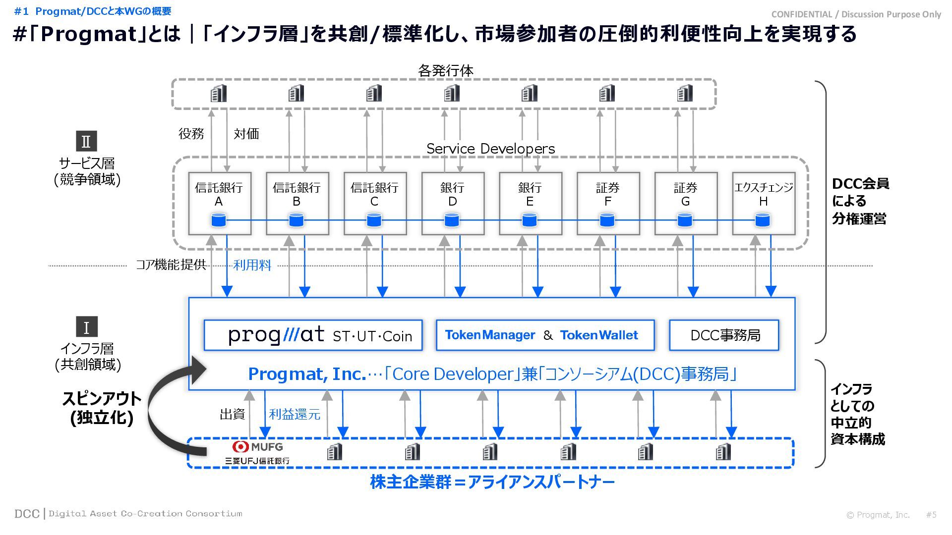 インフラ層 Ⅰ サービス層 Ⅱ Progmat, Inc.…「Core Developer」兼「コンソーシアム(DCC)事務局」 ST UT Coin DCC事務局 信託銀行 A 信託銀行 B 信託銀行 C 銀行 D 銀行 E 証券 F 証券 G エクスチェンジ H コア機能提供 利用料 & 各発行体 役務 対価 Service Developers 株主企業群=アライアンスパートナー 出資 利益還元 スピンアウト (独立化) DCC会員 による 分権運営 インフラ としての 中立的 資本構成 (競争領域) (共創領域) #1 Progmat/DCCと本WGの概要