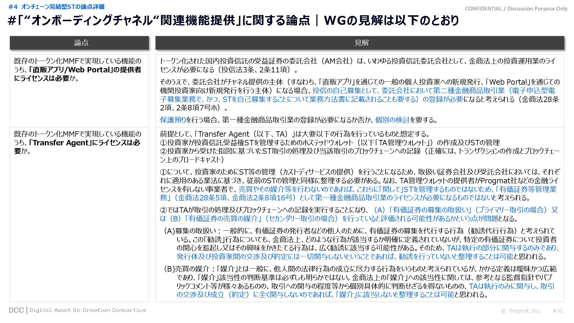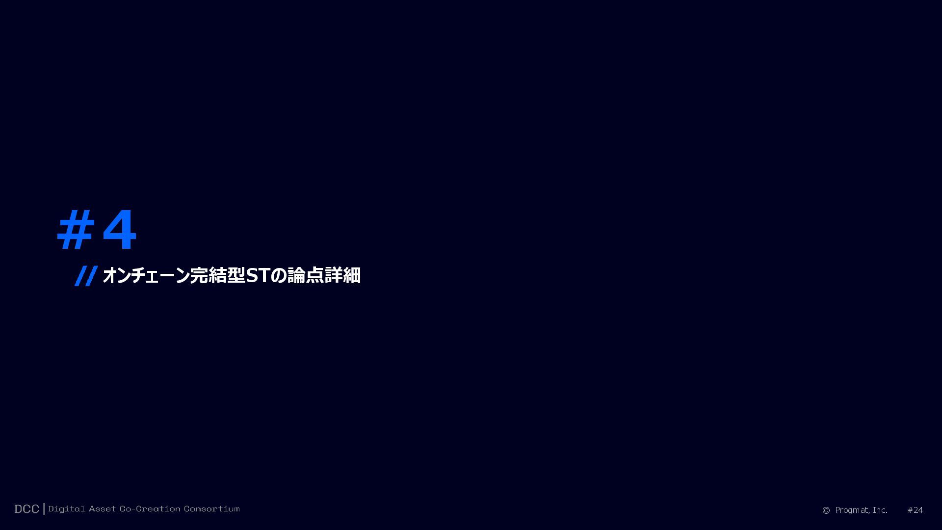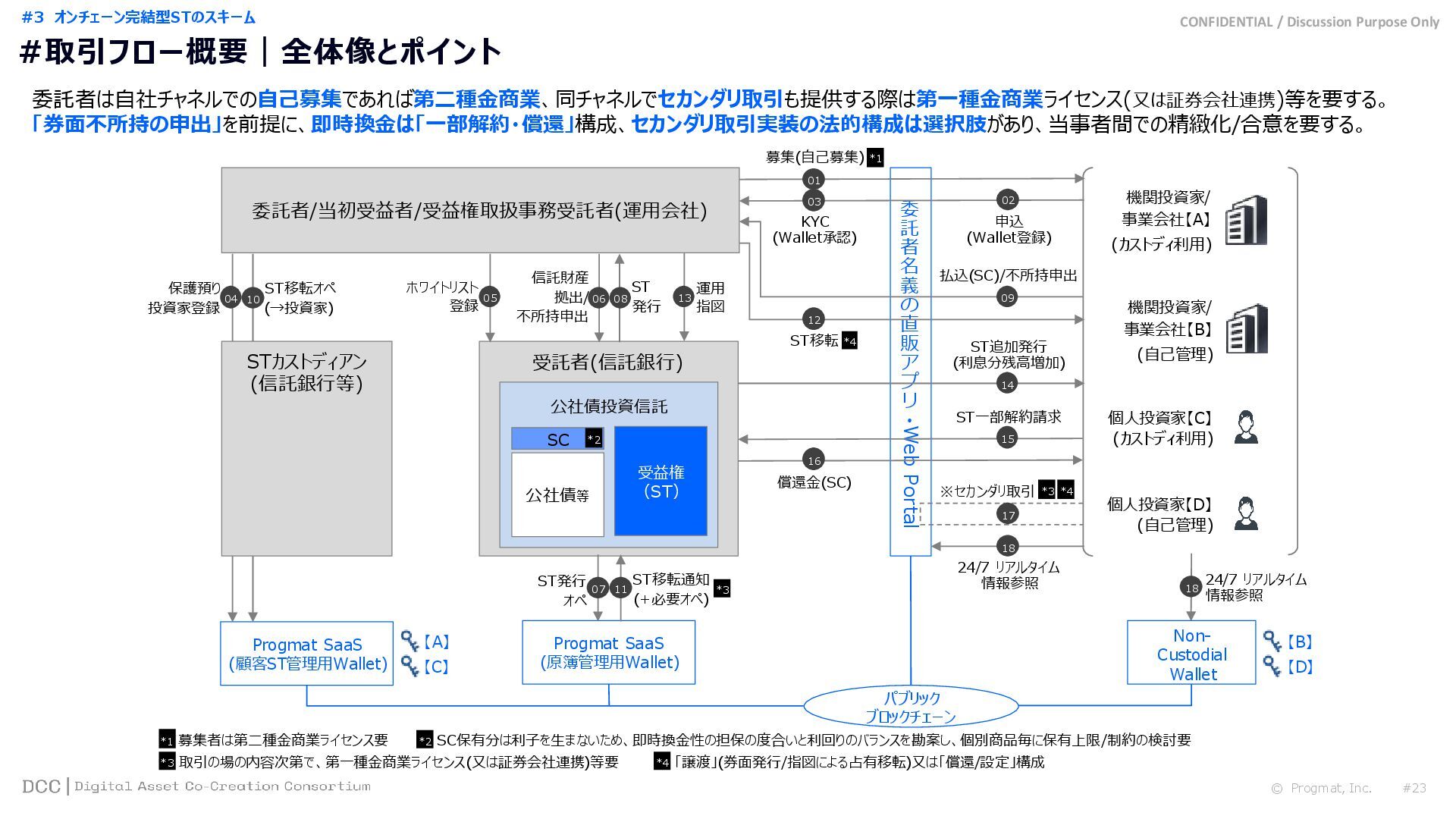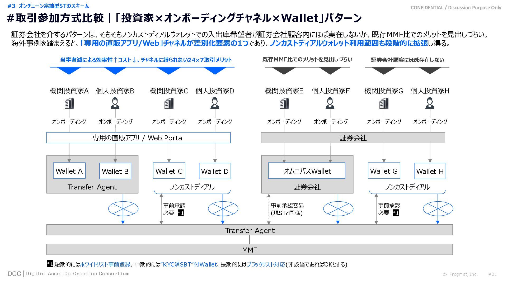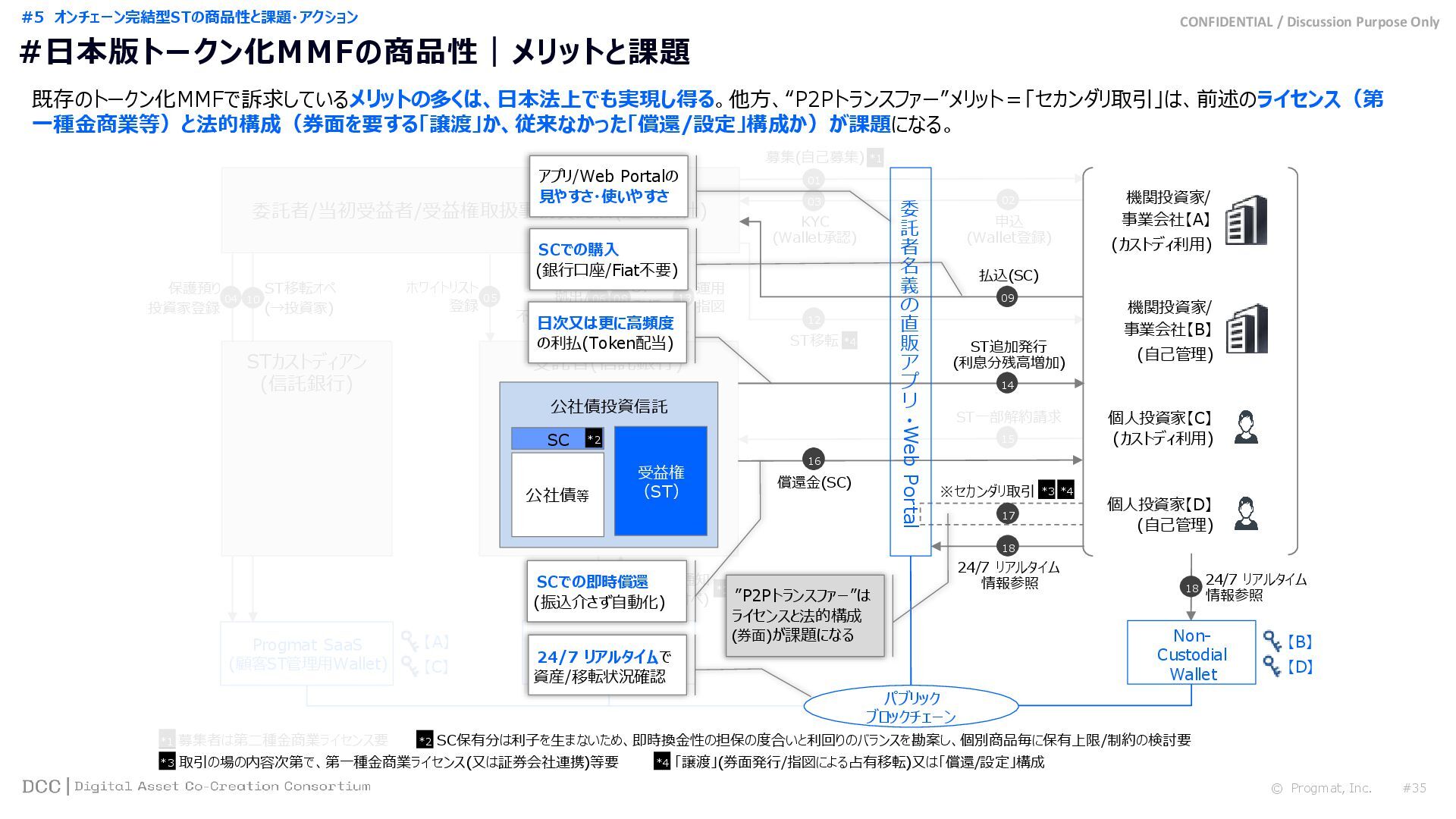 インフラ層 Ⅰ サービス層 Ⅱ Progmat, Inc.…「Core Developer」兼「コンソーシアム(DCC)事務局」 ST UT Coin DCC事務局 信託銀行 A 信託銀行 B 信託銀行 C 銀行 D 銀行 E 証券 F 証券 G エクスチェンジ H コア機能提供 利用料 & 各発行体 役務 対価 Service Developers 株主企業群=アライアンスパートナー 出資 利益還元 スピンアウト (独立化) DCC会員 による 分権運営 インフラ としての 中立的 資本構成 (競争領域) (共創領域) #1 Progmat/DCCと本WGの概要