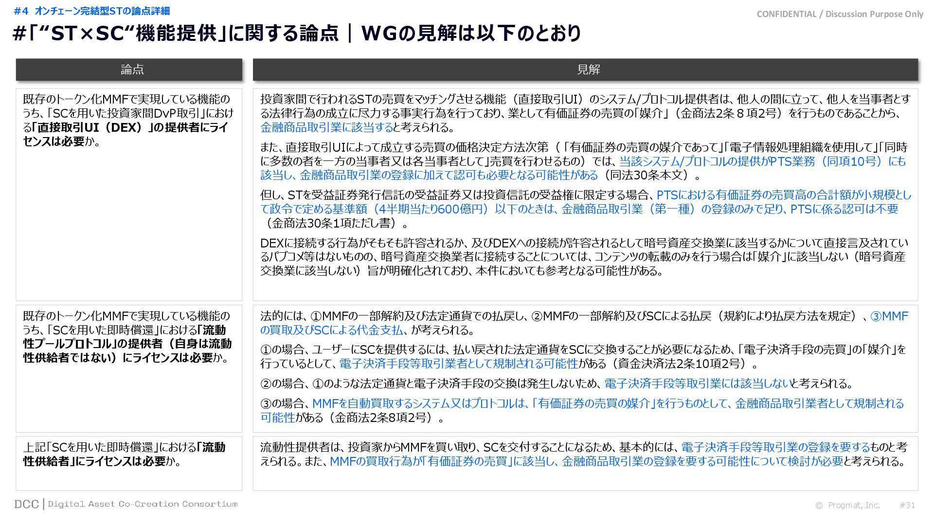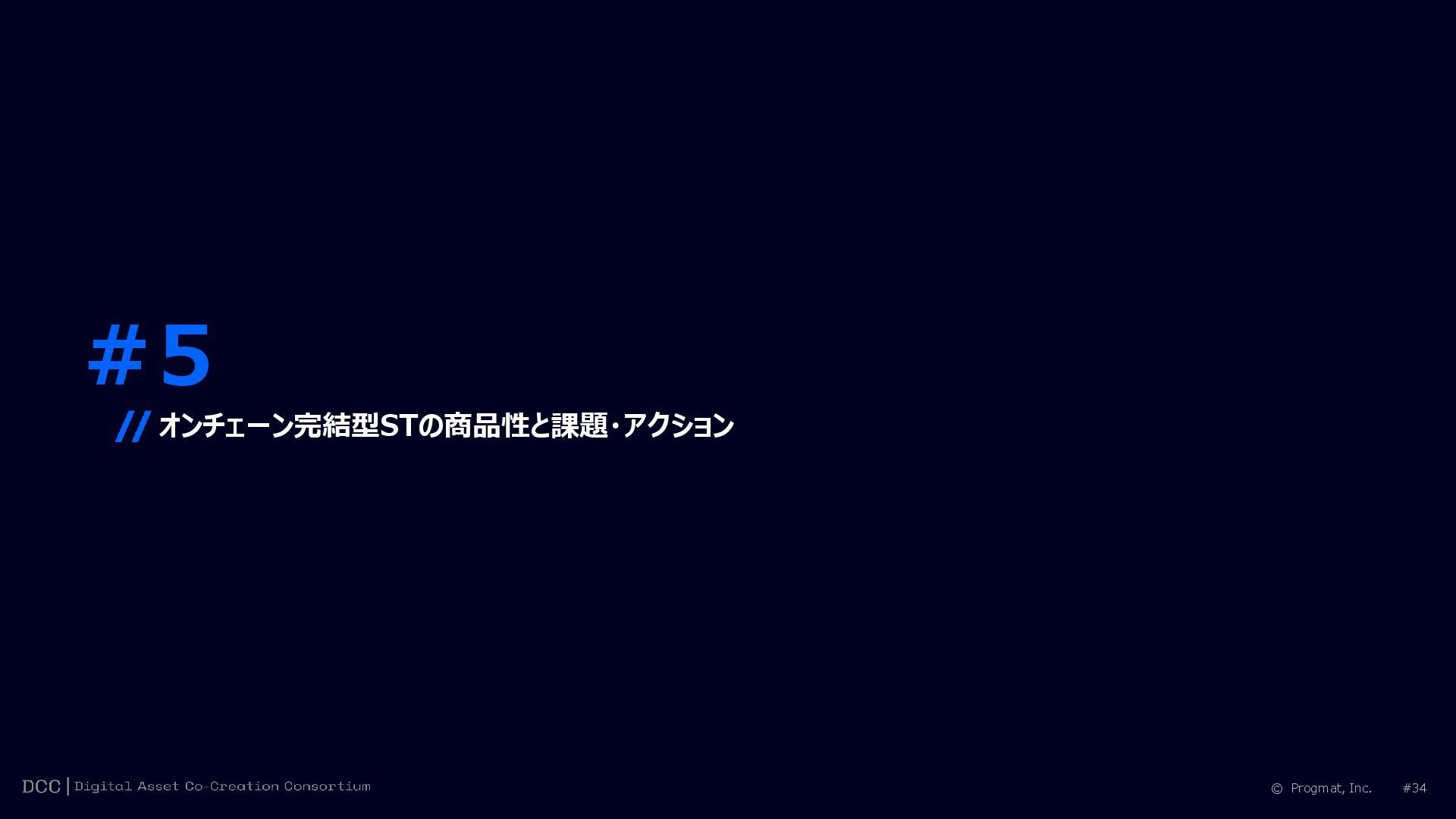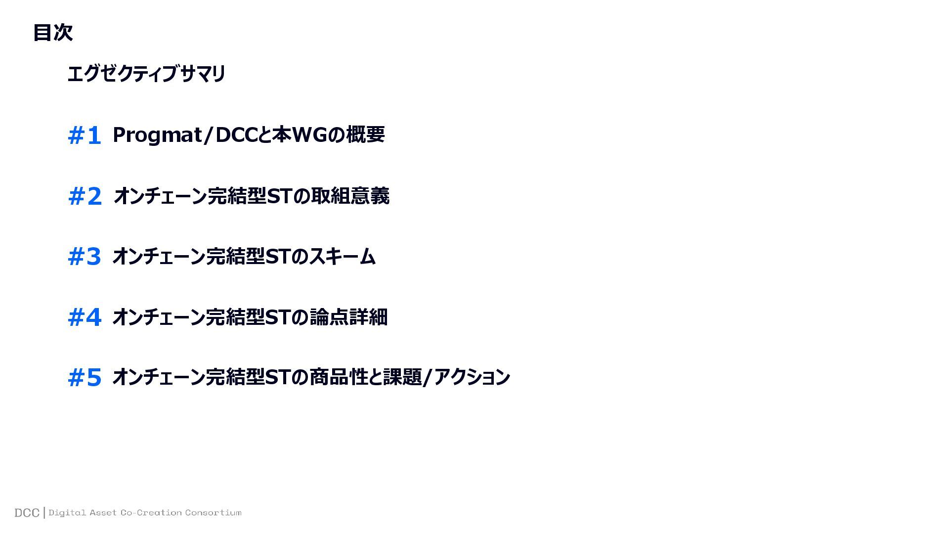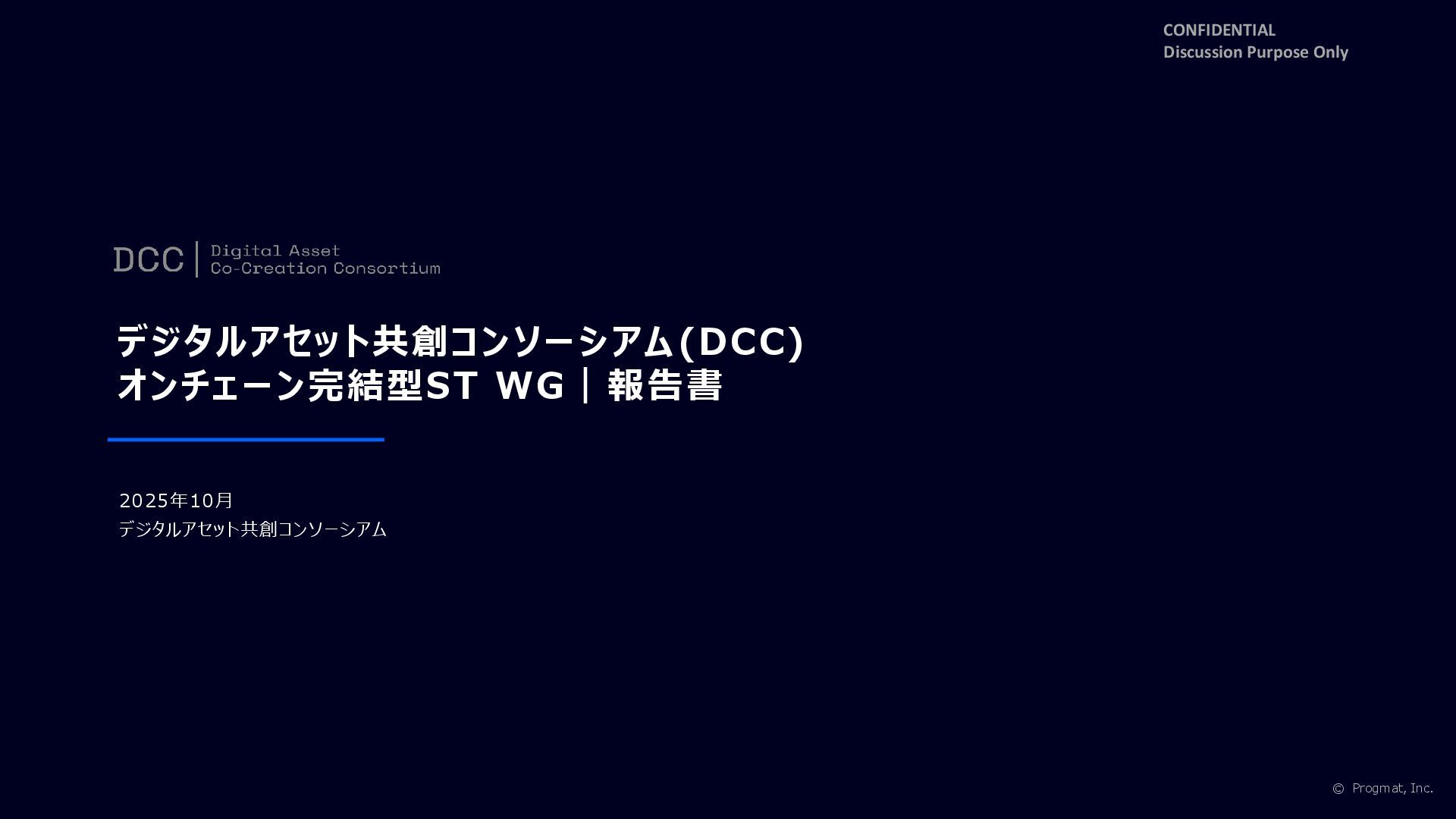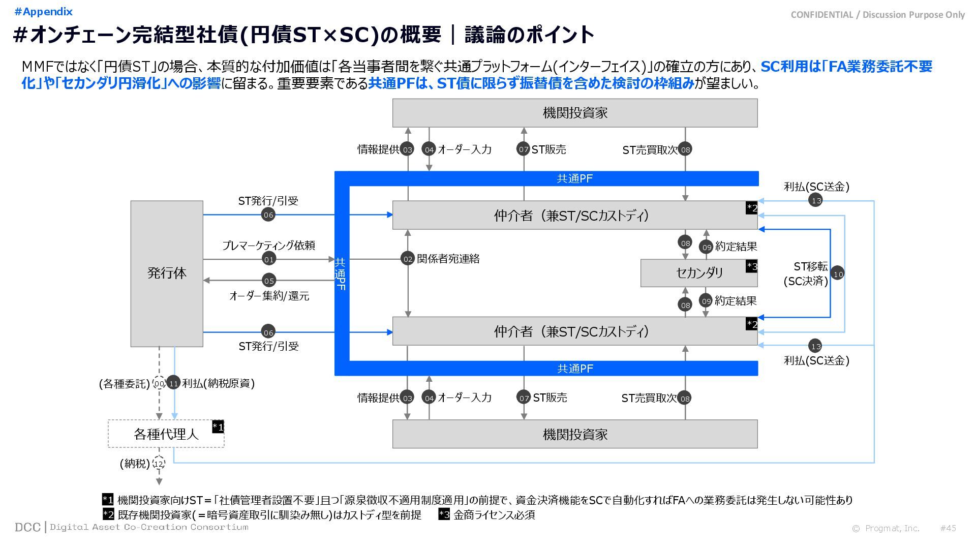 インフラ層 Ⅰ サービス層 Ⅱ Progmat, Inc.…「Core Developer」兼「コンソーシアム(DCC)事務局」 ST UT Coin DCC事務局 信託銀行 A 信託銀行 B 信託銀行 C 銀行 D 銀行 E 証券 F 証券 G エクスチェンジ H コア機能提供 利用料 & 各発行体 役務 対価 Service Developers 株主企業群=アライアンスパートナー 出資 利益還元 スピンアウト (独立化) DCC会員 による 分権運営 インフラ としての 中立的 資本構成 (競争領域) (共創領域) #1 Progmat/DCCと本WGの概要