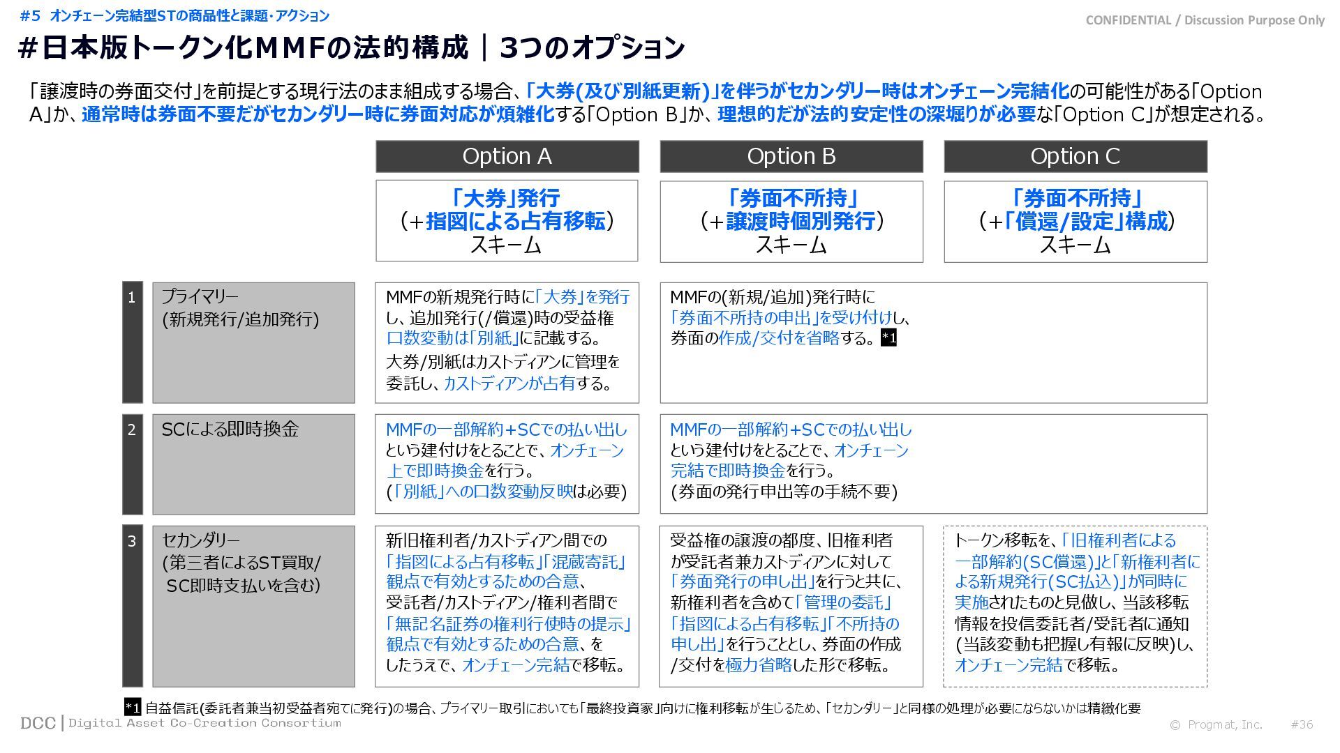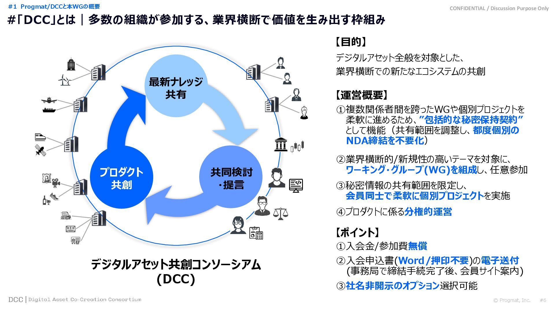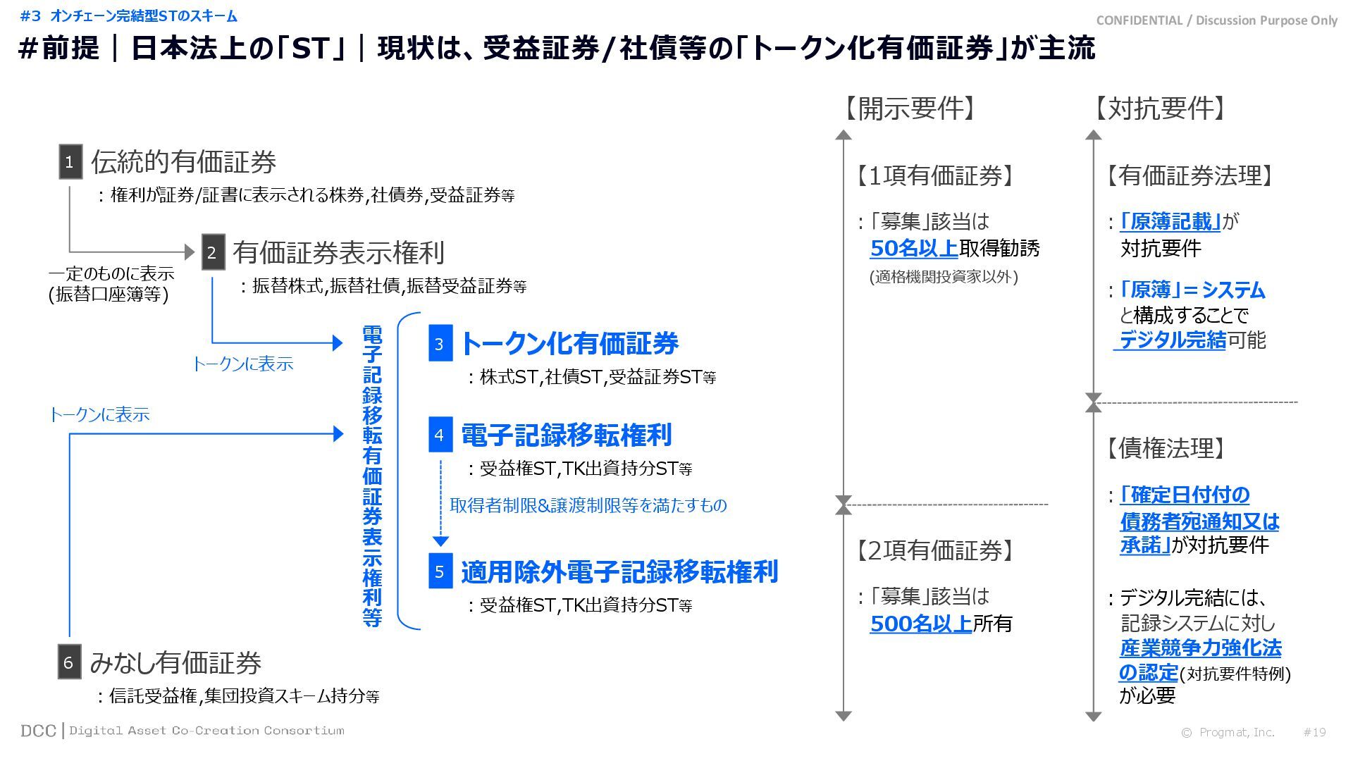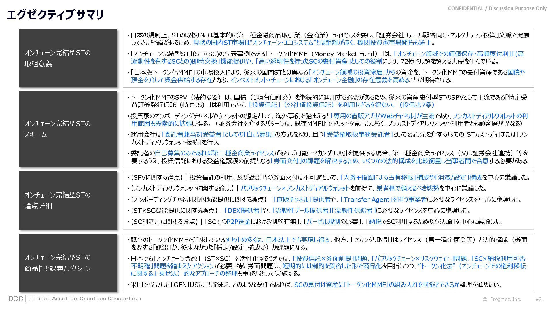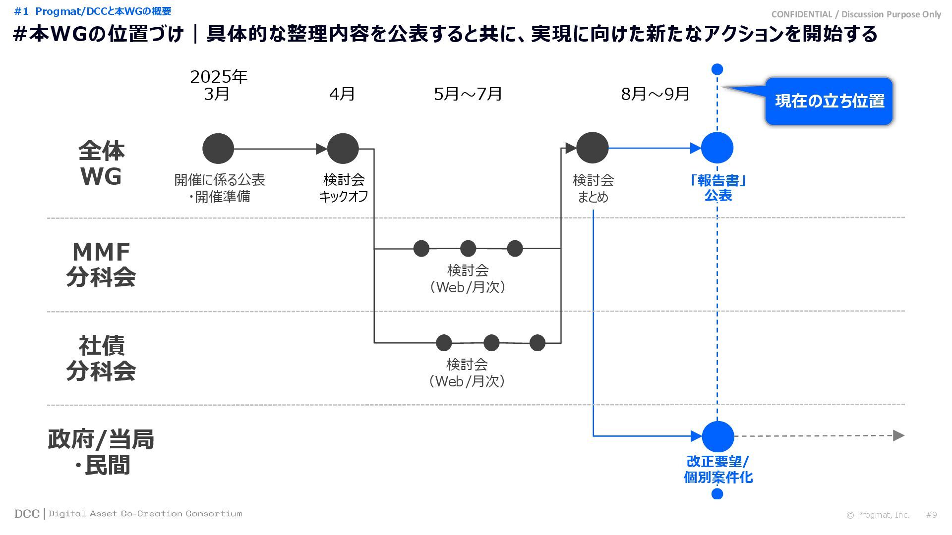 インフラ層 Ⅰ サービス層 Ⅱ Progmat, Inc.…「Core Developer」兼「コンソーシアム(DCC)事務局」 ST UT Coin DCC事務局 信託銀行 A 信託銀行 B 信託銀行 C 銀行 D 銀行 E 証券 F 証券 G エクスチェンジ H コア機能提供 利用料 & 各発行体 役務 対価 Service Developers 株主企業群=アライアンスパートナー 出資 利益還元 スピンアウト (独立化) DCC会員 による 分権運営 インフラ としての 中立的 資本構成 (競争領域) (共創領域) #1 Progmat/DCCと本WGの概要