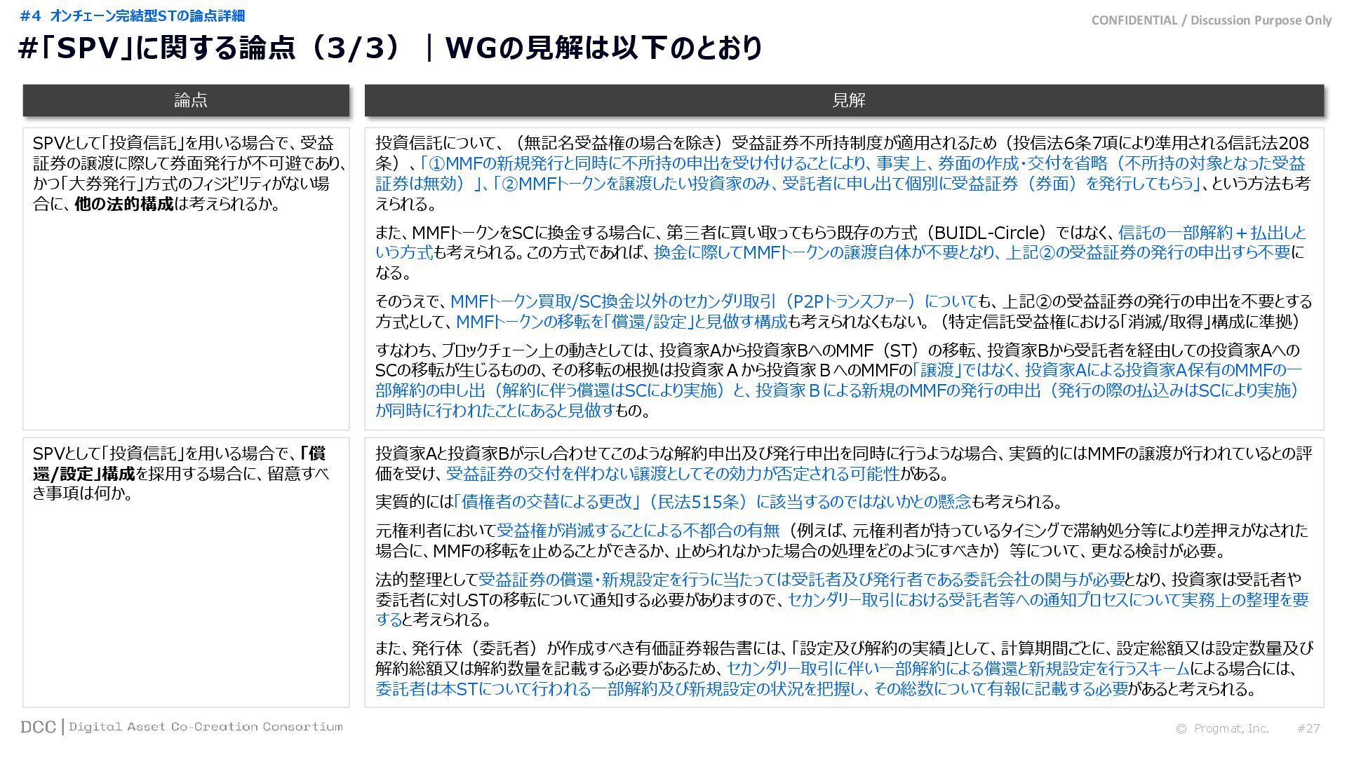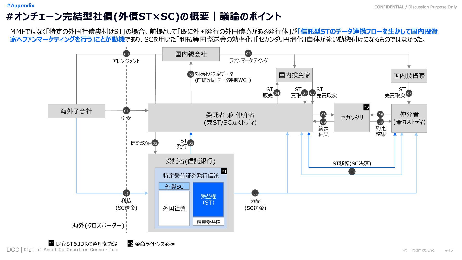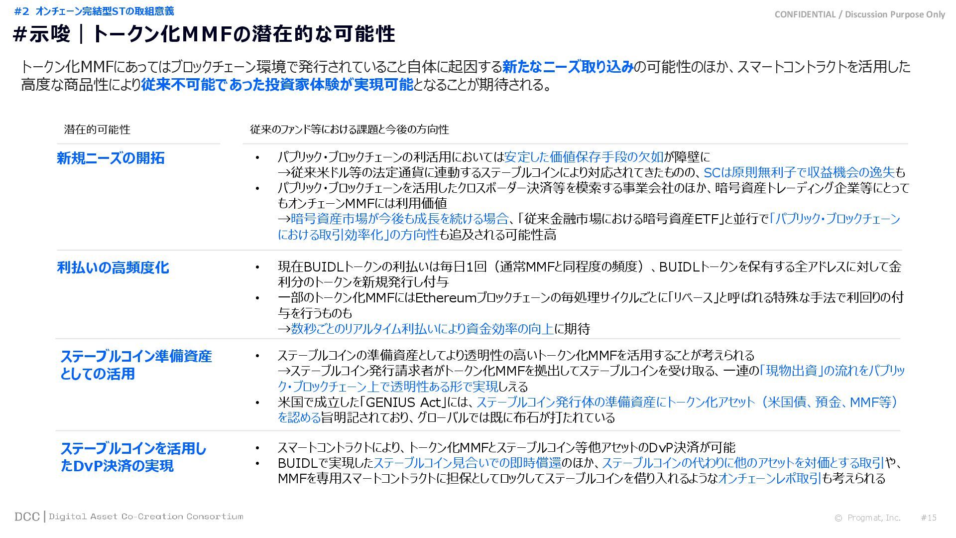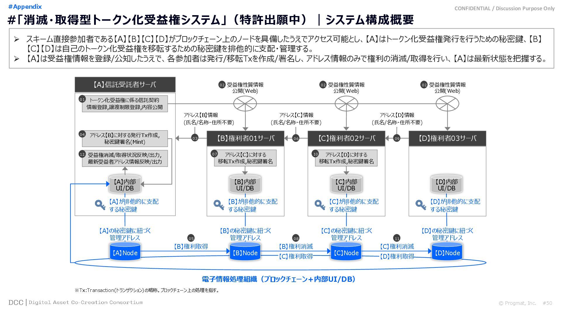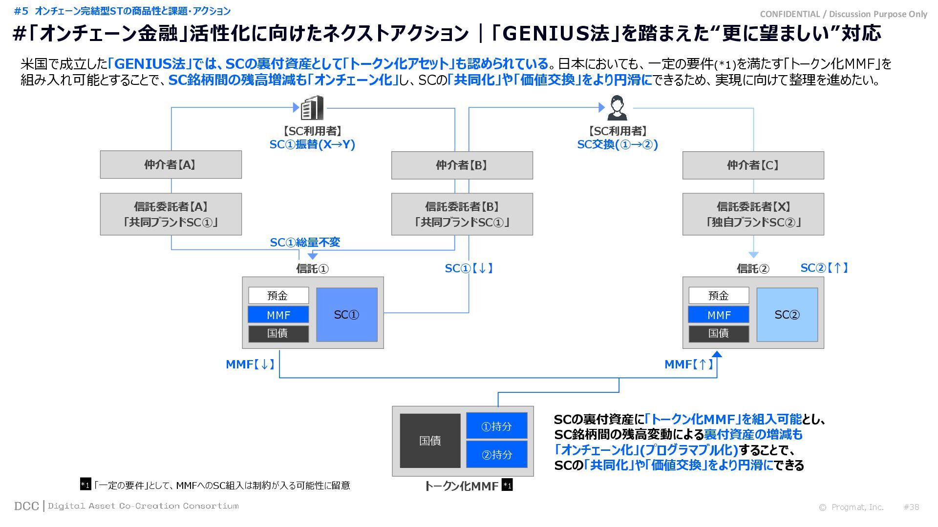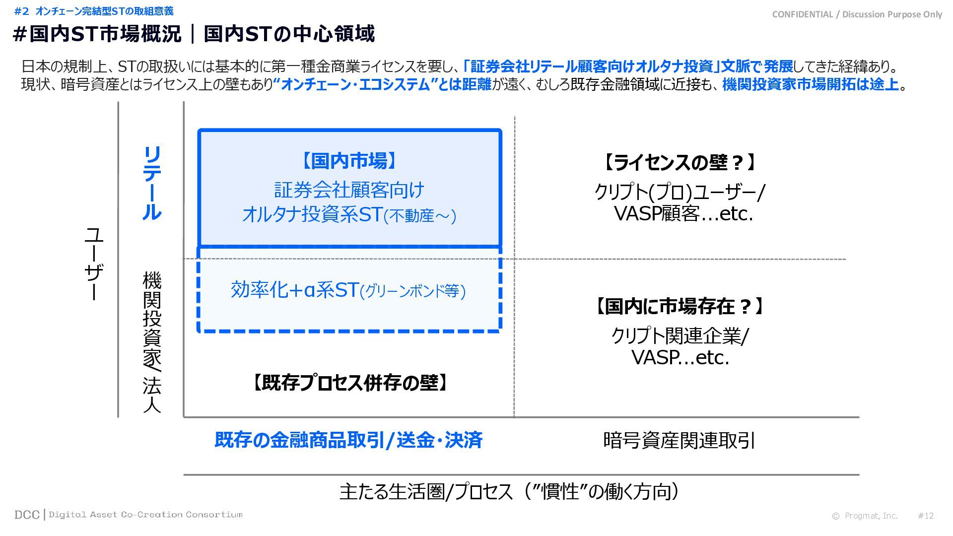 インフラ層 Ⅰ サービス層 Ⅱ Progmat, Inc.…「Core Developer」兼「コンソーシアム(DCC)事務局」 ST UT Coin DCC事務局 信託銀行 A 信託銀行 B 信託銀行 C 銀行 D 銀行 E 証券 F 証券 G エクスチェンジ H コア機能提供 利用料 & 各発行体 役務 対価 Service Developers 株主企業群=アライアンスパートナー 出資 利益還元 スピンアウト (独立化) DCC会員 による 分権運営 インフラ としての 中立的 資本構成 (競争領域) (共創領域) #1 Progmat/DCCと本WGの概要