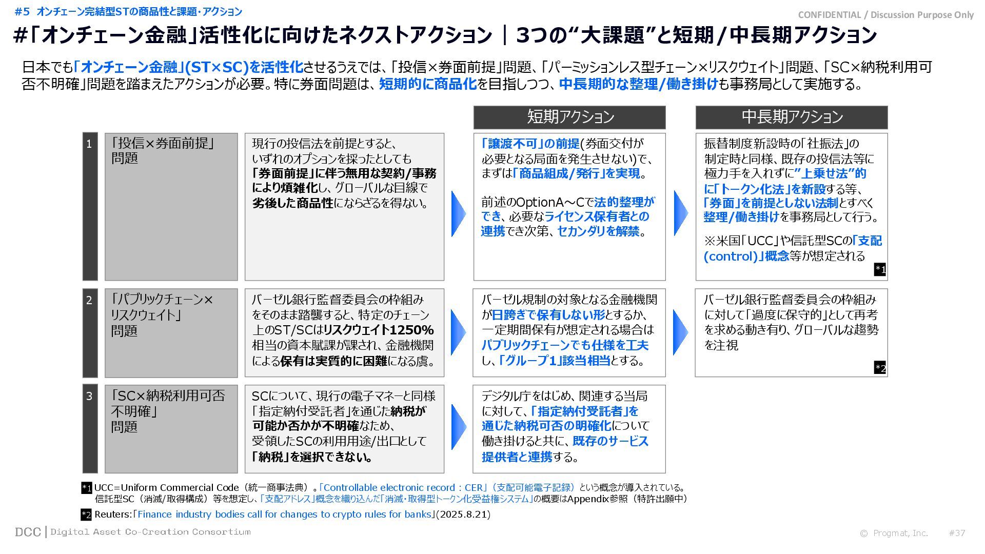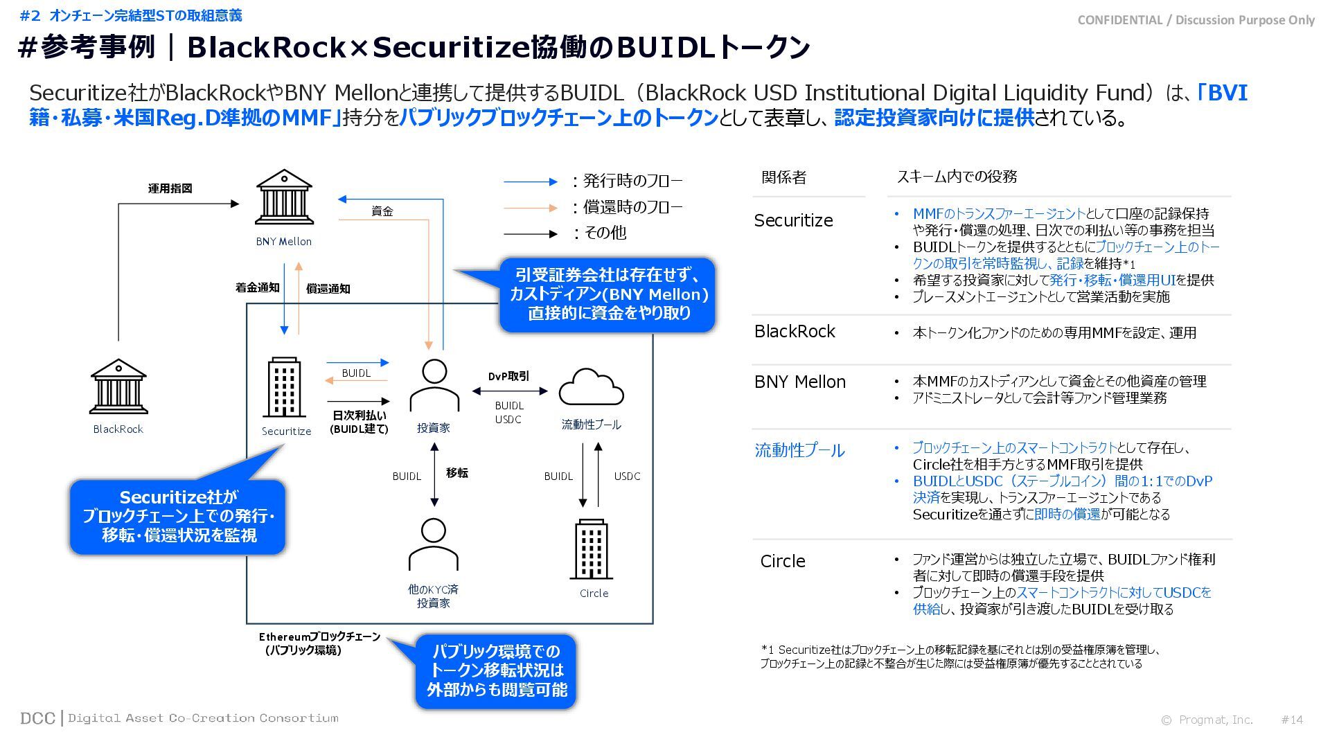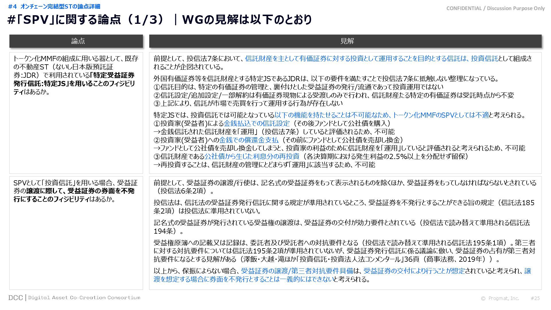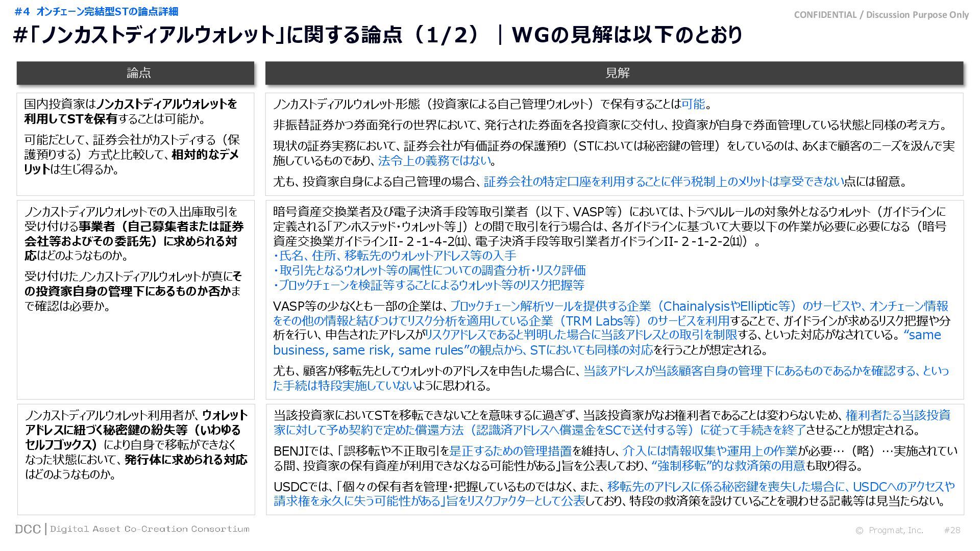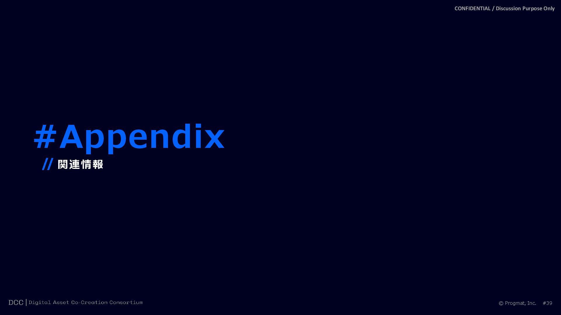 インフラ層 Ⅰ サービス層 Ⅱ Progmat, Inc.…「Core Developer」兼「コンソーシアム(DCC)事務局」 ST UT Coin DCC事務局 信託銀行 A 信託銀行 B 信託銀行 C 銀行 D 銀行 E 証券 F 証券 G エクスチェンジ H コア機能提供 利用料 & 各発行体 役務 対価 Service Developers 株主企業群=アライアンスパートナー 出資 利益還元 スピンアウト (独立化) DCC会員 による 分権運営 インフラ としての 中立的 資本構成 (競争領域) (共創領域) #1 Progmat/DCCと本WGの概要