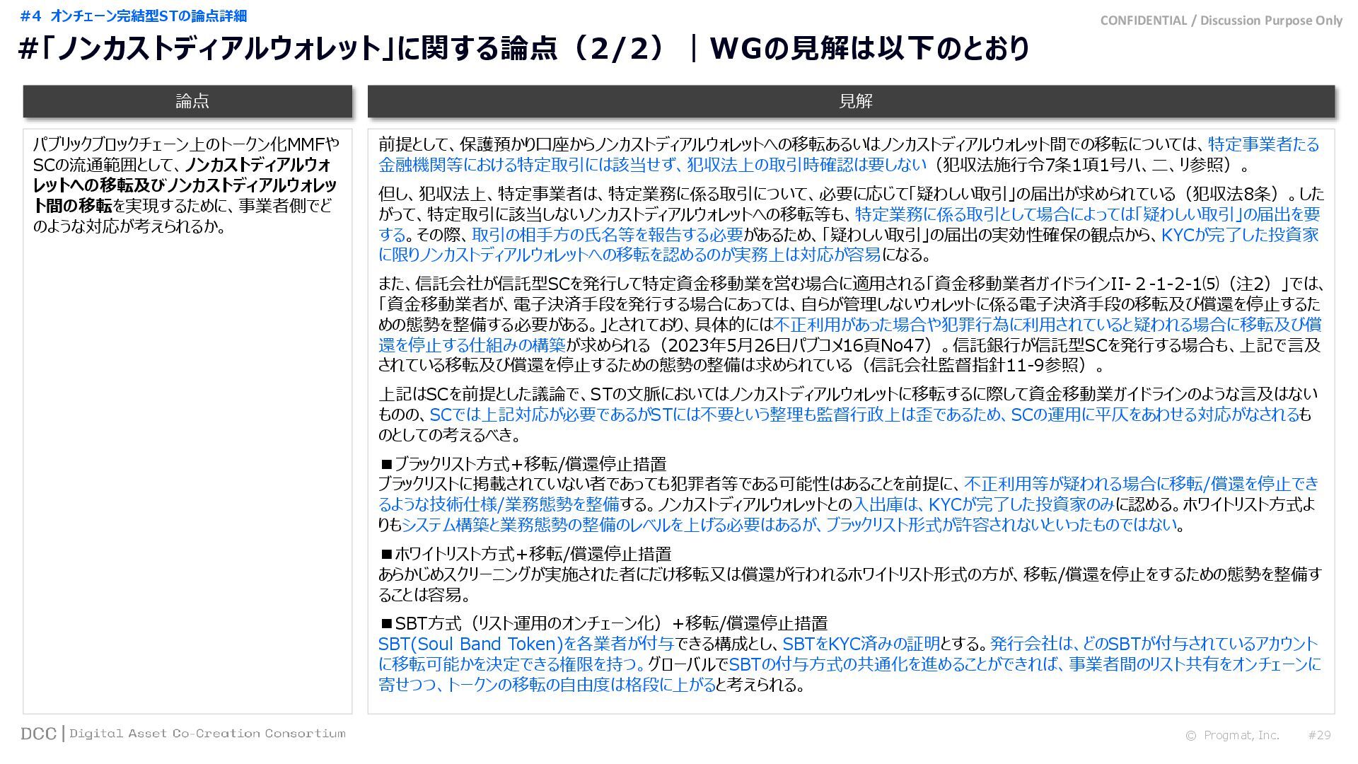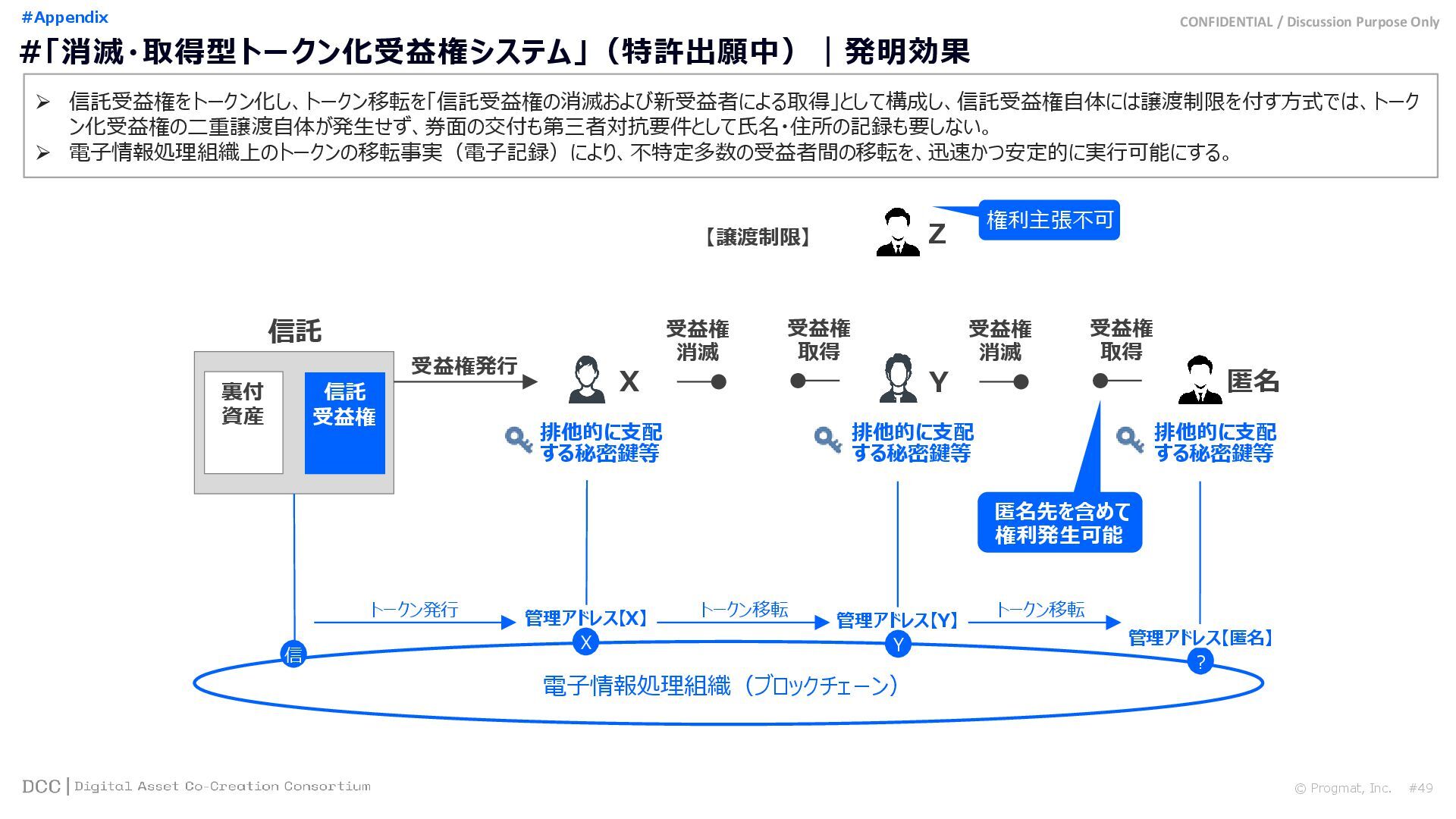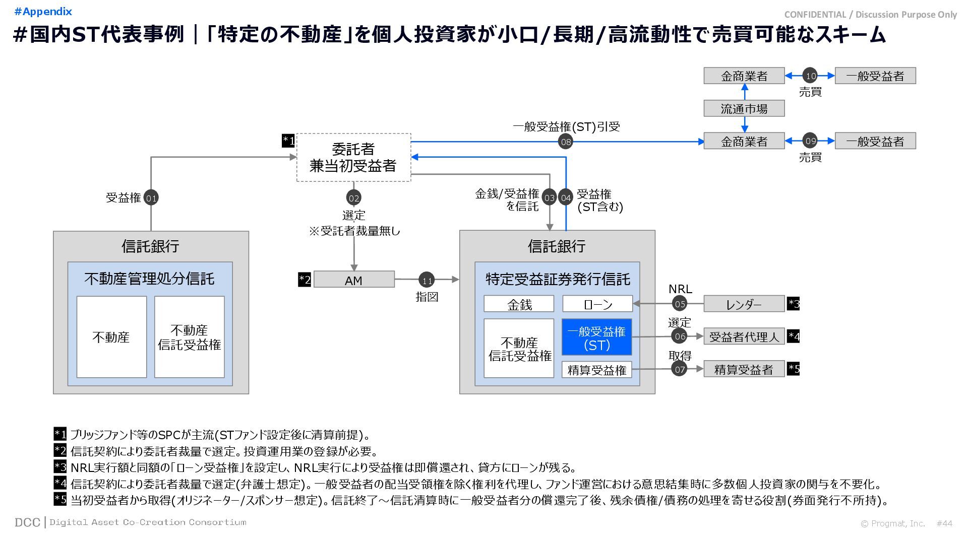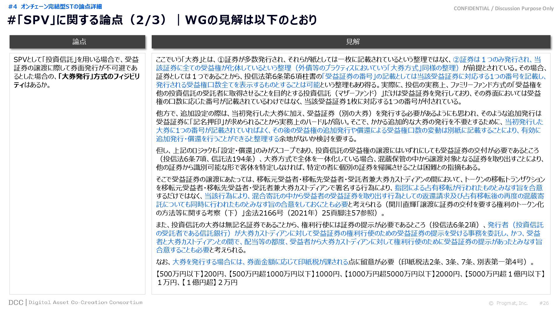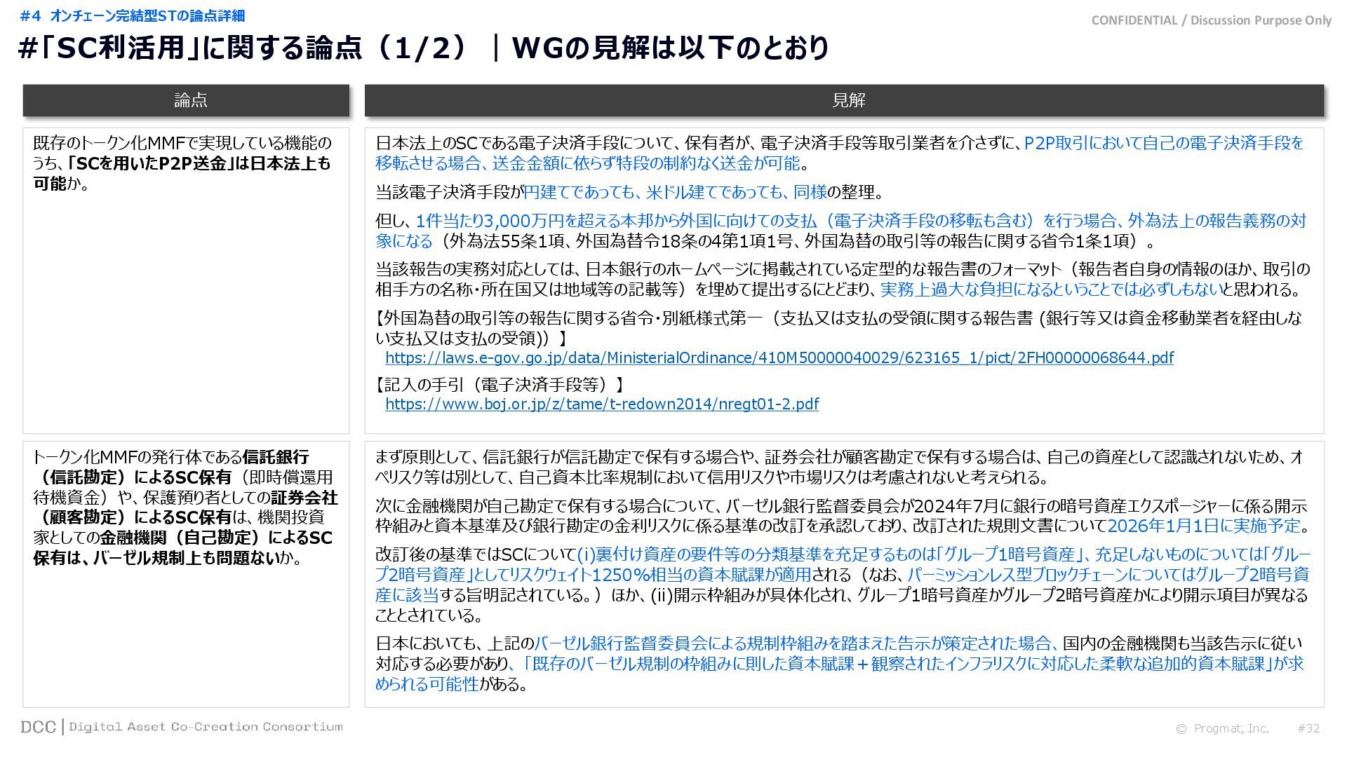 インフラ層 Ⅰ サービス層 Ⅱ Progmat, Inc.…「Core Developer」兼「コンソーシアム(DCC)事務局」 ST UT Coin DCC事務局 信託銀行 A 信託銀行 B 信託銀行 C 銀行 D 銀行 E 証券 F 証券 G エクスチェンジ H コア機能提供 利用料 & 各発行体 役務 対価 Service Developers 株主企業群=アライアンスパートナー 出資 利益還元 スピンアウト (独立化) DCC会員 による 分権運営 インフラ としての 中立的 資本構成 (競争領域) (共創領域) #1 Progmat/DCCと本WGの概要