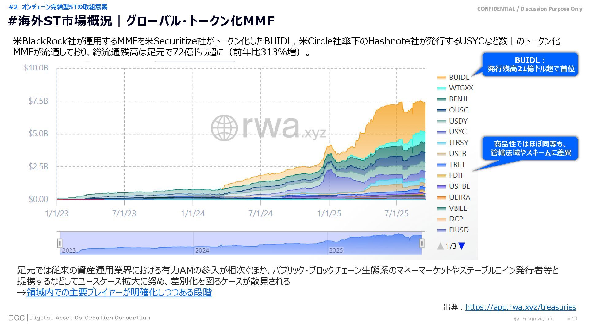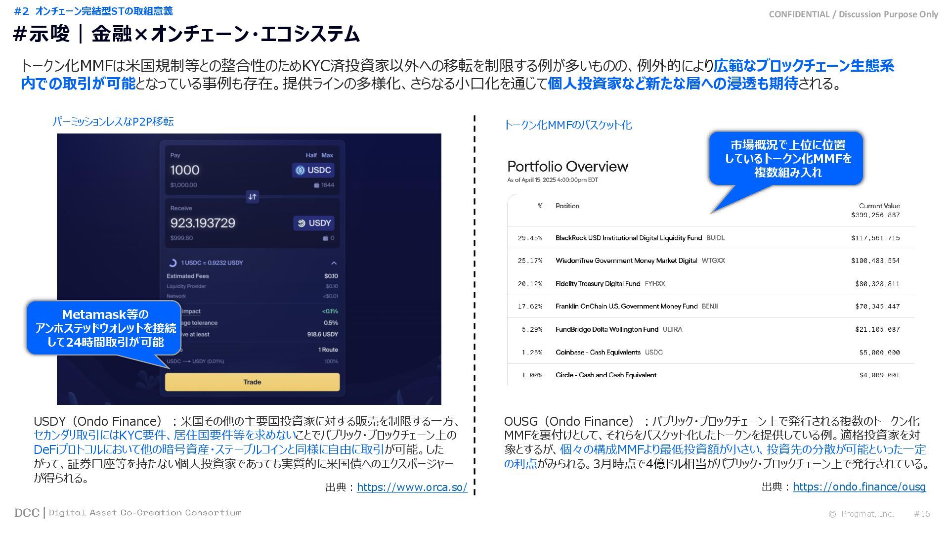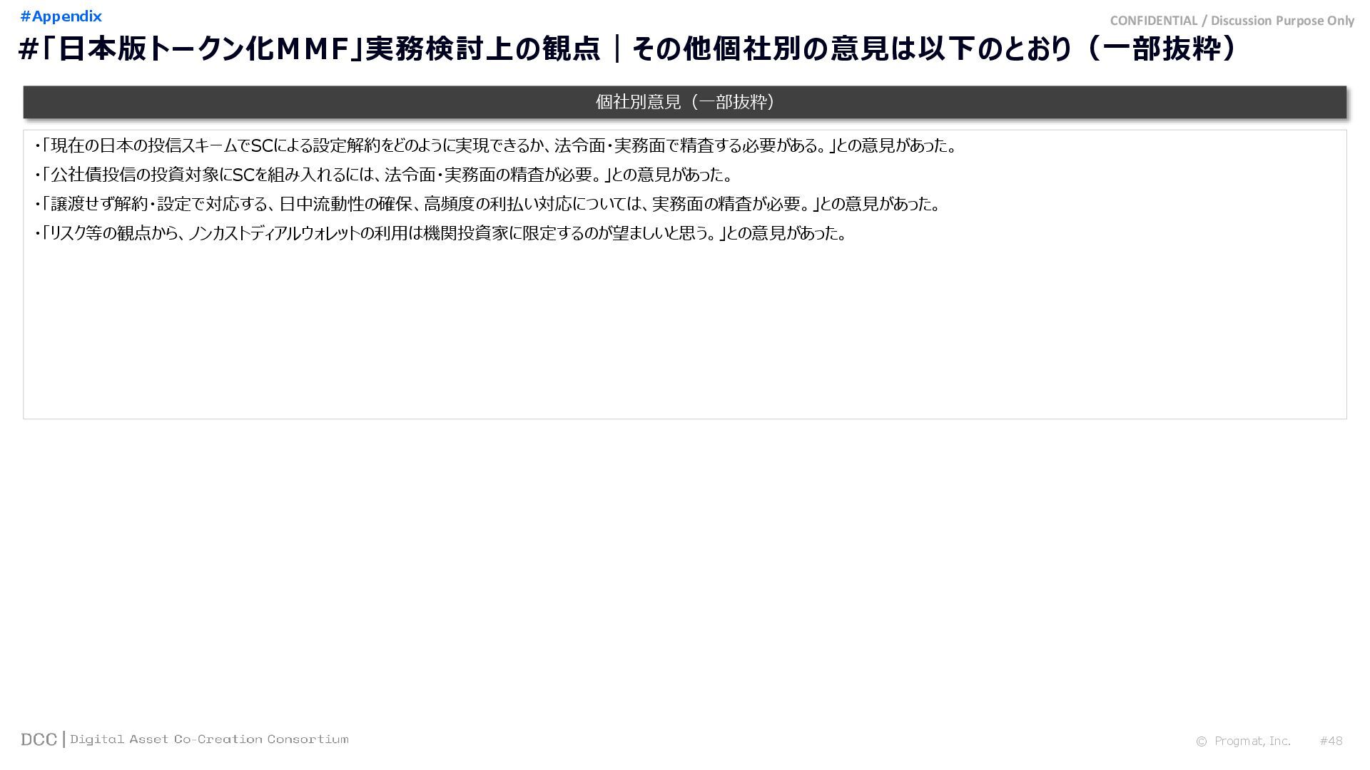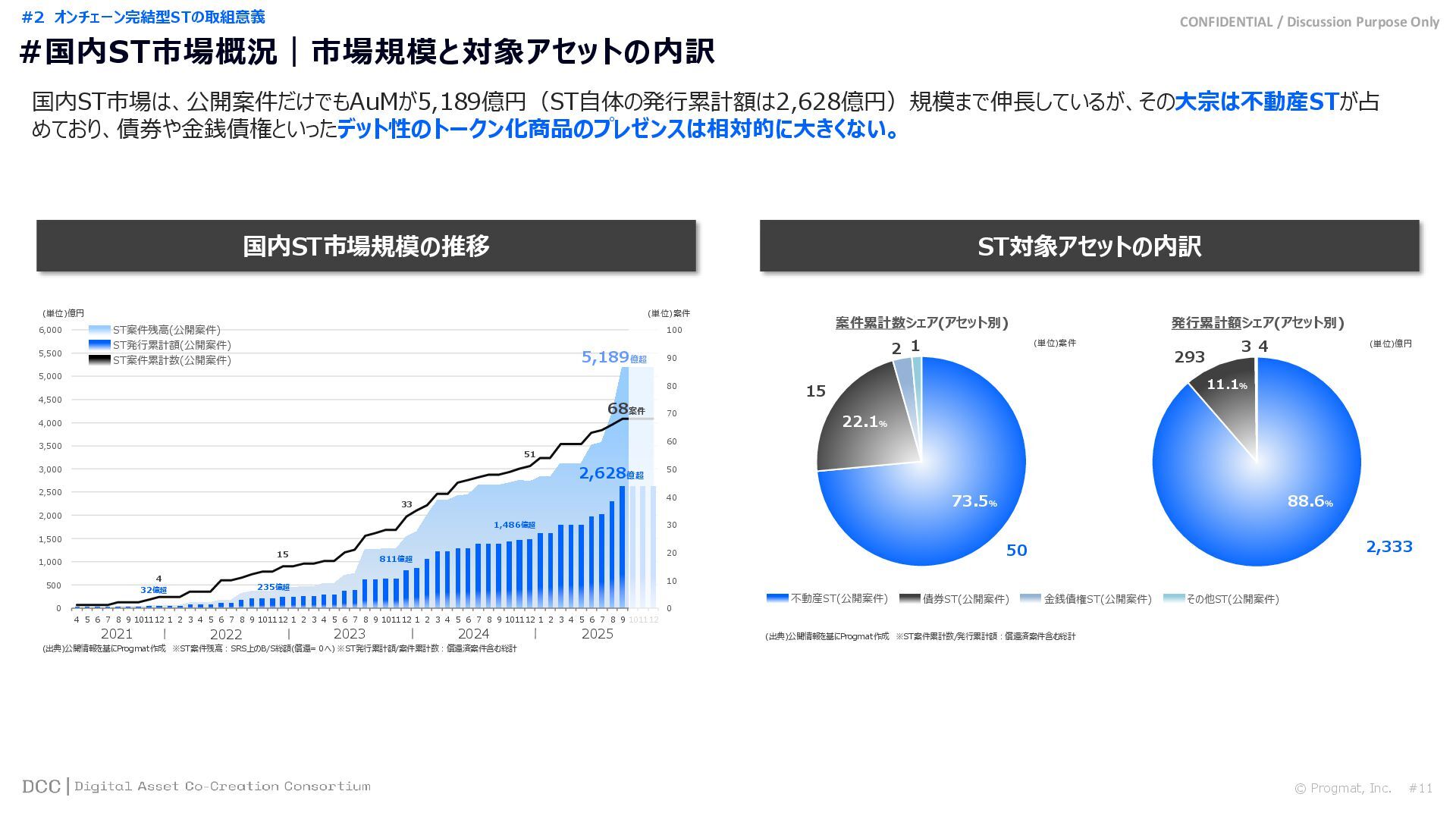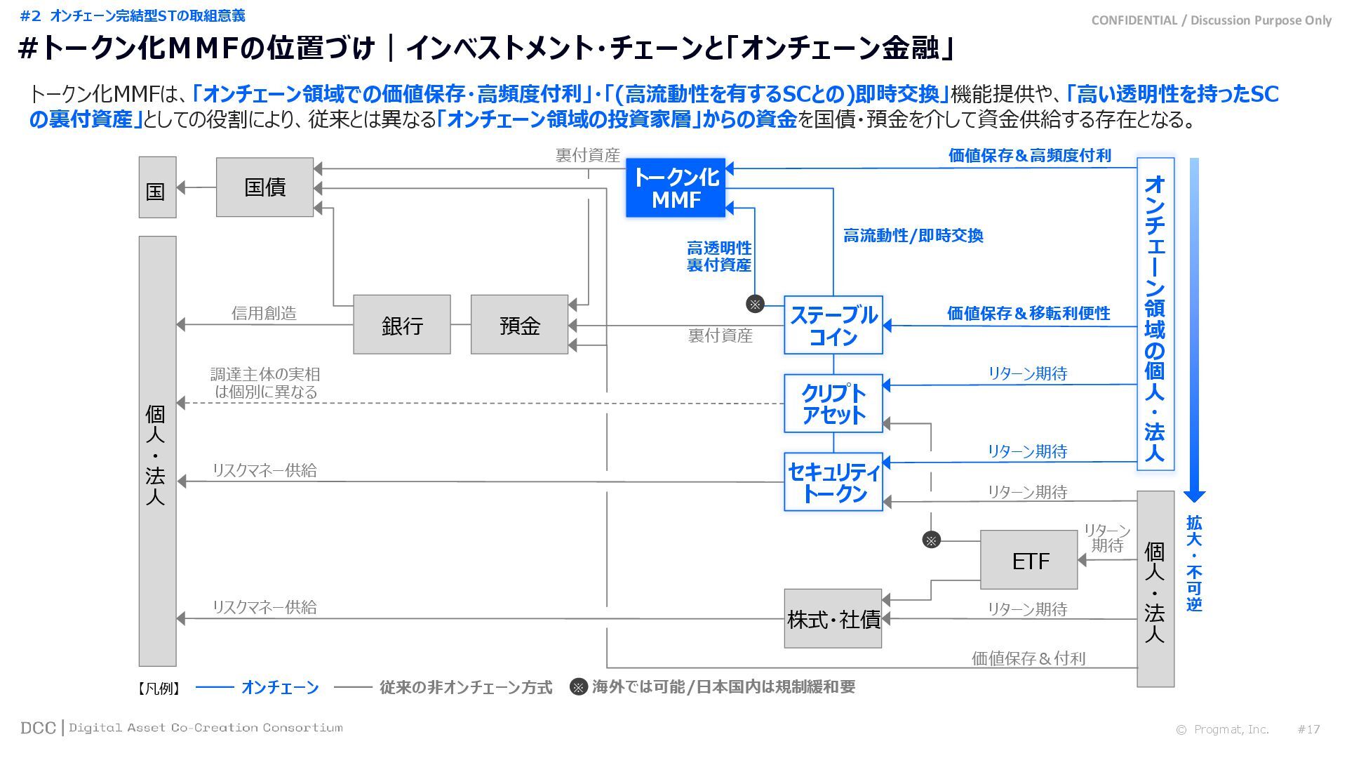 インフラ層 Ⅰ サービス層 Ⅱ Progmat, Inc.…「Core Developer」兼「コンソーシアム(DCC)事務局」 ST UT Coin DCC事務局 信託銀行 A 信託銀行 B 信託銀行 C 銀行 D 銀行 E 証券 F 証券 G エクスチェンジ H コア機能提供 利用料 & 各発行体 役務 対価 Service Developers 株主企業群=アライアンスパートナー 出資 利益還元 スピンアウト (独立化) DCC会員 による 分権運営 インフラ としての 中立的 資本構成 (競争領域) (共創領域) #1 Progmat/DCCと本WGの概要