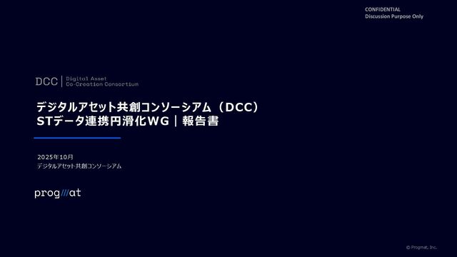 インフラ層 Ⅰ サービス層 Ⅱ Progmat, Inc.…「Core Developer」兼「コンソーシアム(DCC)事務局」 ST UT Coin DCC事務局 信託銀行 A 信託銀行 B 信託銀行 C 銀行 D 銀行 E 証券 F 証券 G エクスチェンジ H コア機能提供 利用料 & 各発行体 役務 対価 Service Developers 株主企業群=アライアンスパートナー 出資 利益還元 スピンアウト (独立化) DCC会員 による 分権運営 インフラ としての 中立的 資本構成 (競争領域) (共創領域) #1 Progmat/DCCと本WGの概要