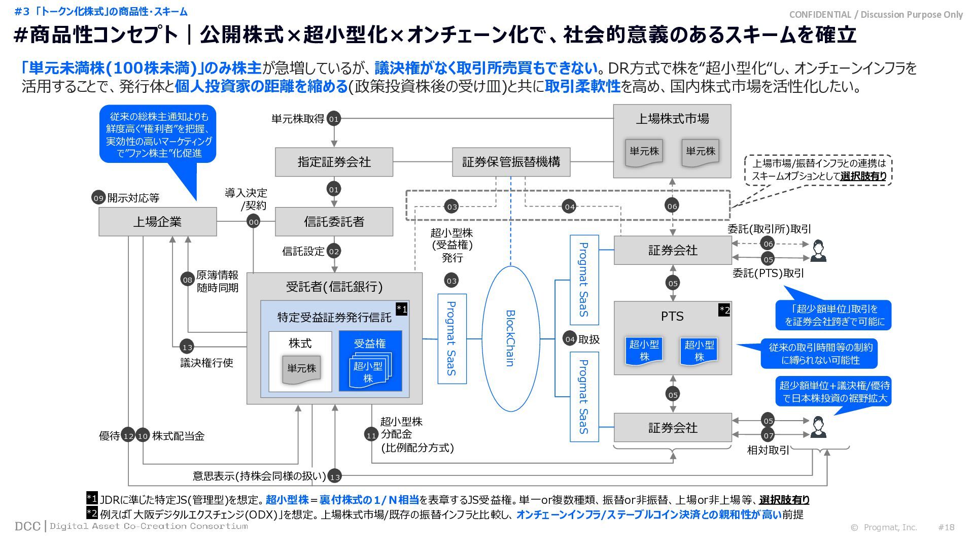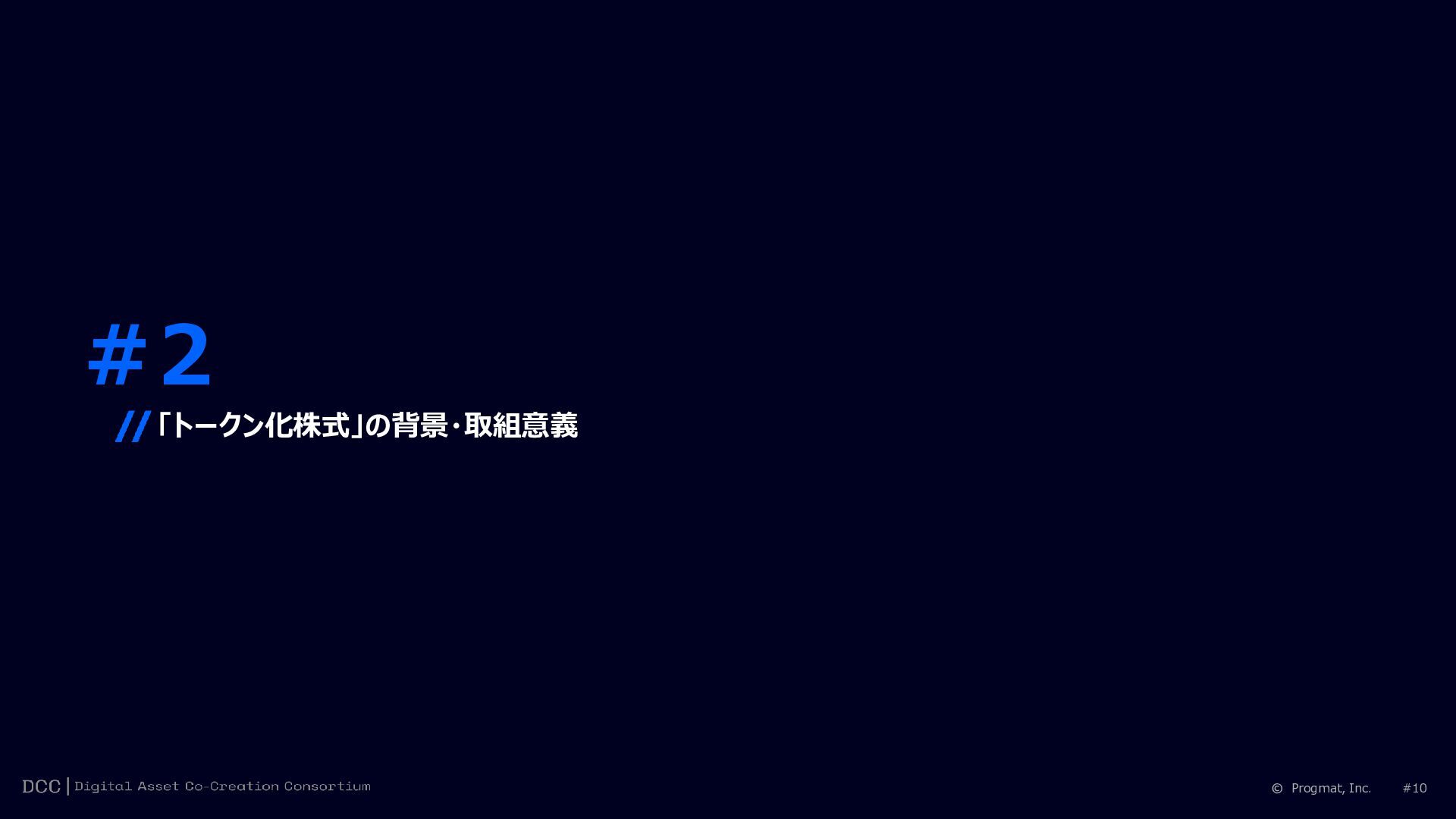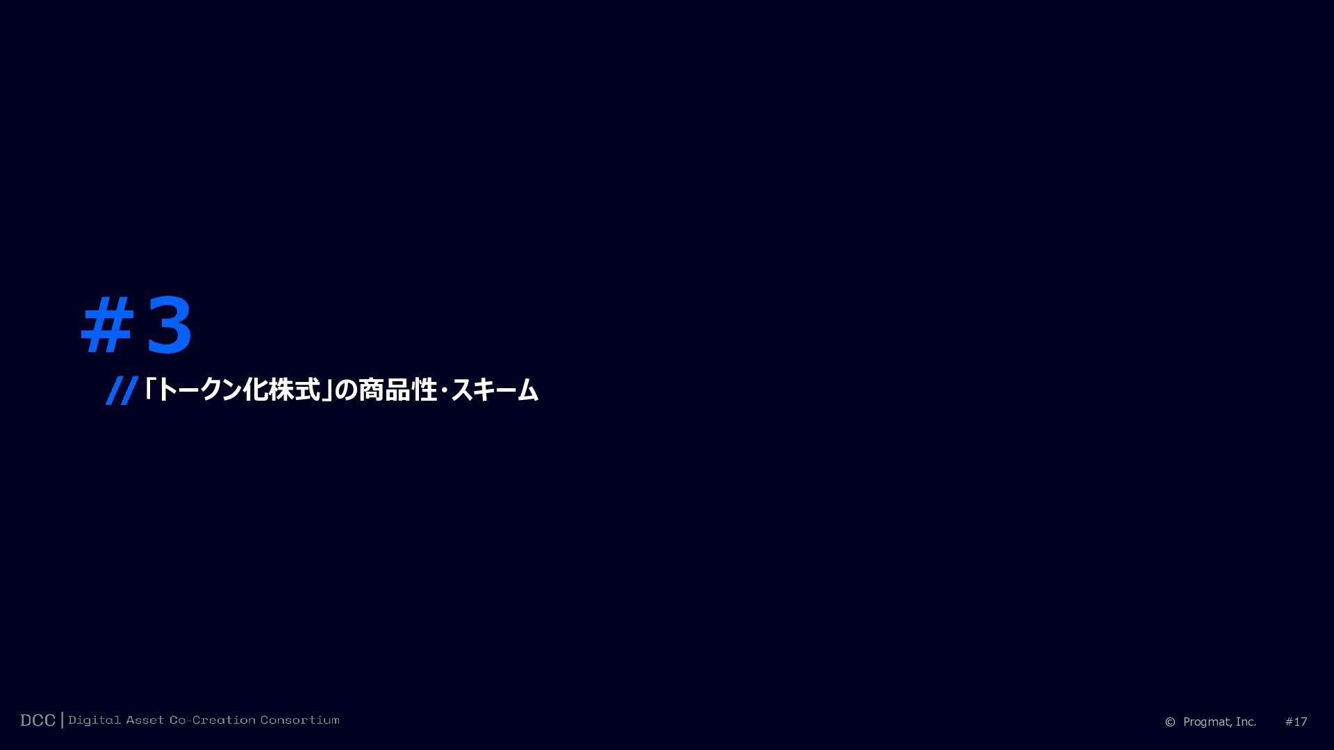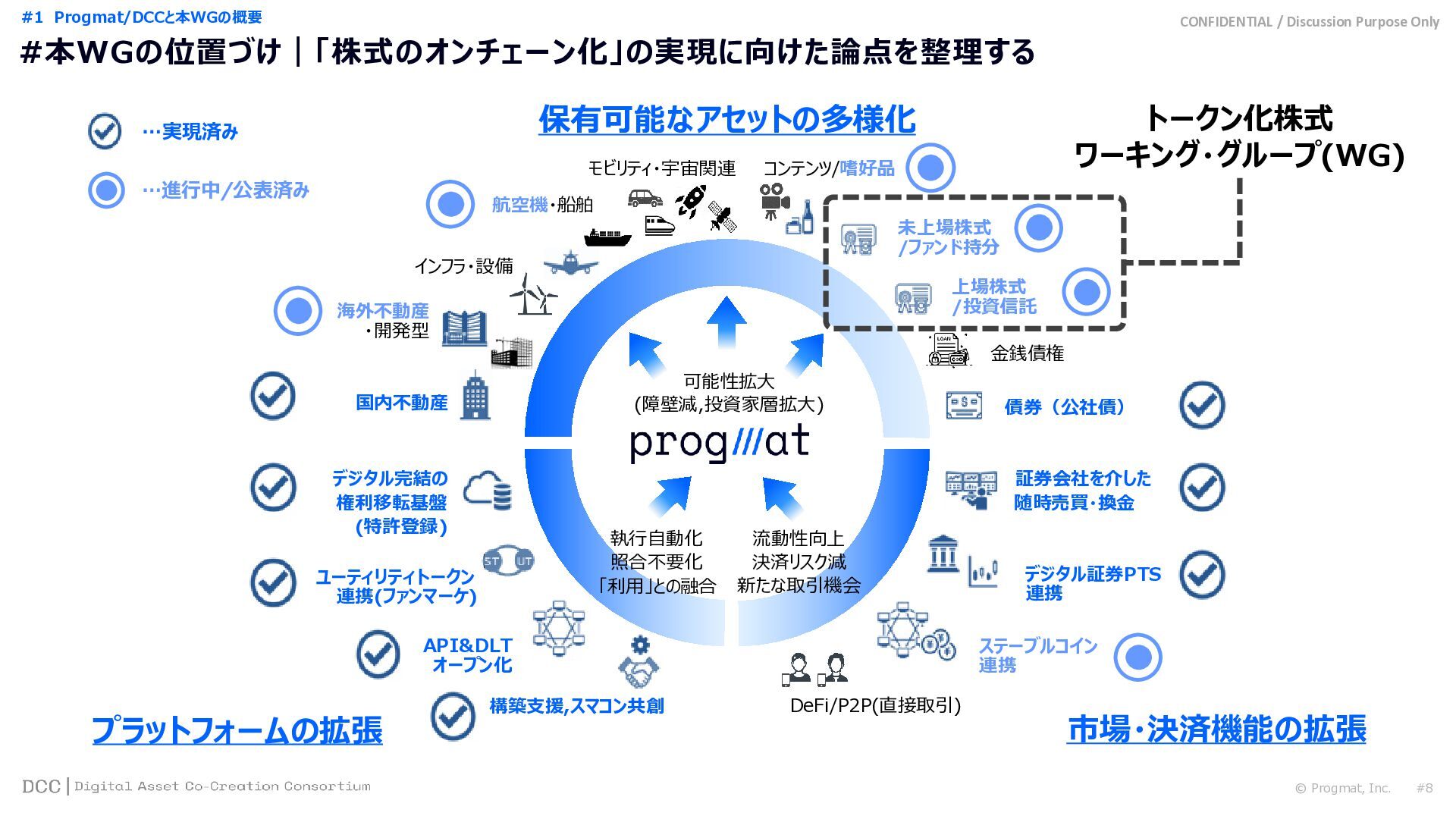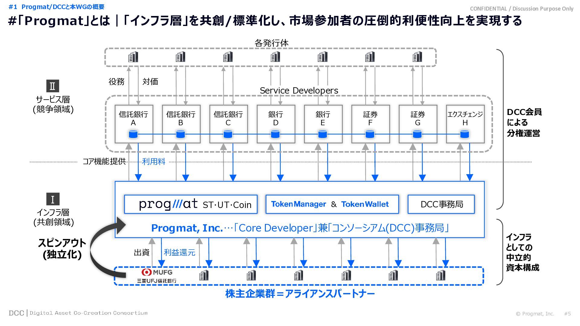 インフラ層 Ⅰ サービス層 Ⅱ Progmat, Inc.…「Core Developer」兼「コンソーシアム(DCC)事務局」 ST UT Coin DCC事務局 信託銀行 A 信託銀行 B 信託銀行 C 銀行 D 銀行 E 証券 F 証券 G エクスチェンジ H コア機能提供 利用料 & 各発行体 役務 対価 Service Developers 株主企業群=アライアンスパートナー 出資 利益還元 スピンアウト (独立化) DCC会員 による 分権運営 インフラ としての 中立的 資本構成 (競争領域) (共創領域) #1 Progmat/DCCと本WGの概要