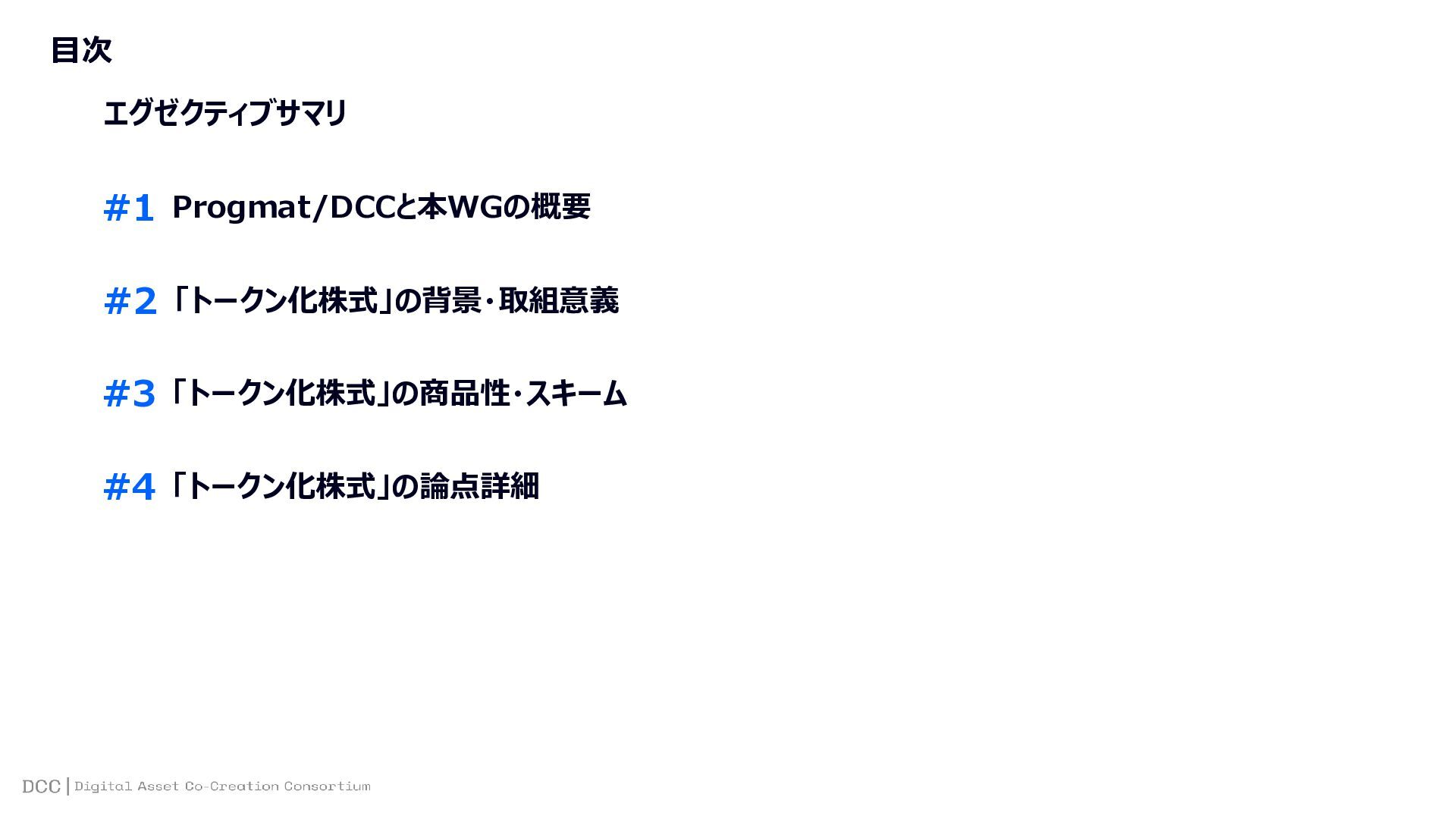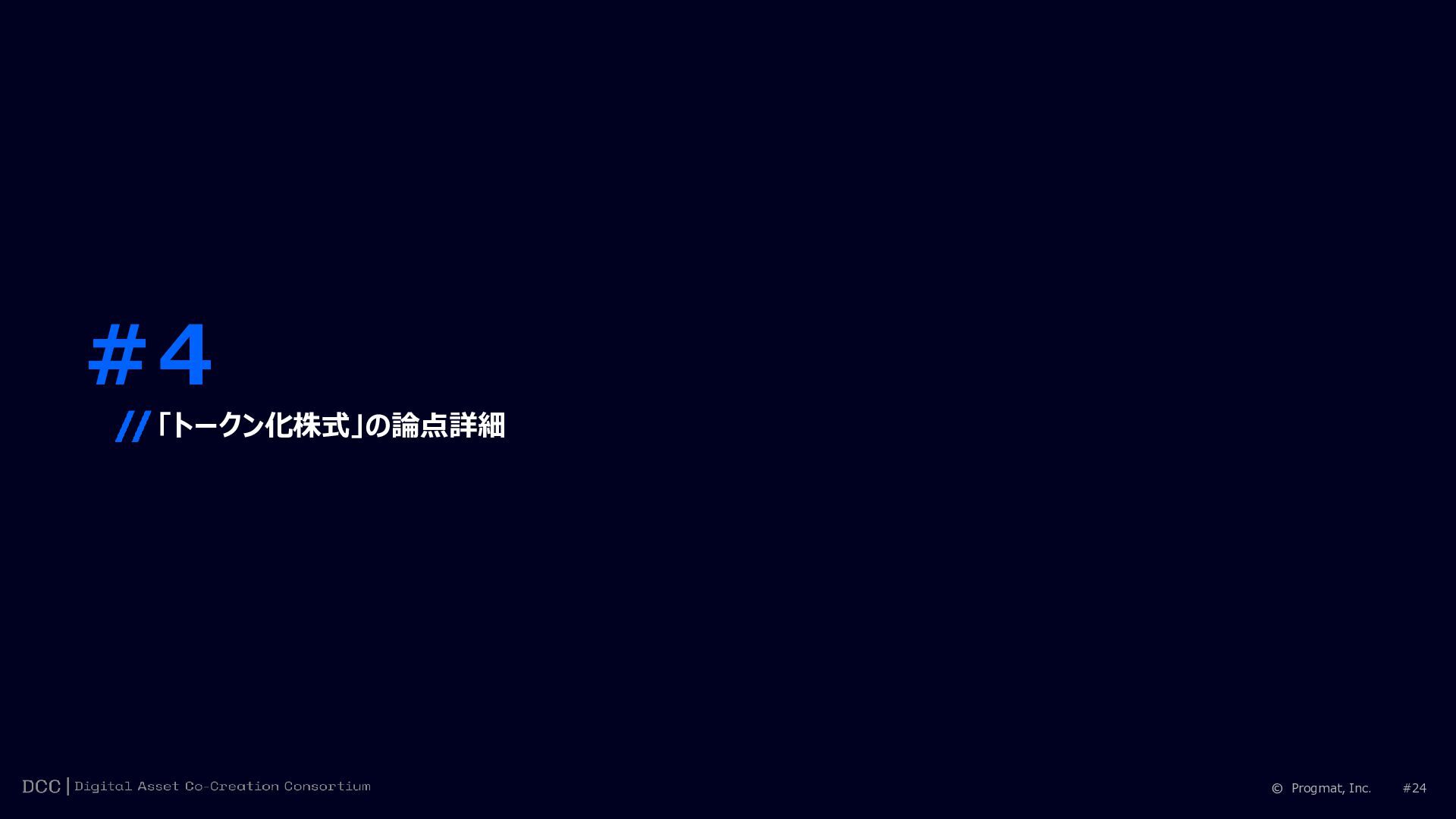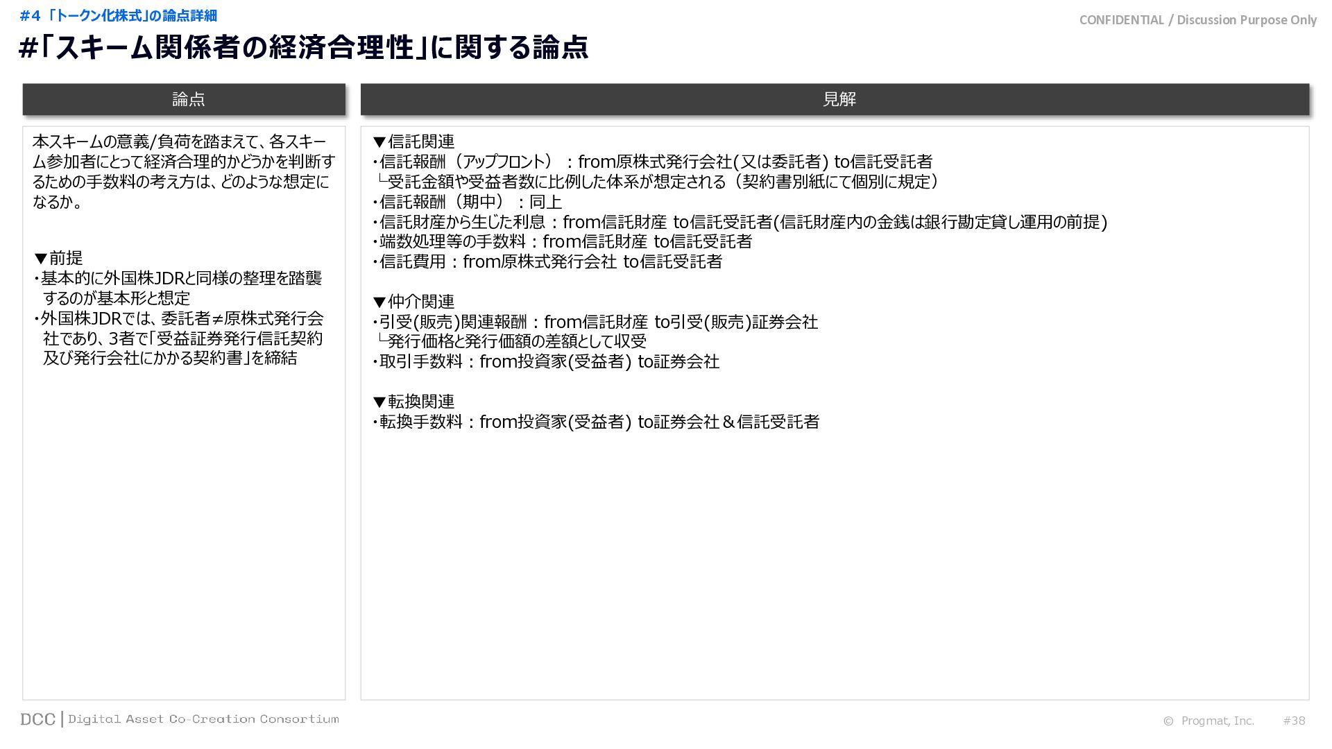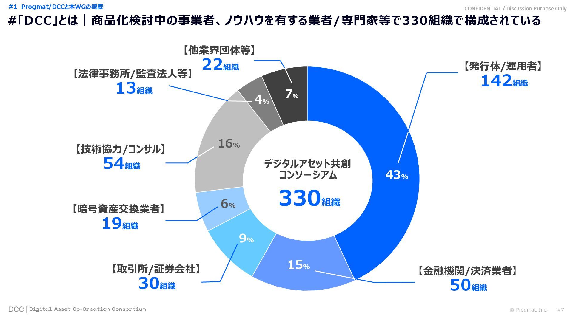 インフラ層 Ⅰ サービス層 Ⅱ Progmat, Inc.…「Core Developer」兼「コンソーシアム(DCC)事務局」 ST UT Coin DCC事務局 信託銀行 A 信託銀行 B 信託銀行 C 銀行 D 銀行 E 証券 F 証券 G エクスチェンジ H コア機能提供 利用料 & 各発行体 役務 対価 Service Developers 株主企業群=アライアンスパートナー 出資 利益還元 スピンアウト (独立化) DCC会員 による 分権運営 インフラ としての 中立的 資本構成 (競争領域) (共創領域) #1 Progmat/DCCと本WGの概要