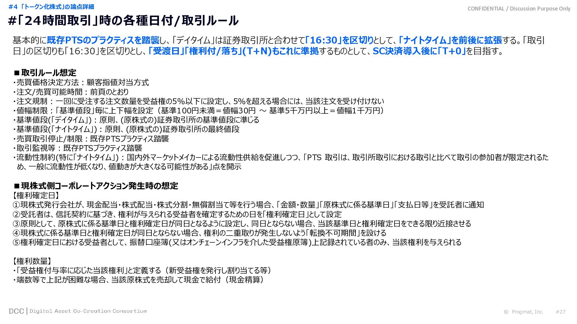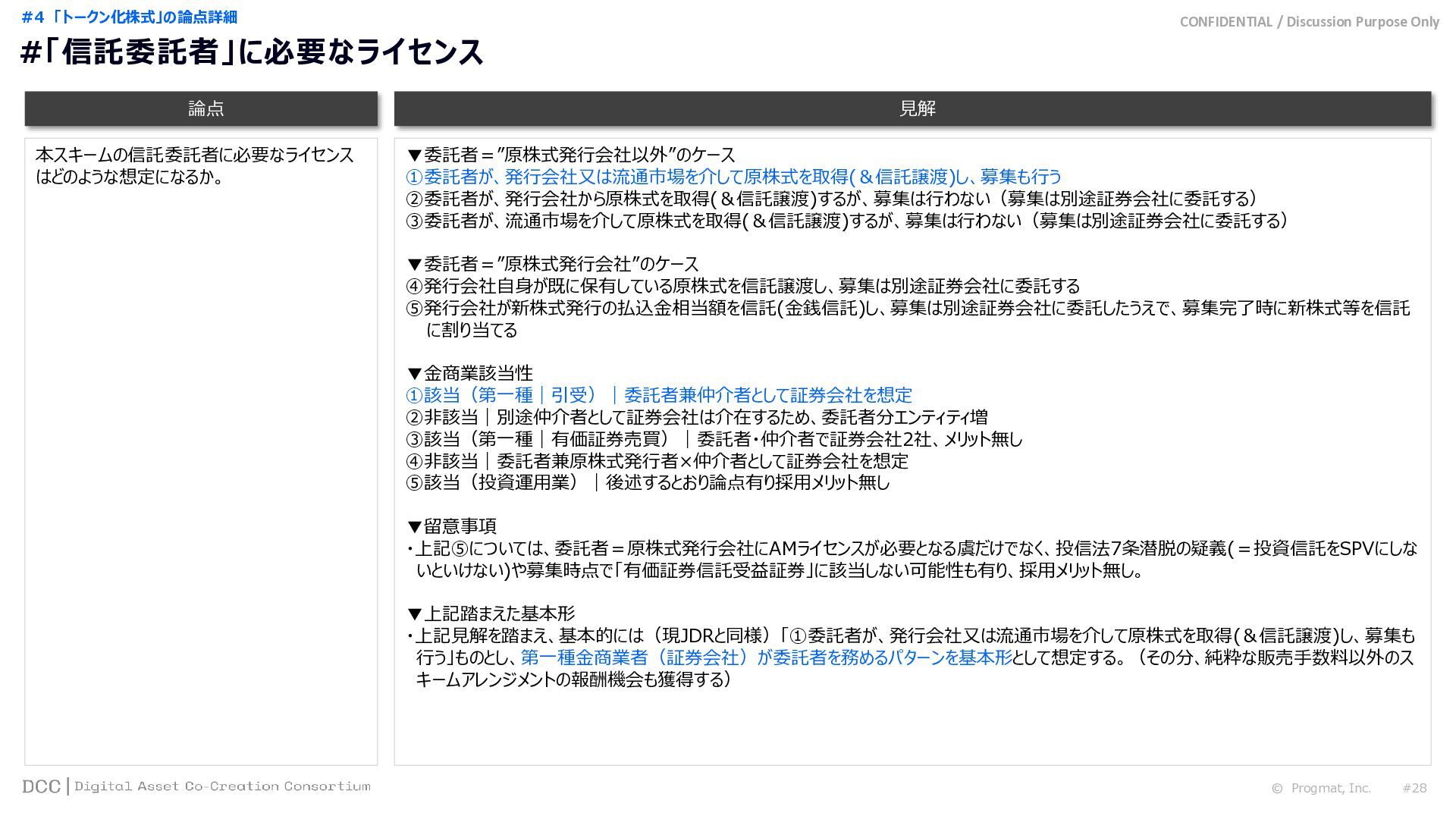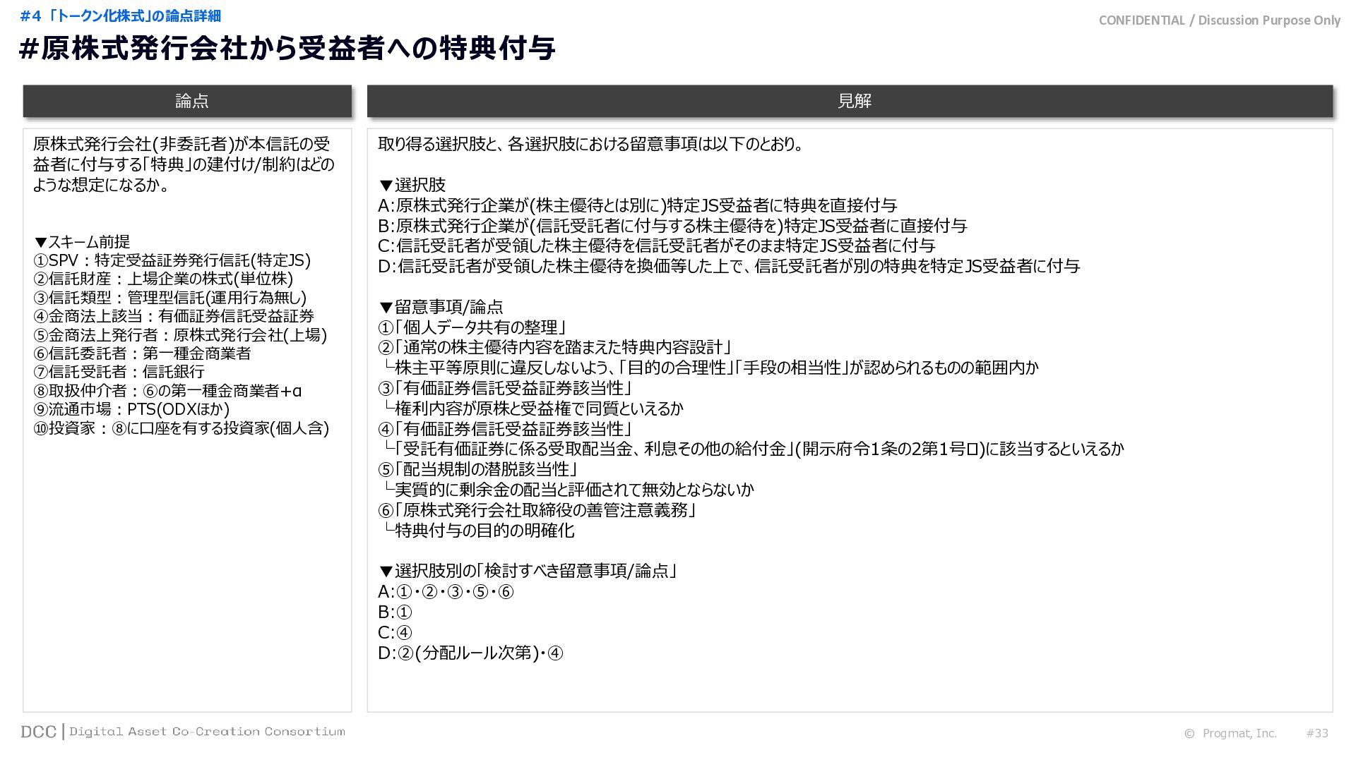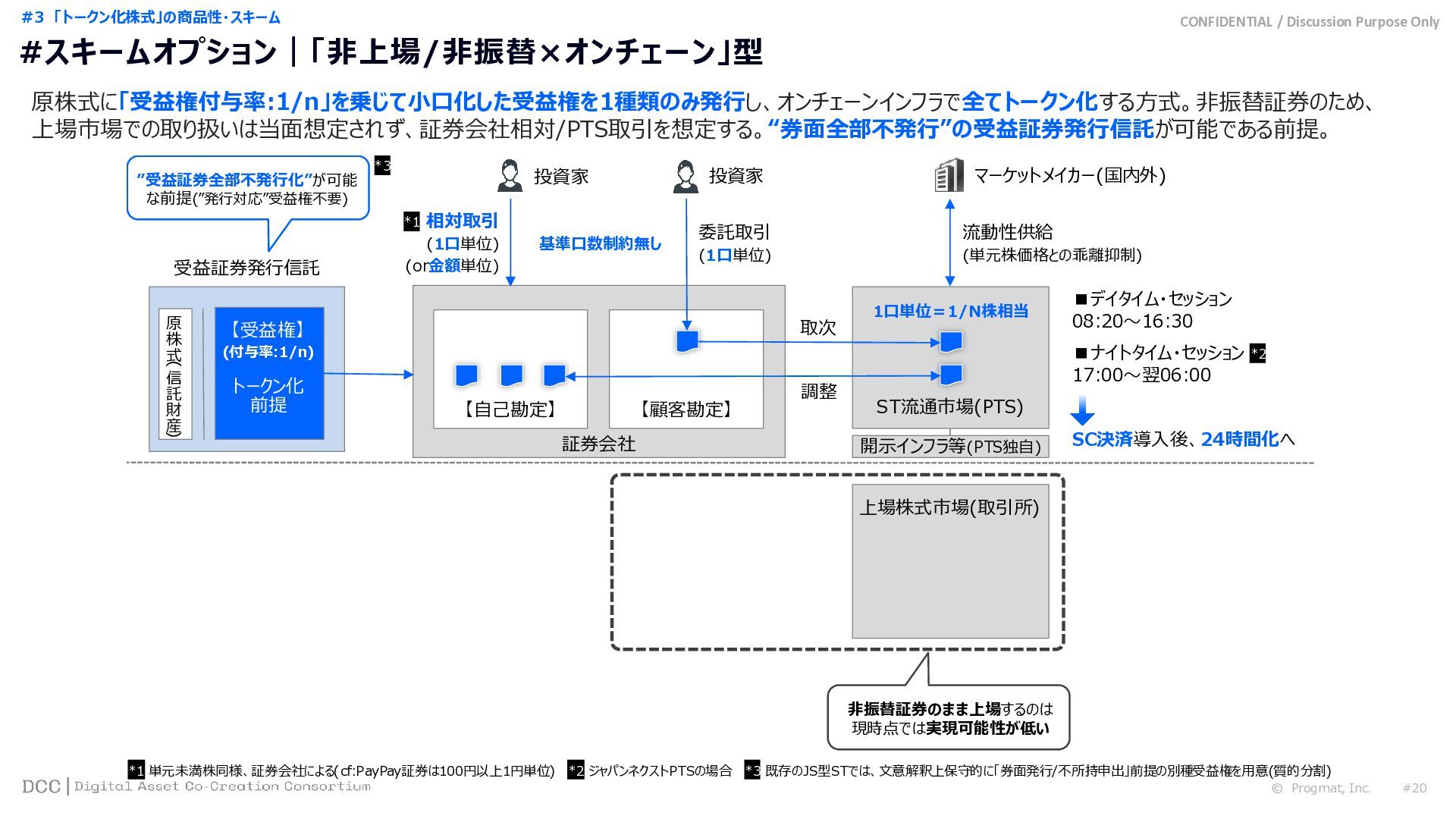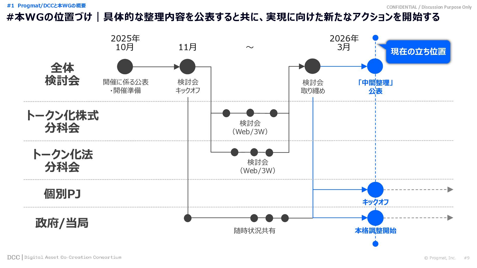 インフラ層 Ⅰ サービス層 Ⅱ Progmat, Inc.…「Core Developer」兼「コンソーシアム(DCC)事務局」 ST UT Coin DCC事務局 信託銀行 A 信託銀行 B 信託銀行 C 銀行 D 銀行 E 証券 F 証券 G エクスチェンジ H コア機能提供 利用料 & 各発行体 役務 対価 Service Developers 株主企業群=アライアンスパートナー 出資 利益還元 スピンアウト (独立化) DCC会員 による 分権運営 インフラ としての 中立的 資本構成 (競争領域) (共創領域) #1 Progmat/DCCと本WGの概要