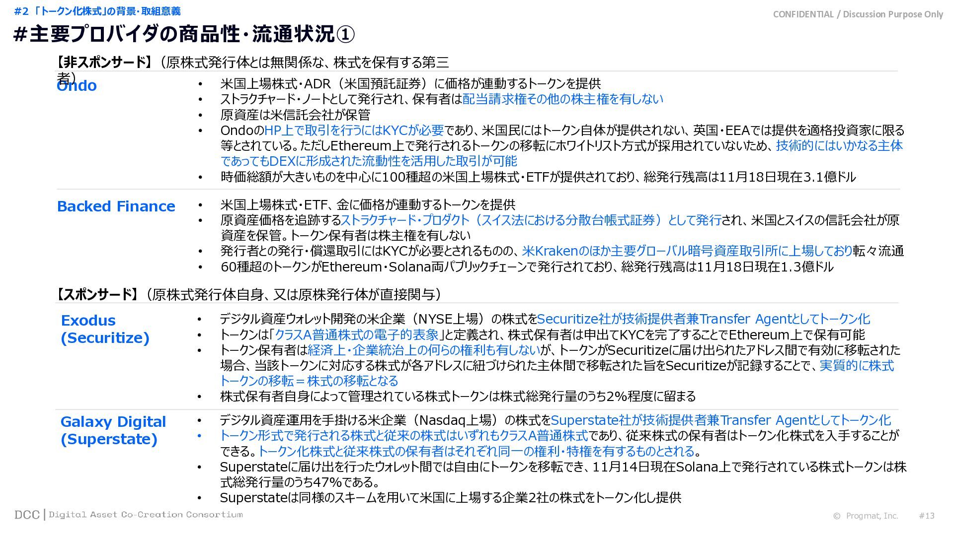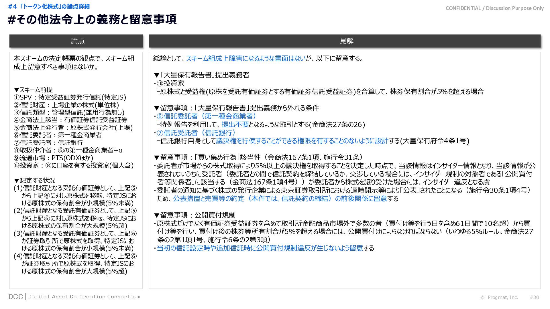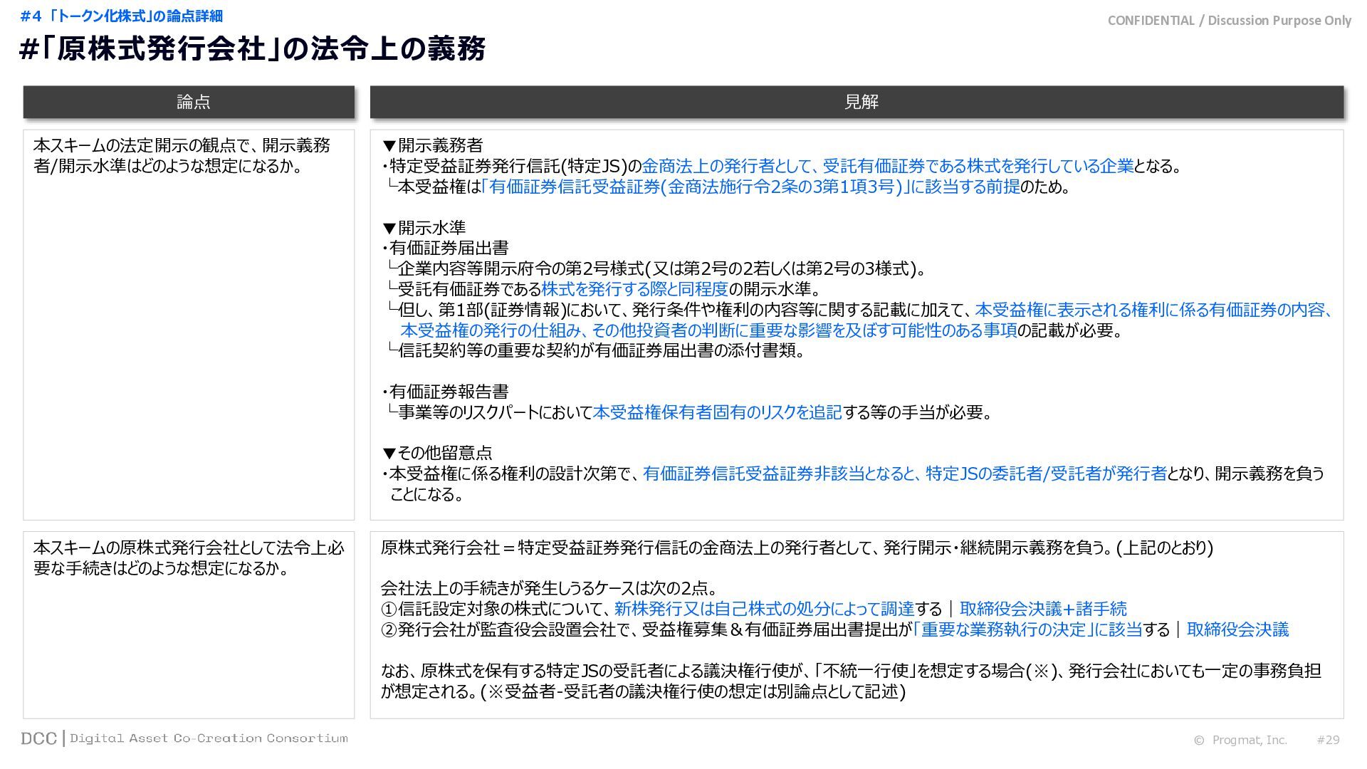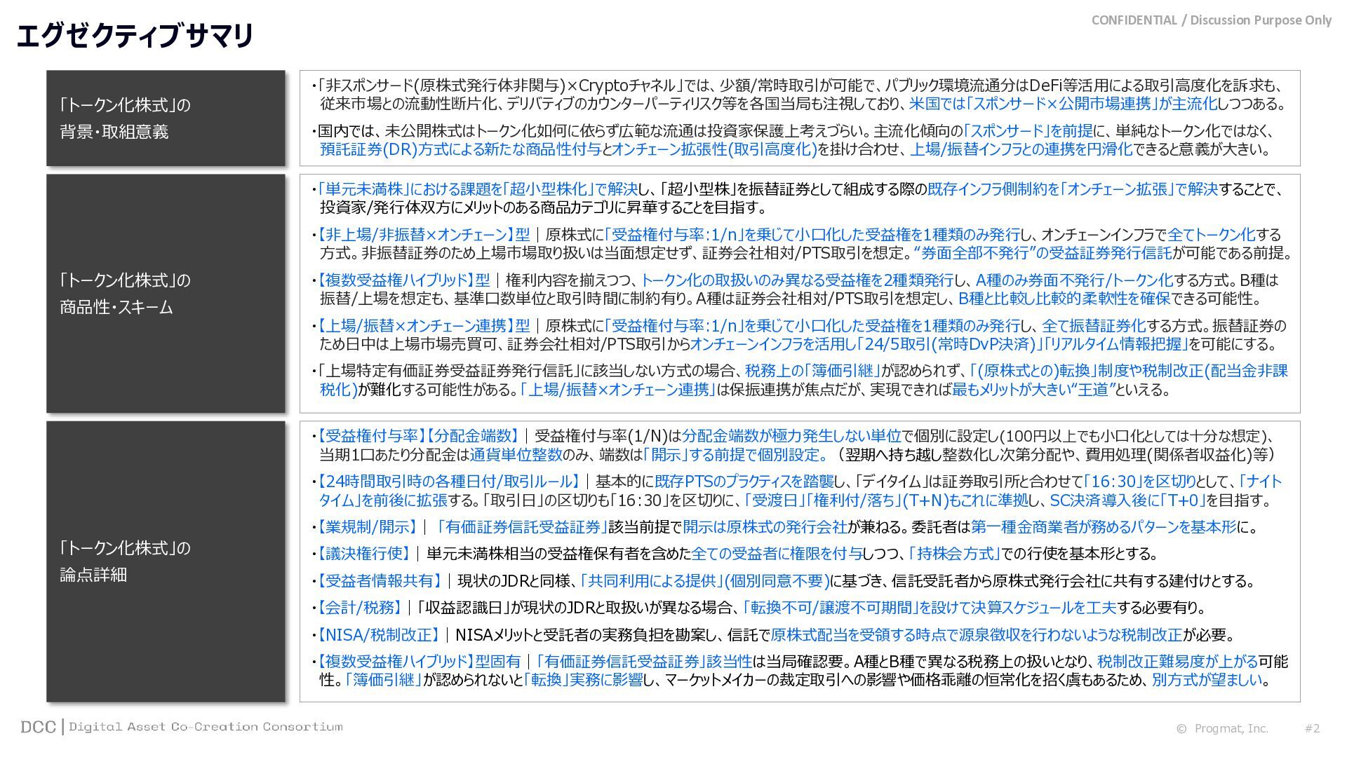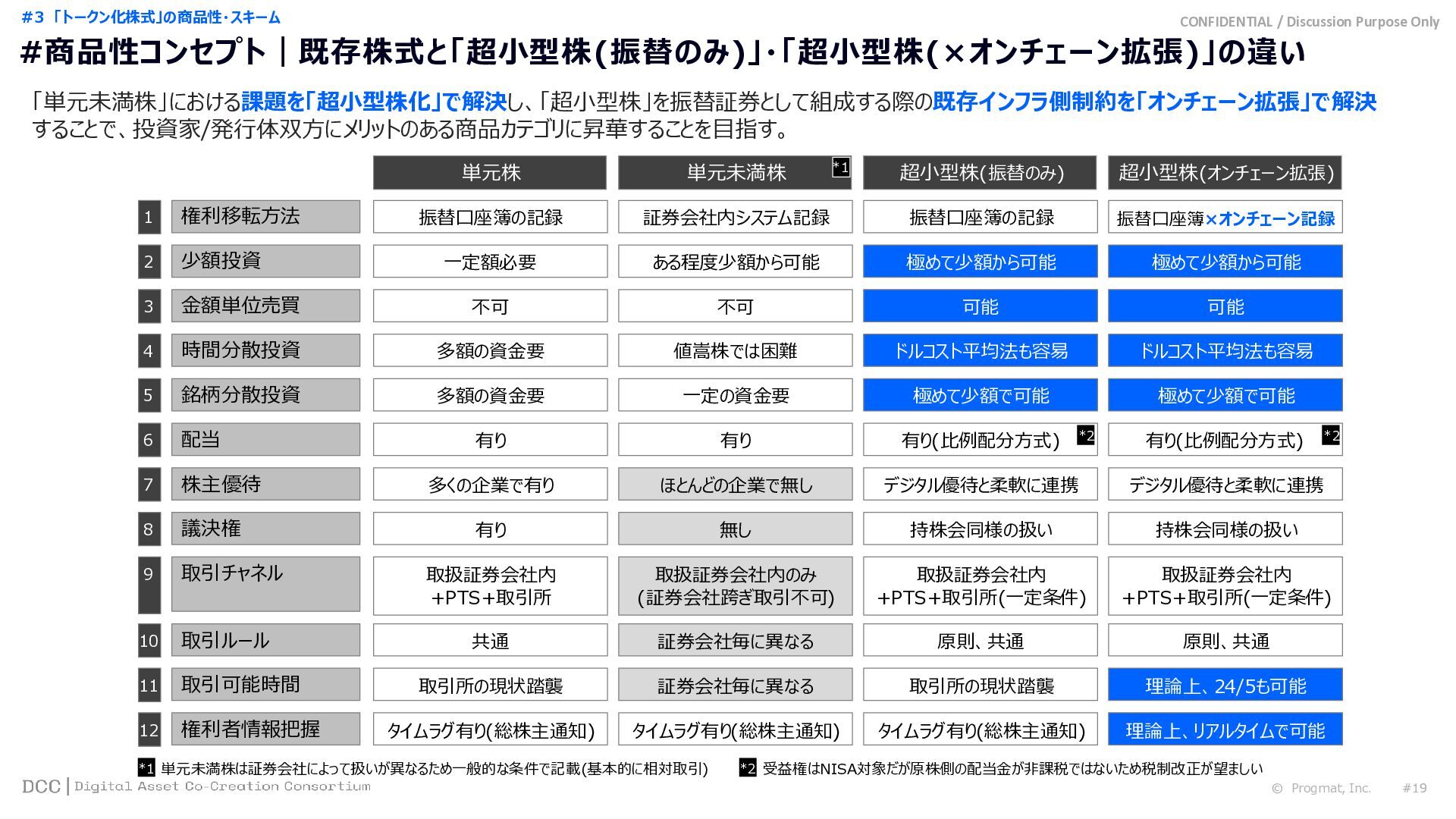 インフラ層 Ⅰ サービス層 Ⅱ Progmat, Inc.…「Core Developer」兼「コンソーシアム(DCC)事務局」 ST UT Coin DCC事務局 信託銀行 A 信託銀行 B 信託銀行 C 銀行 D 銀行 E 証券 F 証券 G エクスチェンジ H コア機能提供 利用料 & 各発行体 役務 対価 Service Developers 株主企業群=アライアンスパートナー 出資 利益還元 スピンアウト (独立化) DCC会員 による 分権運営 インフラ としての 中立的 資本構成 (競争領域) (共創領域) #1 Progmat/DCCと本WGの概要