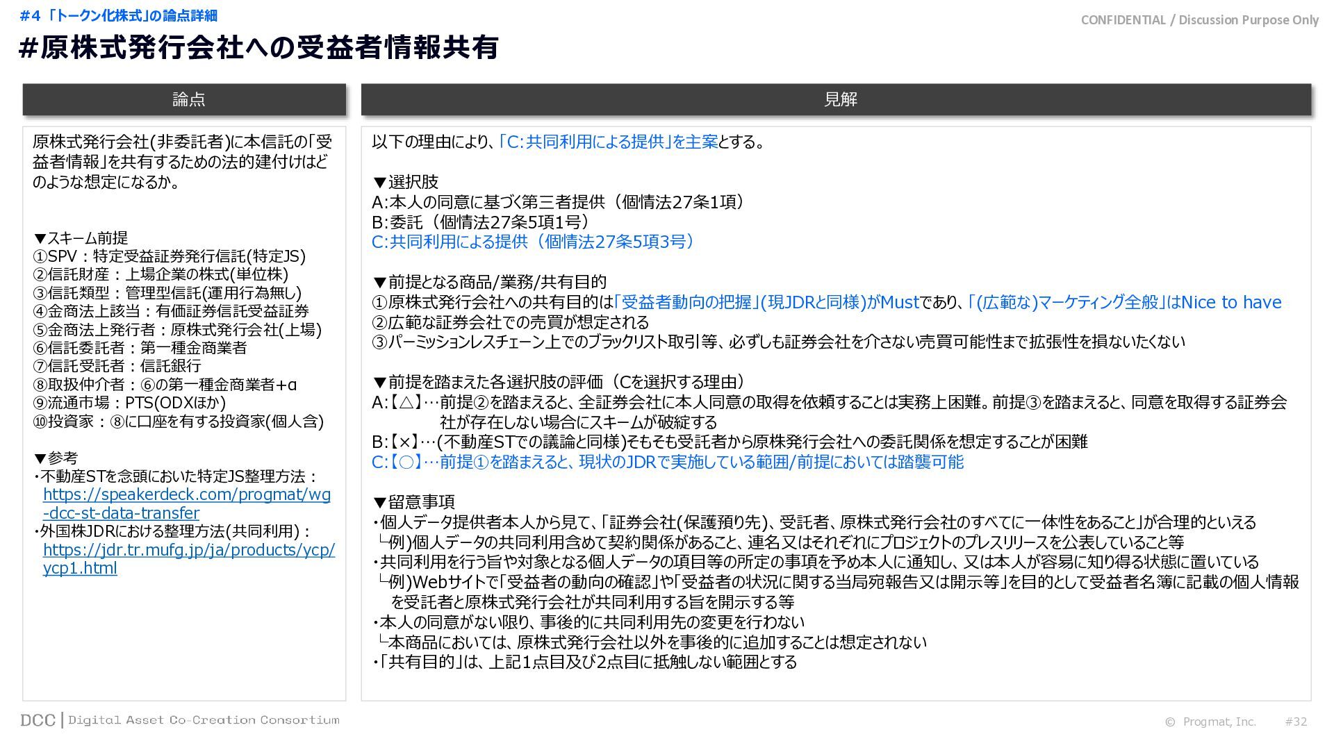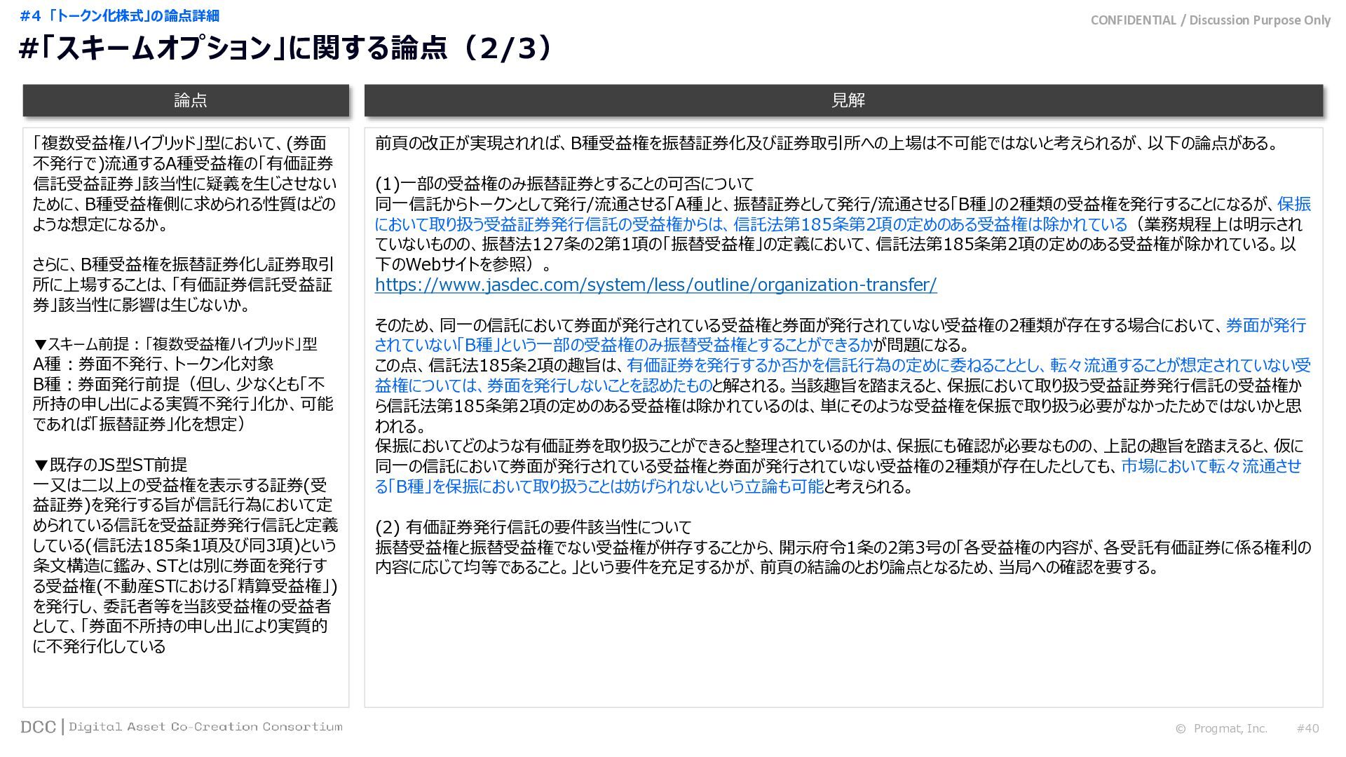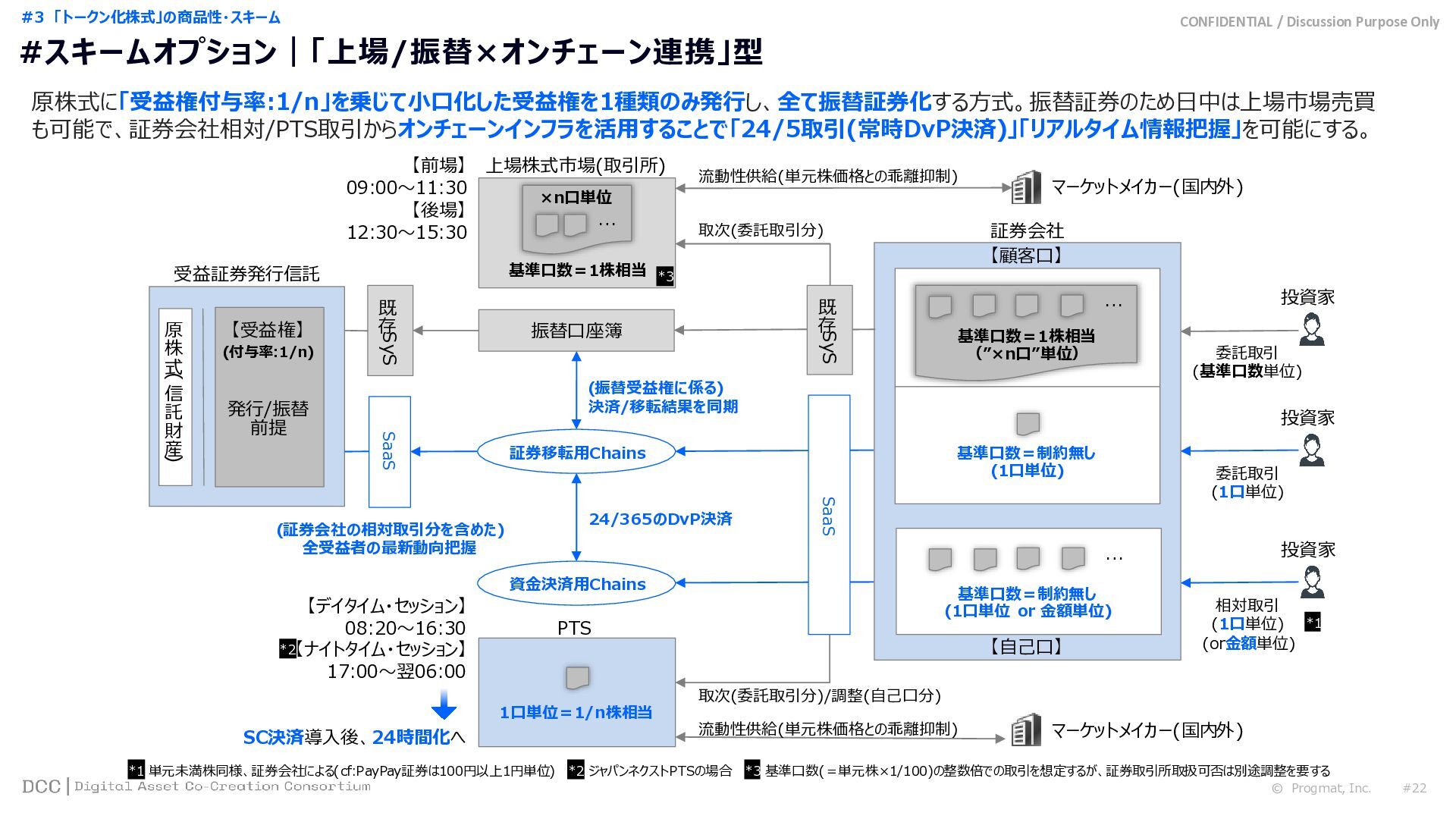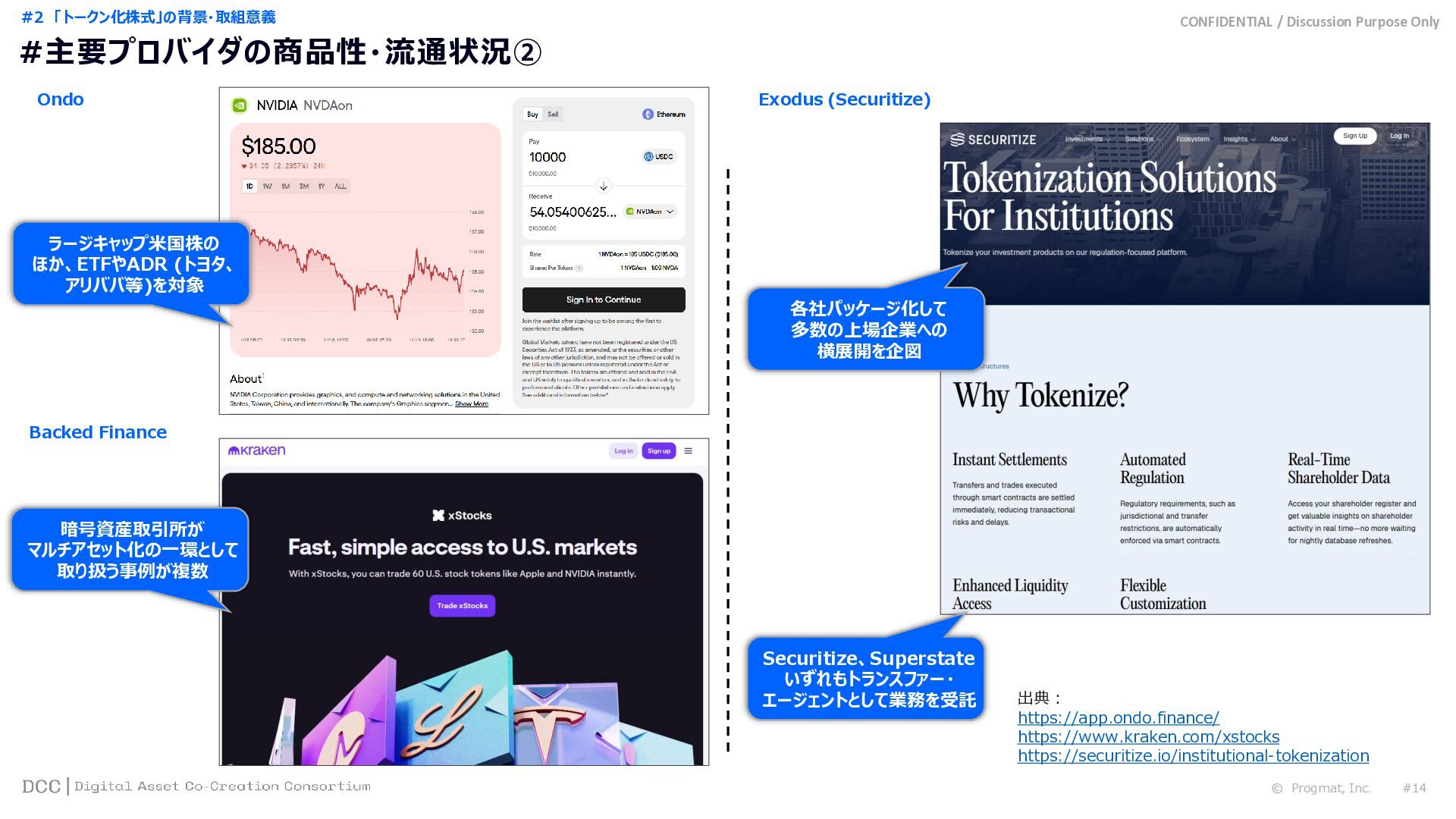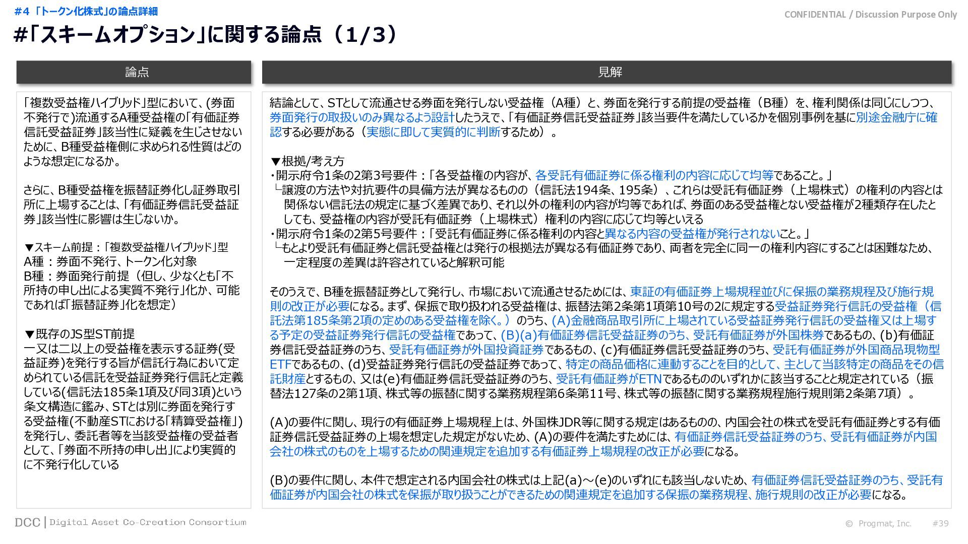インフラ層 Ⅰ サービス層 Ⅱ Progmat, Inc.…「Core Developer」兼「コンソーシアム(DCC)事務局」 ST UT Coin DCC事務局 信託銀行 A 信託銀行 B 信託銀行 C 銀行 D 銀行 E 証券 F 証券 G エクスチェンジ H コア機能提供 利用料 & 各発行体 役務 対価 Service Developers 株主企業群=アライアンスパートナー 出資 利益還元 スピンアウト (独立化) DCC会員 による 分権運営 インフラ としての 中立的 資本構成 (競争領域) (共創領域) #1 Progmat/DCCと本WGの概要