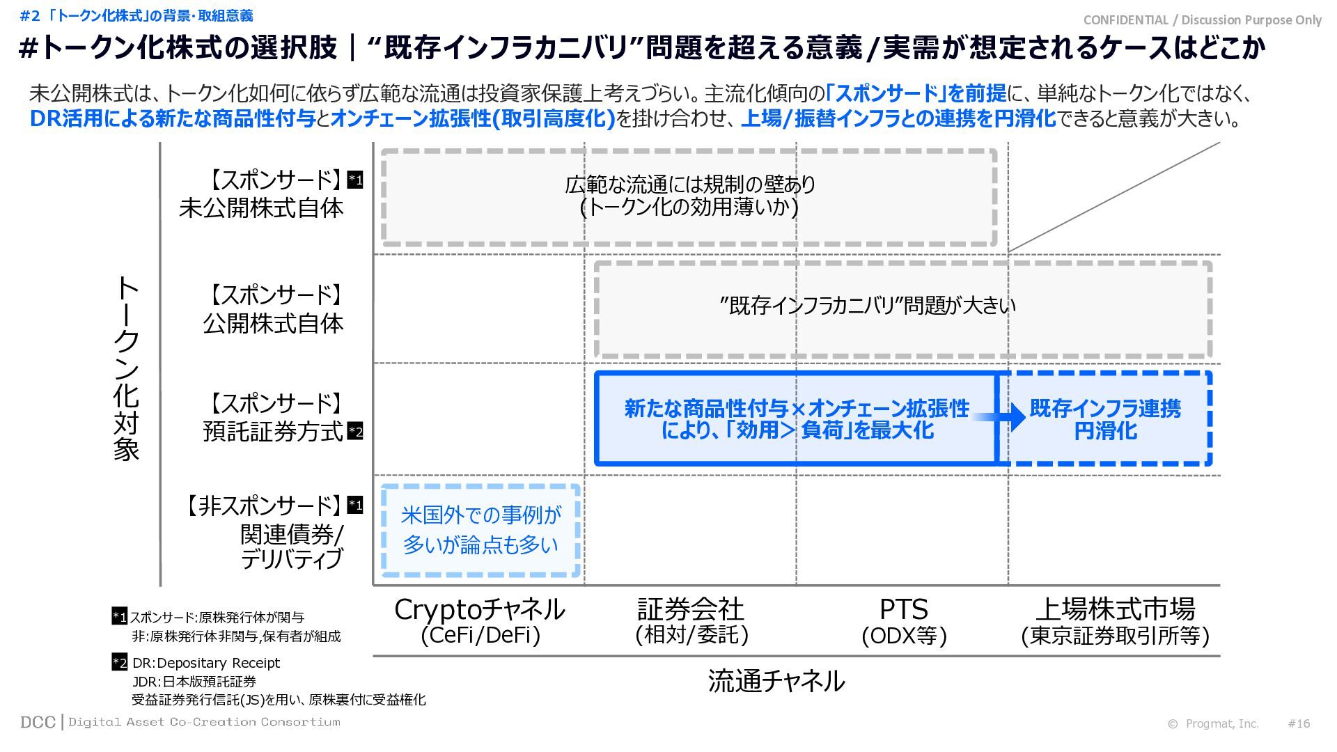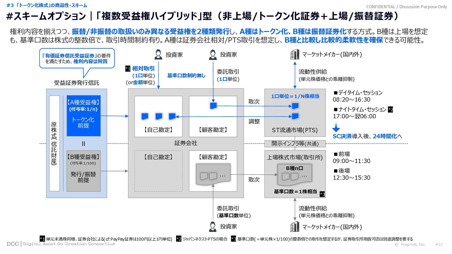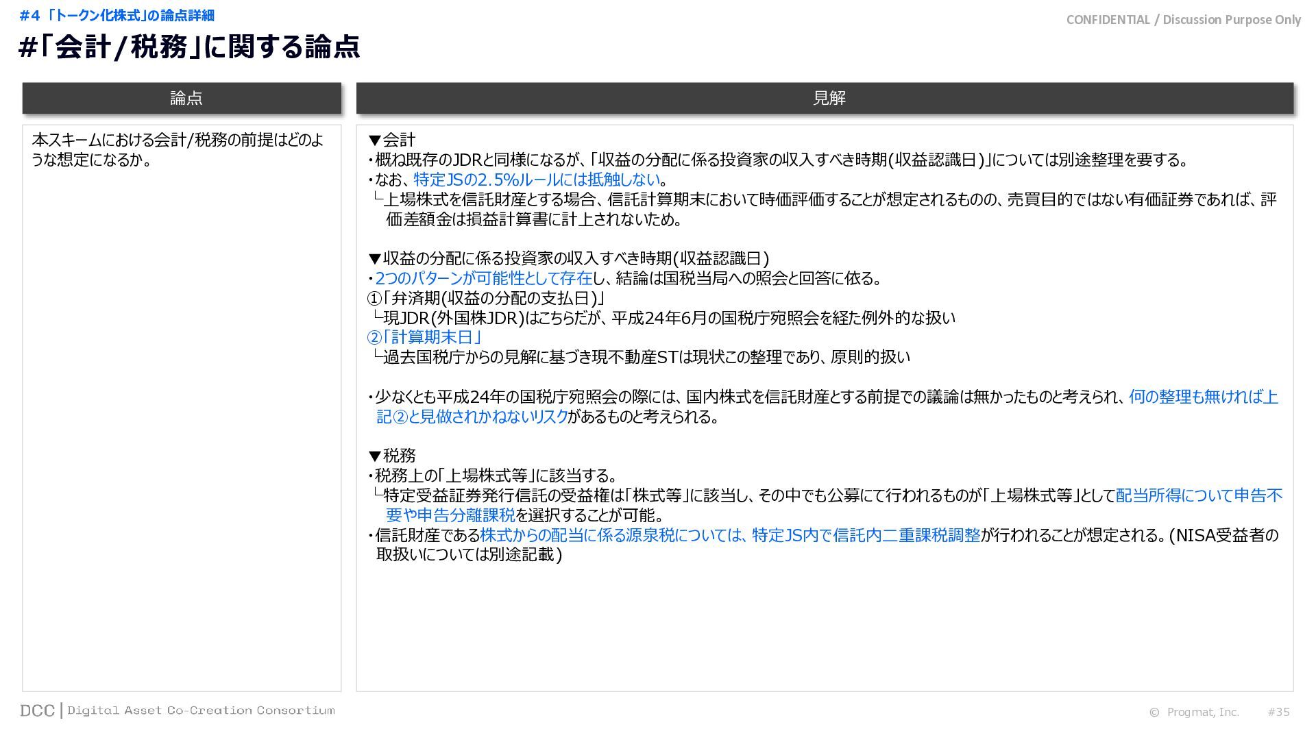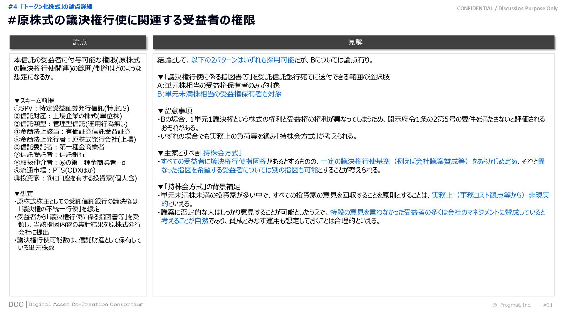 インフラ層 Ⅰ サービス層 Ⅱ Progmat, Inc.…「Core Developer」兼「コンソーシアム(DCC)事務局」 ST UT Coin DCC事務局 信託銀行 A 信託銀行 B 信託銀行 C 銀行 D 銀行 E 証券 F 証券 G エクスチェンジ H コア機能提供 利用料 & 各発行体 役務 対価 Service Developers 株主企業群=アライアンスパートナー 出資 利益還元 スピンアウト (独立化) DCC会員 による 分権運営 インフラ としての 中立的 資本構成 (競争領域) (共創領域) #1 Progmat/DCCと本WGの概要