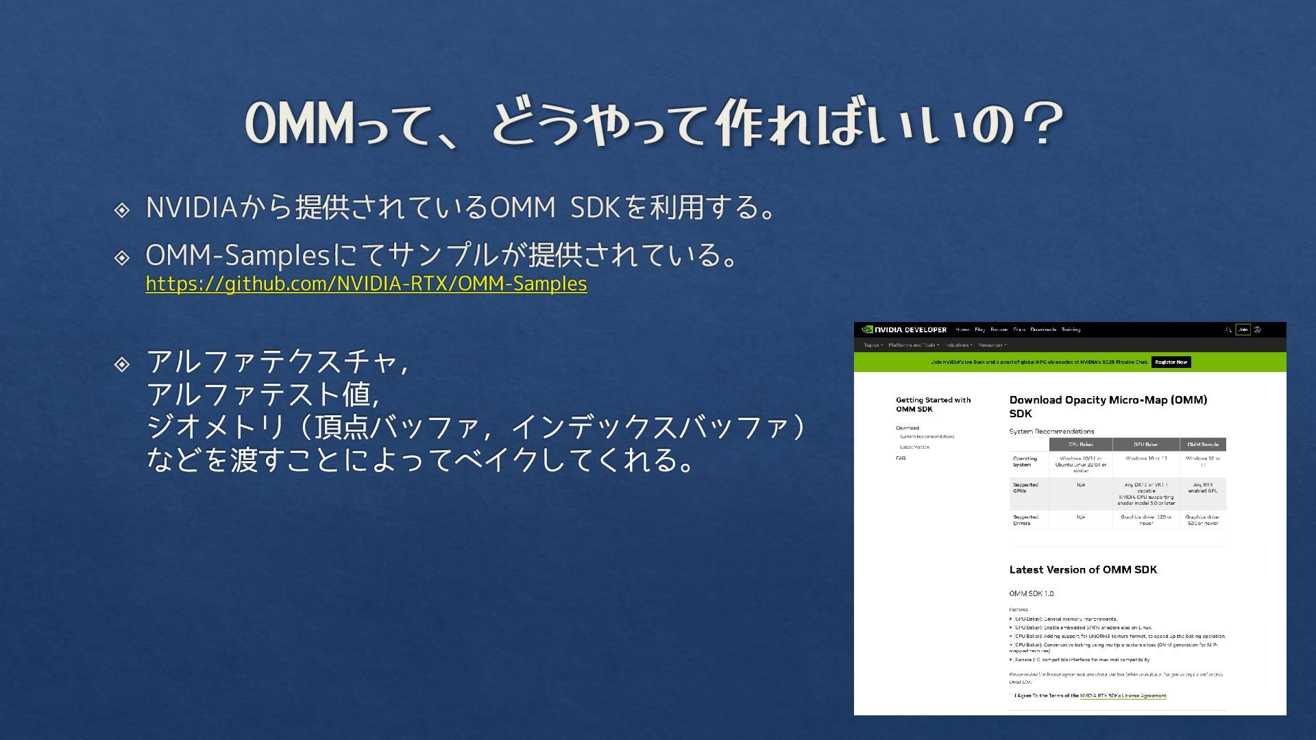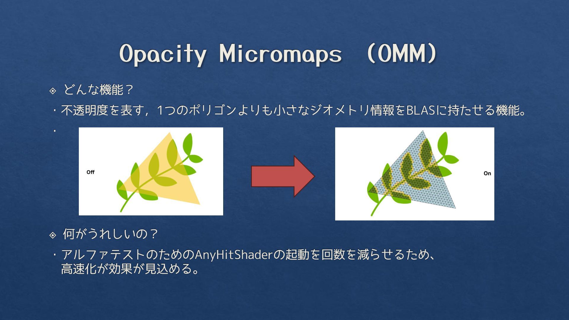 Opacity Micromaps (OMM) どんな機能? ・不透明度を表す,1つのポリゴンよりも小さなジオメトリ情報をBLASに持たせる機能。 ・ 何がうれしいの? ・アルファテストのためのAnyHitShaderの起動を回数を減らせるため、 高速化が効果が見込める。