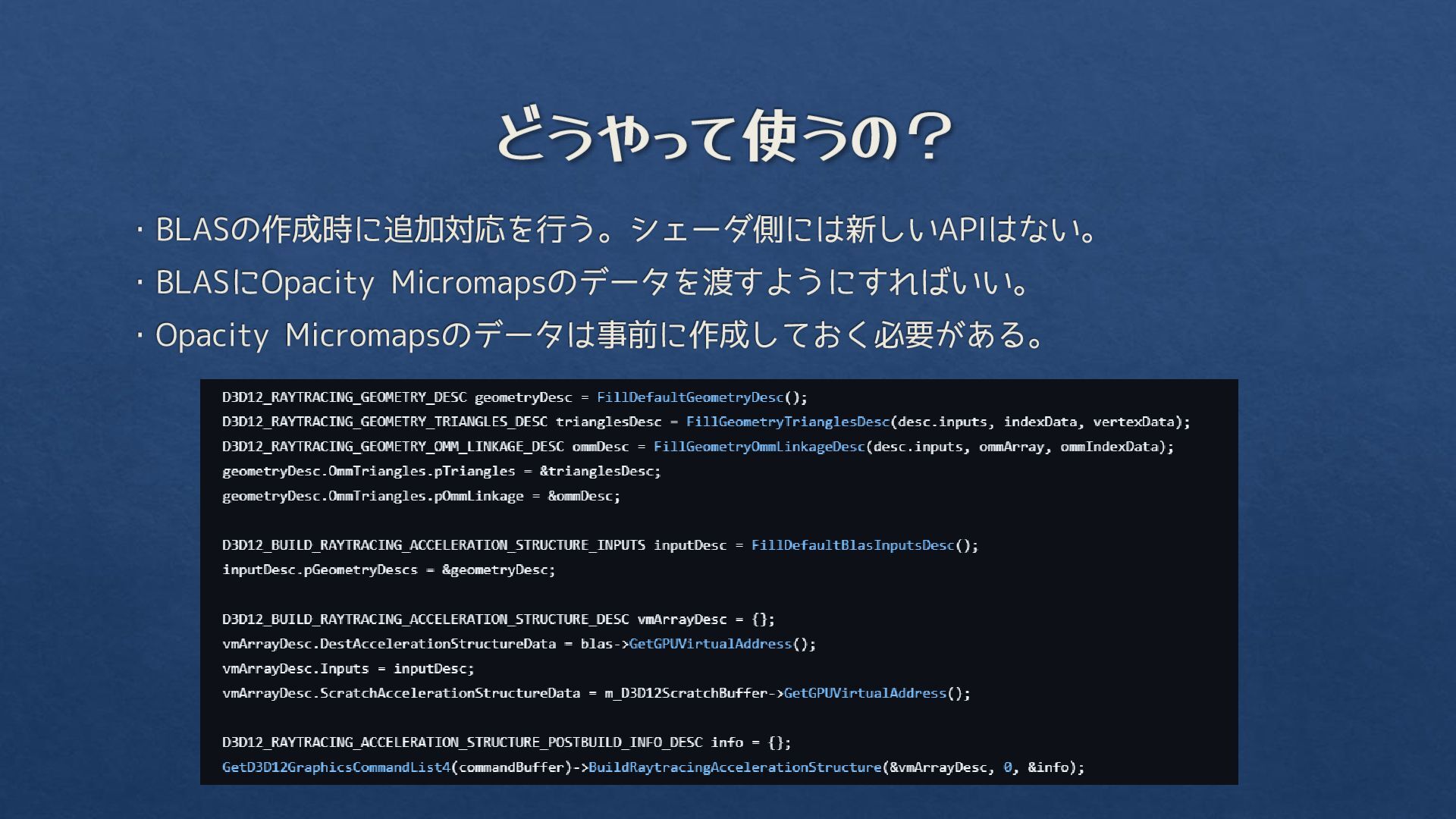 どうやって使うの? ・BLASの作成時に追加対応を行う。シェーダ側には新しいAPIはない。 ・BLASにOpacity Micromapsのデータを渡すようにすればいい。 ・Opacity Micromapsのデータは事前に作成しておく必要がある。