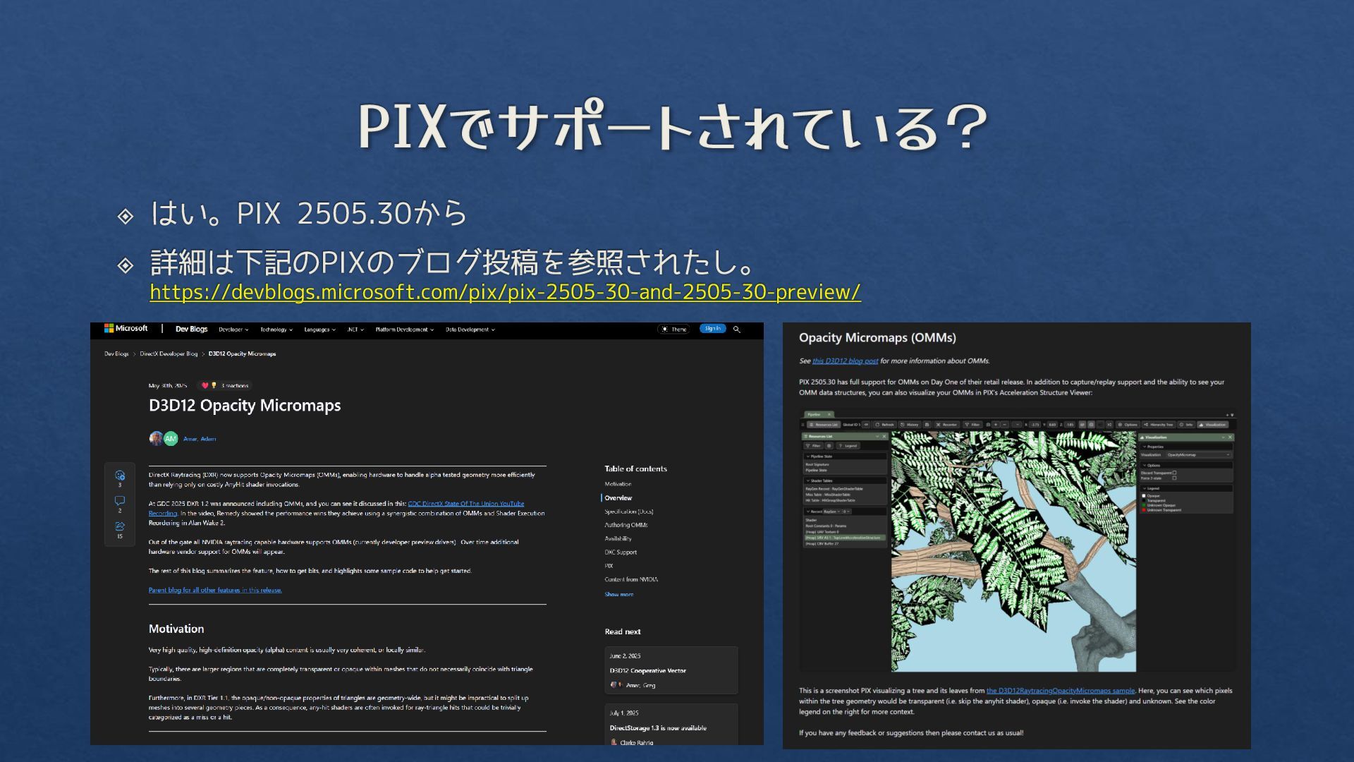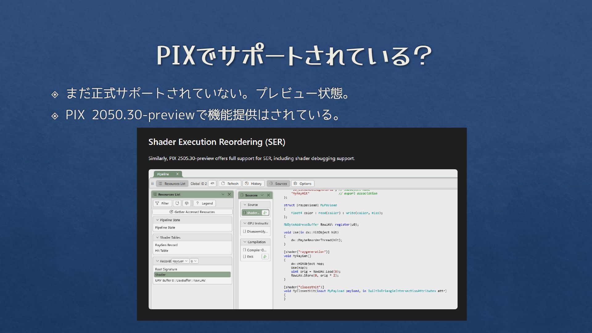 PIXでサポートされている? はい。PIX 2505.30から 詳細は下記のPIXのブログ投稿を参照されたし。 https://devblogs.microsoft.com/pix/pix-2505-30-and-2505-30-preview/