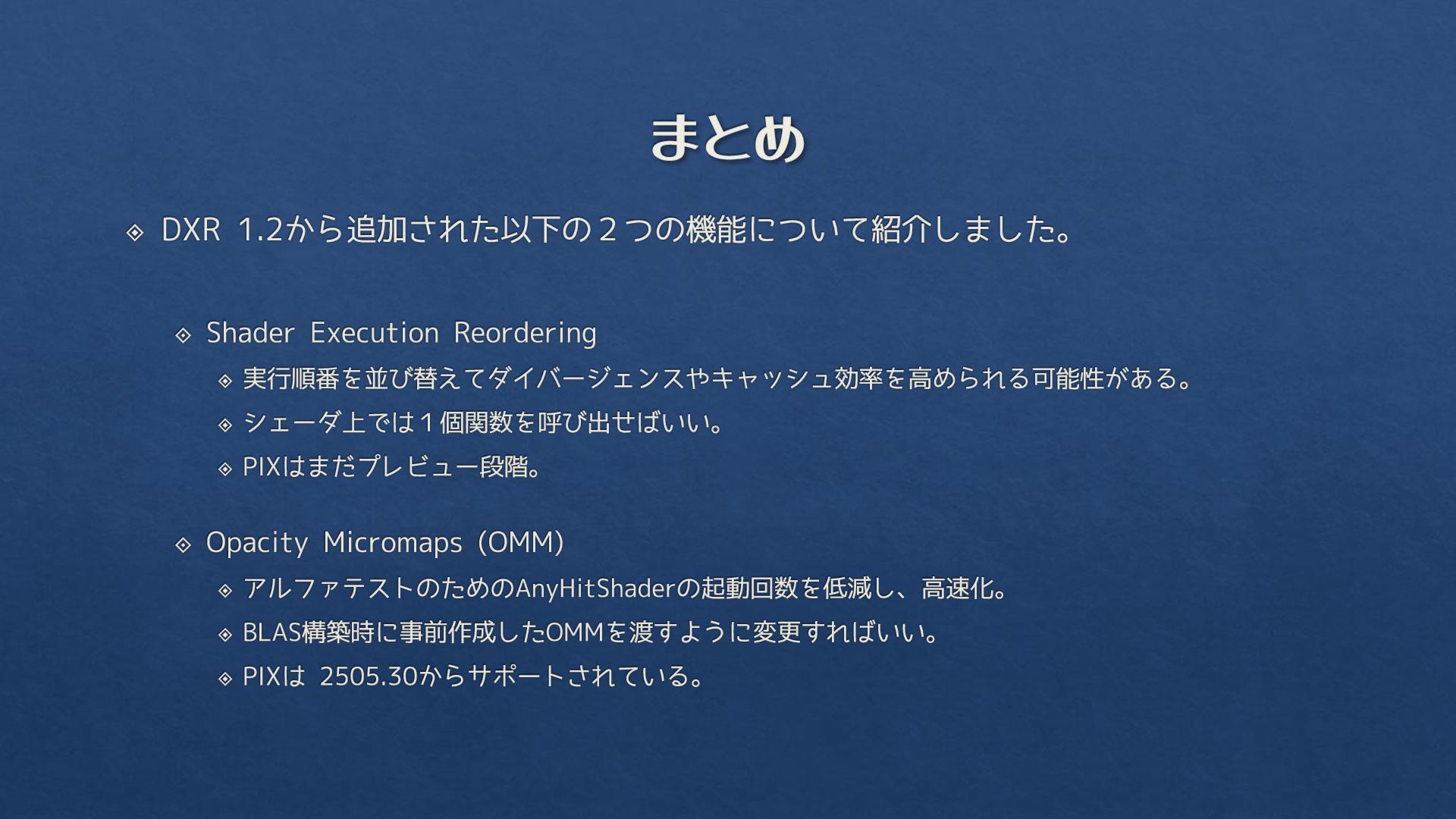 まとめ DXR 1.2から追加された以下の2つの機能について紹介しました。 Shader Execution Reordering 実行順番を並び替えてダイバージェンスやキャッシュ効率を高められる可能性がある。 シェーダ上では1個関数を呼び出せばいい。 PIXはまだプレビュー段階。 Opacity