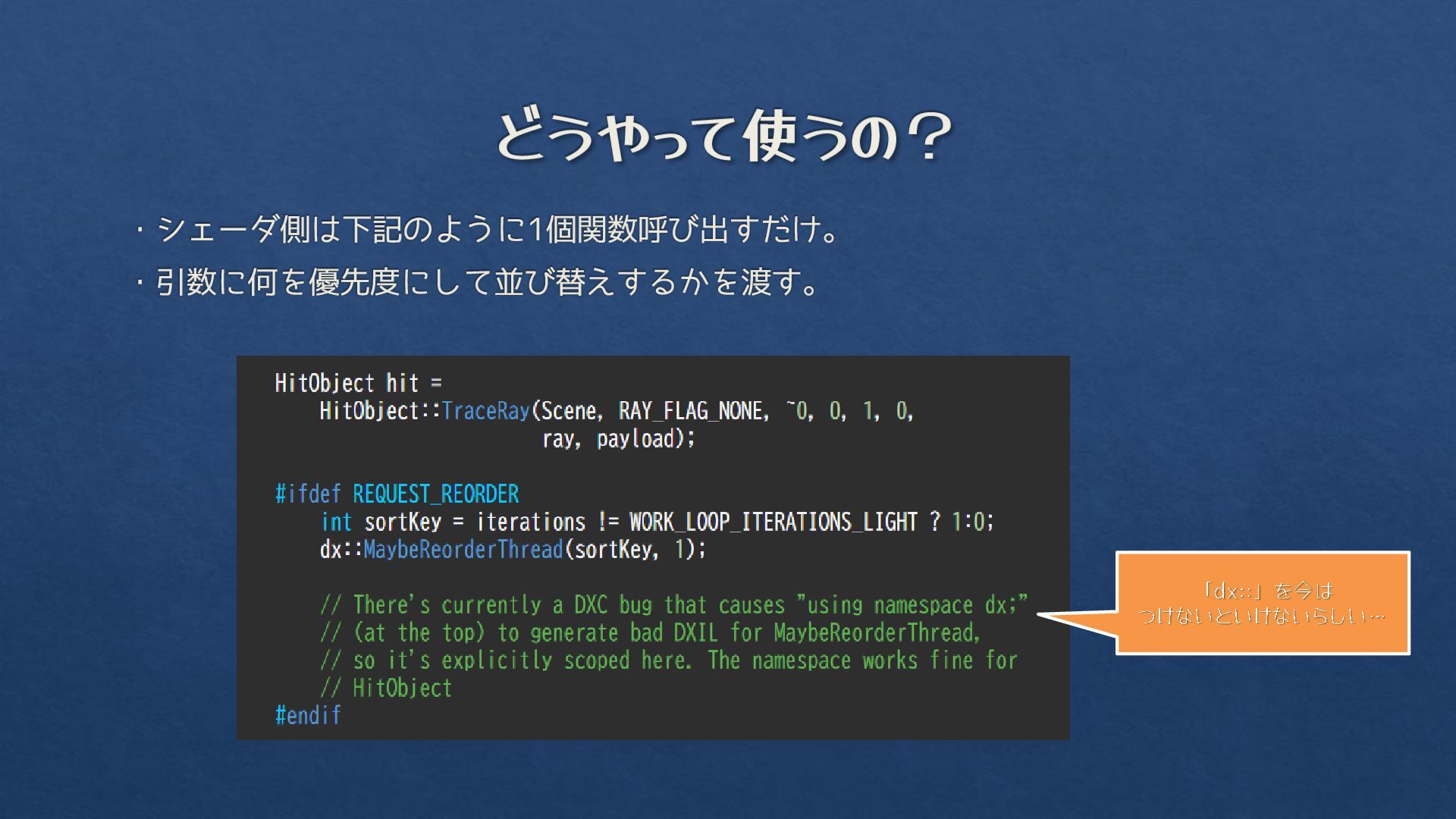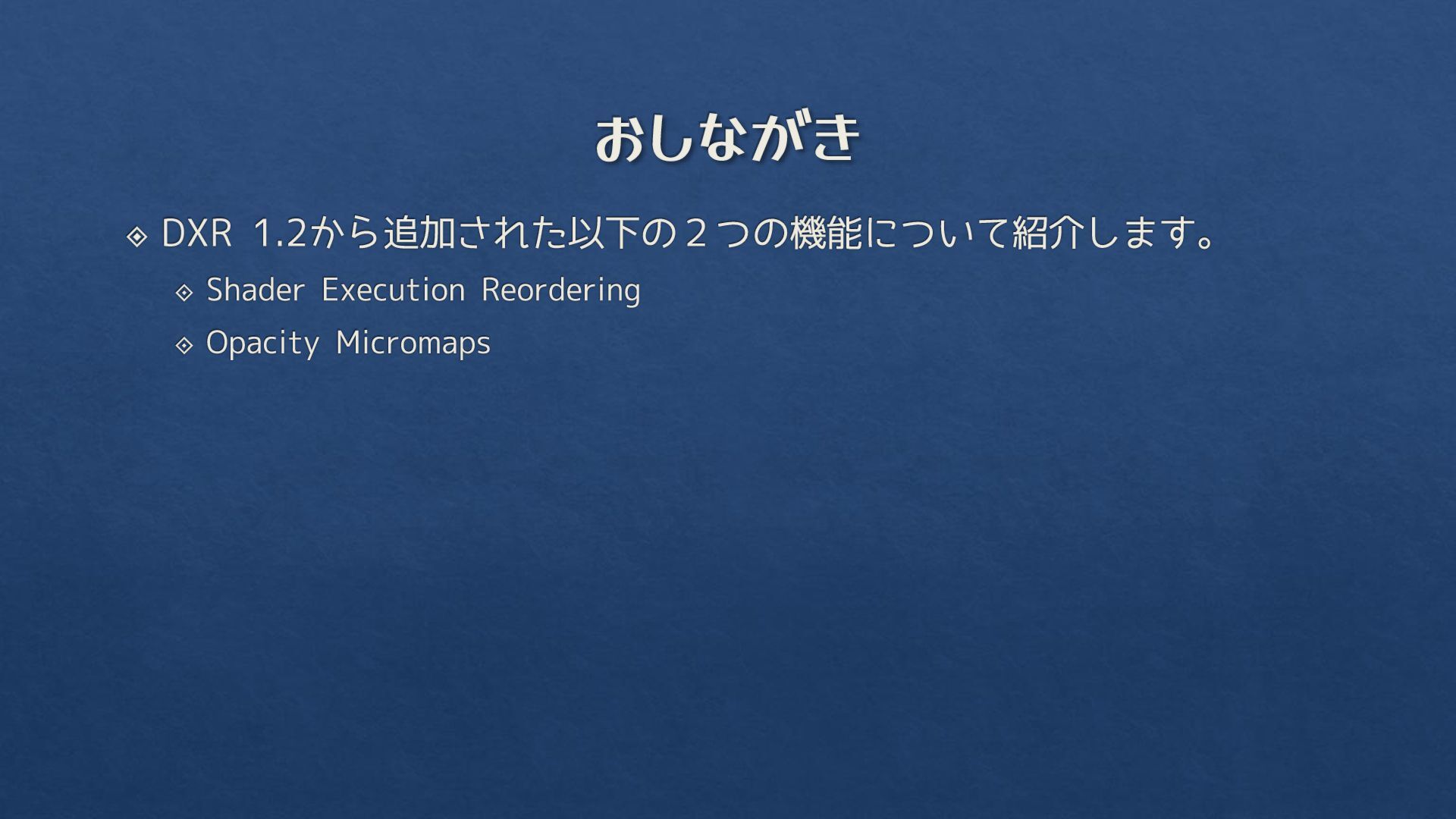 おしながき DXR 1.2から追加された以下の2つの機能について紹介します。 Shader Execution Reordering Opacity Micromaps