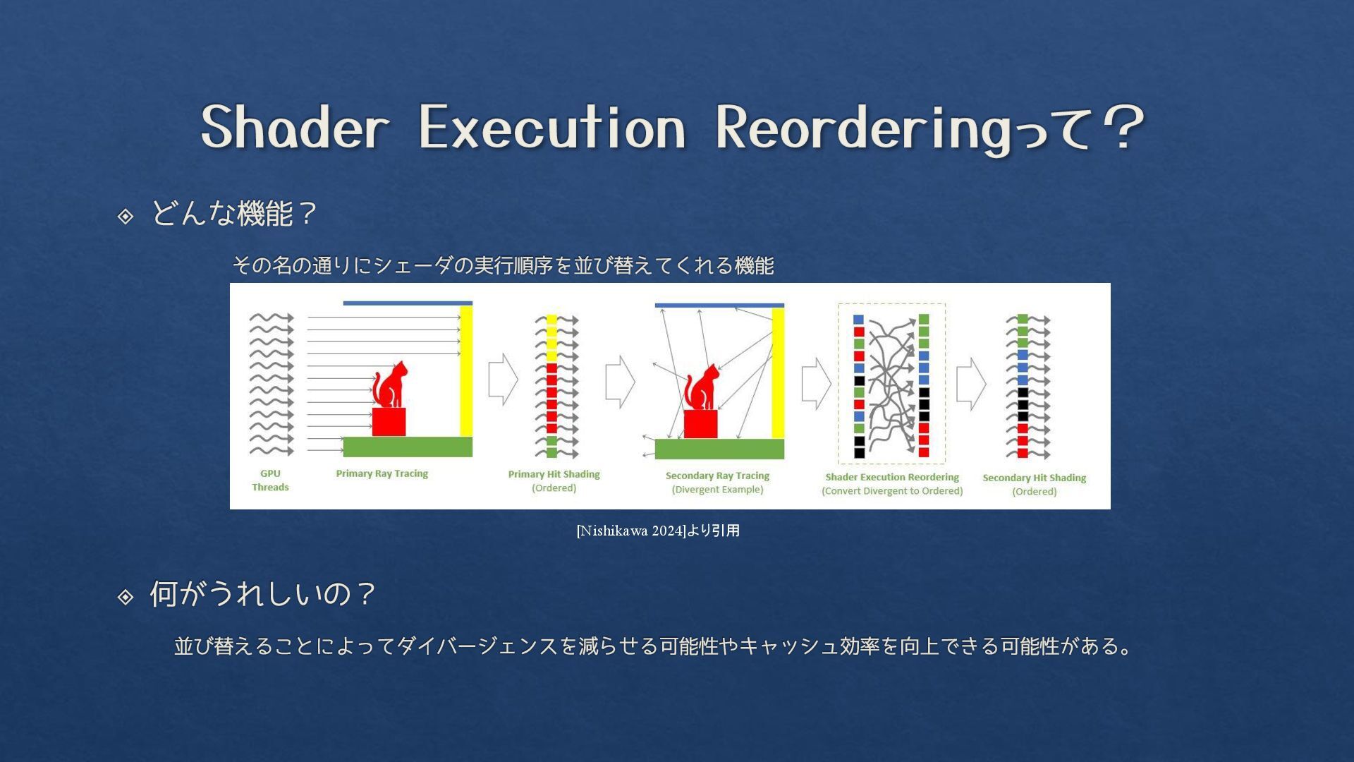 Shader Execution Reorderingって? どんな機能? その名の通りにシェーダの実行順序を並び替えてくれる機能 何がうれしいの? 並び替えることによってダイバージェンスを減らせる可能性やキャッシュ効率を向上できる可能性がある。 [Nishikawa 2024]より引用