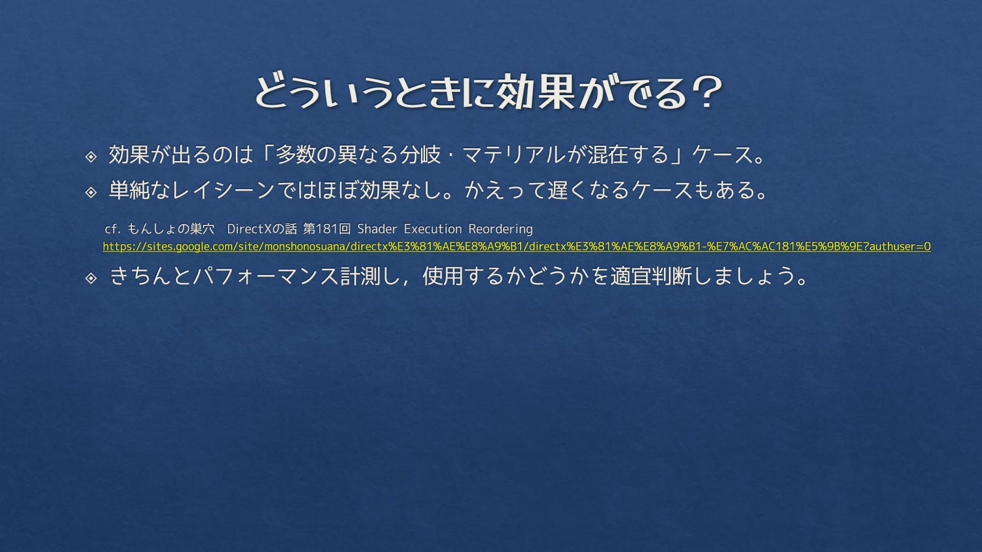 どういうときに効果がでる? 効果が出るのは「多数の異なる分岐・マテリアルが混在する」ケース。 単純なレイシーンではほぼ効果なし。かえって遅くなるケースもある。 cf. もんしょの巣穴 DirectXの話 第181回 Shader Execution Reordering