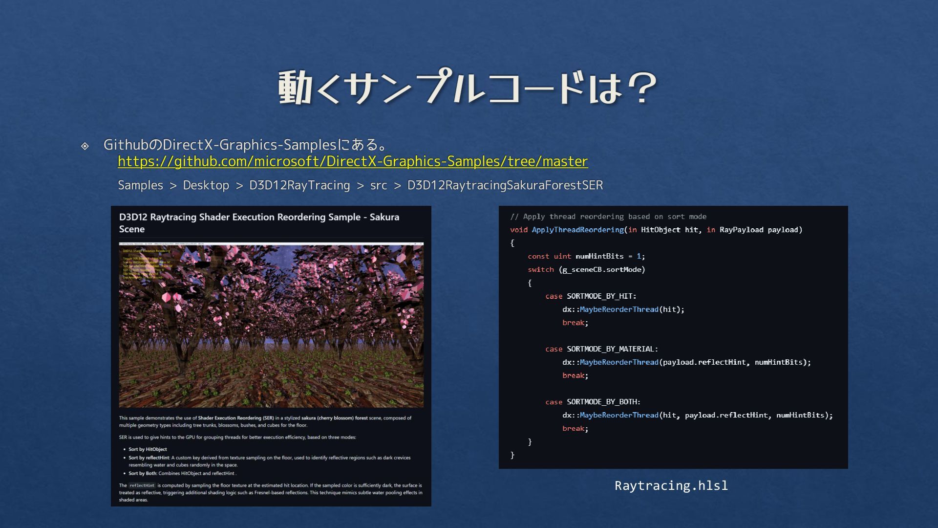 動くサンプルコードは? GithubのDirectX-Graphics-Samplesにある。 https://github.com/microsoft/DirectX-Graphics-Samples/tree/master Samples > Desktop > D3D12RayTracing > src