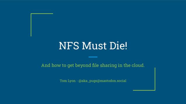 One of the most important lessons learned in distributed computing and concurrency is that shared mutable data is a bad idea. What is the purpose of a network file system? – to provide a shared mutable data space. There are many other problems with the NFS model at cloud scale. NFS remains popular because its killer feature is access to large data sets, by network-unaware applications, without having to first copy them. Using existing file systems, OverlayFS, and NVMe-Over-Fabrics, we propose a new approach to achieve blazing-fast, highly scalable, and consistent access to dynamic data sets. We solicit contributors.