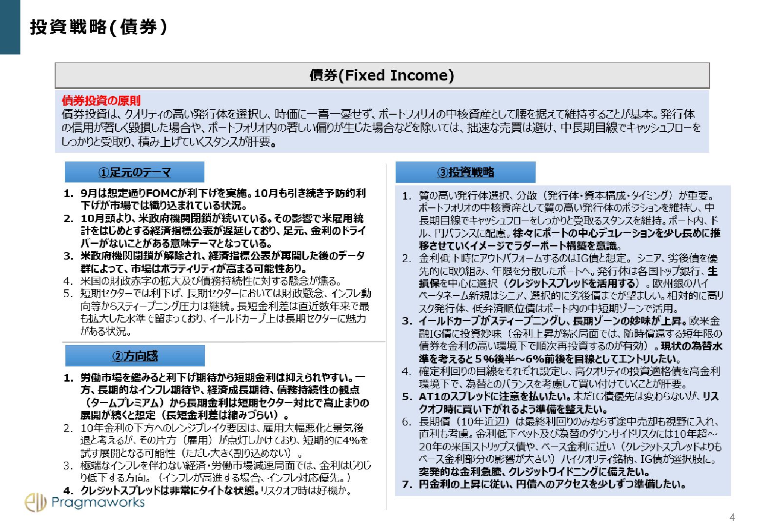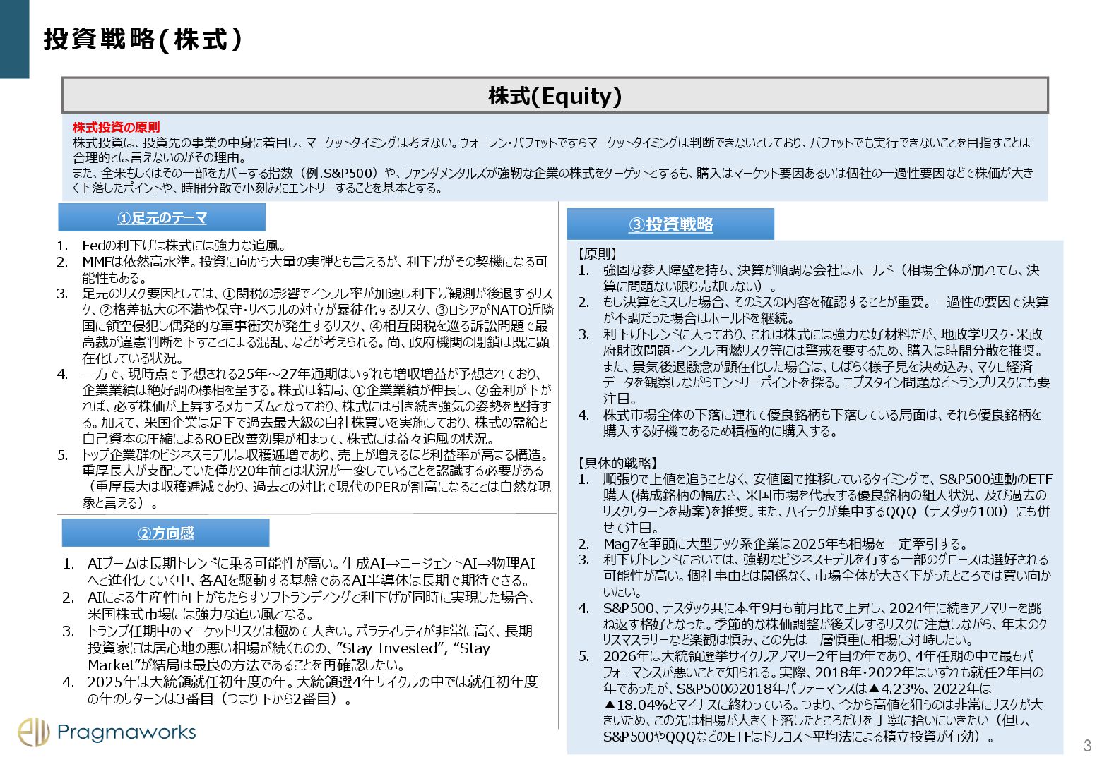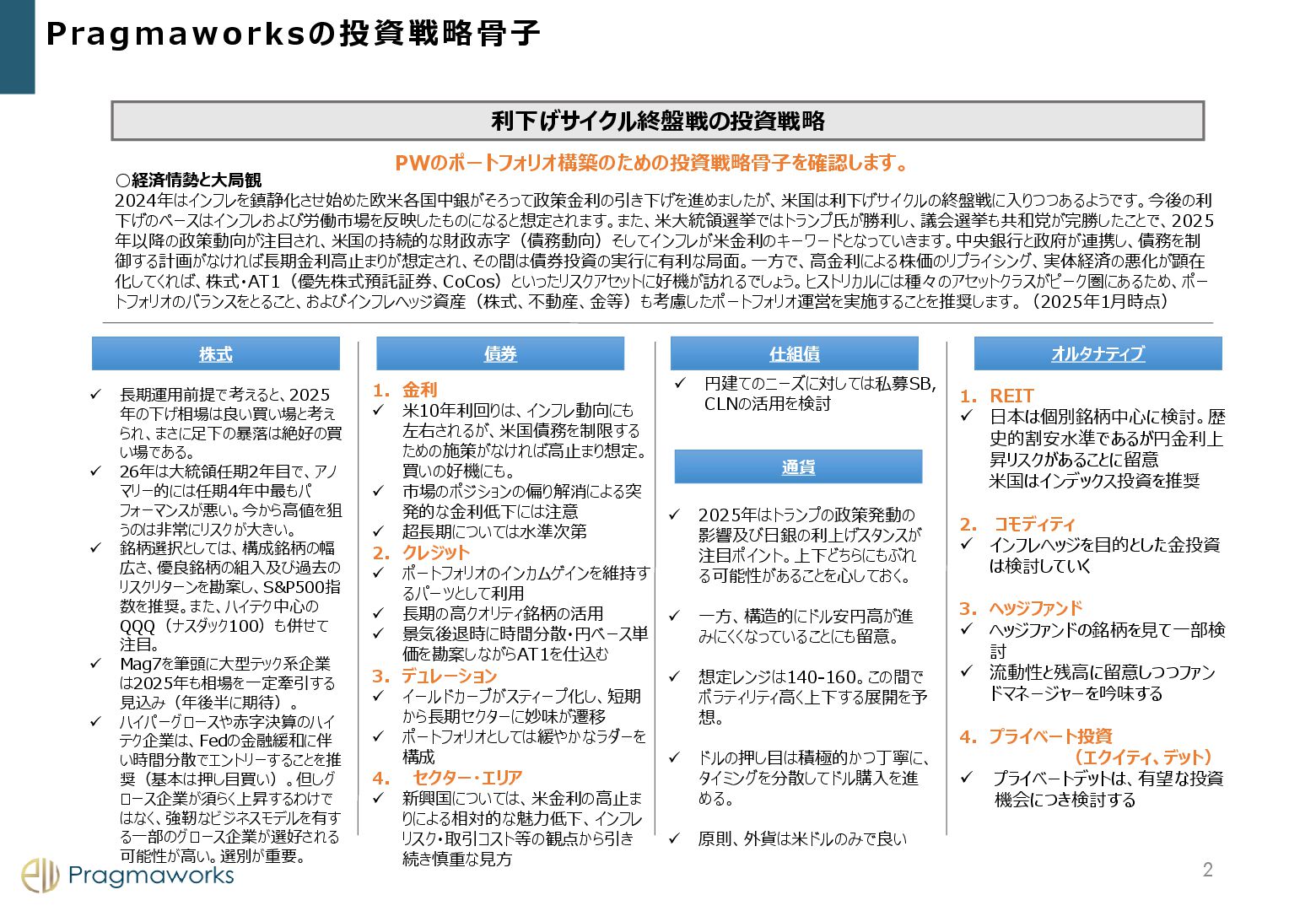 債券 通貨 オルタナティブ 1. 金利 ✓ 米10年利回りは、インフレ動向にも 左右されるが、米国債務を制限する ための施策がなければ高止まり想定。 買いの好機にも。 ✓ 市場のポジションの偏り解消による突 発的な金利低下には注意 ✓ 超⾧期については水準次第 2. クレジット ✓ ポートフォリオのインカムゲインを維持す るパーツとして利用 ✓ ⾧期の高クオリティ銘柄の活用 ✓ 景気後退時に時間分散・円ベース単 価を勘案しながらAT1を仕込む 3. デュレーション ✓ イールドカーブがスティープ化し、短期 から⾧期セクターに妙味が遷移 ✓ ポートフォリオとしては緩やかなラダーを 構成 4. セクター・エリア ✓ 新興国については、米金利の高止ま りによる相対的な魅力低下、インフレ リスク・取引コスト等の観点から引き 続き慎重な見方 ✓ 2025年はトランプの政策発動の 影響及び日銀の利上げスタンスが 注目ポイント。上下どちらにもぶれ る可能性があることを心しておく。 ✓ 一方、構造的にドル安円高が進 みにくくなっていることにも留意。 ✓ 想定レンジは140-160。この間で ボラティリティ高く上下する展開を予 想。 ✓ ドルの押し目は積極的かつ丁寧に、 タイミングを分散してドル購入を進 める。 ✓ 原則、外貨は米ドルのみで良い 1. REIT ✓ 日本は個別銘柄中心に検討。歴 史的割安水準であるが円金利上 昇リスクがあることに留意 米国はインデックス投資を推奨 2. コモディティ ✓ インフレヘッジを目的とした金投資 は検討していく 3. ヘッジファンド ✓ ヘッジファンドの銘柄を見て一部検 討 ✓ 流動性と残高に留意しつつファン ドマネージャーを吟味する 4. プライベート投資 (エクイティ、デット) ✓ プライベートデットは、有望な投資 機会につき検討する 仕組債 ✓ 円建てのニーズに対しては私募SB, CLNの活用を検討 Pragmaworksの投資戦略骨子 ✓ ⾧期運用前提で考えると、2025 年の下げ相場は良い買い場と考え られ、まさに足下の暴落は絶好の買 い場である。 ✓ 26年は大統領任期2年目で、アノ マリー的には任期4年中最もパ フォーマンスが悪い。今から高値を狙 うのは非常にリスクが大きい。 ✓ 銘柄選択としては、構成銘柄の幅 広さ、優良銘柄の組入及び過去の リスクリターンを勘案し、S&P500指 数を推奨。また、ハイテク中心の QQQ(ナスダック100)も併せて 注目。 ✓ Mag7を筆頭に大型テック系企業 は2025年も相場を一定牽引する 見込み(年後半に期待)。 ✓ ハイパーグロースや赤字決算のハイ テク企業は、Fedの金融緩和に伴 い時間分散でエントリーすることを推 奨(基本は押し目買い)。但しグ ロース企業が須らく上昇するわけで はなく、強靭なビジネスモデルを有す る一部のグロース企業が選好される 可能性が高い。選別が重要。 2