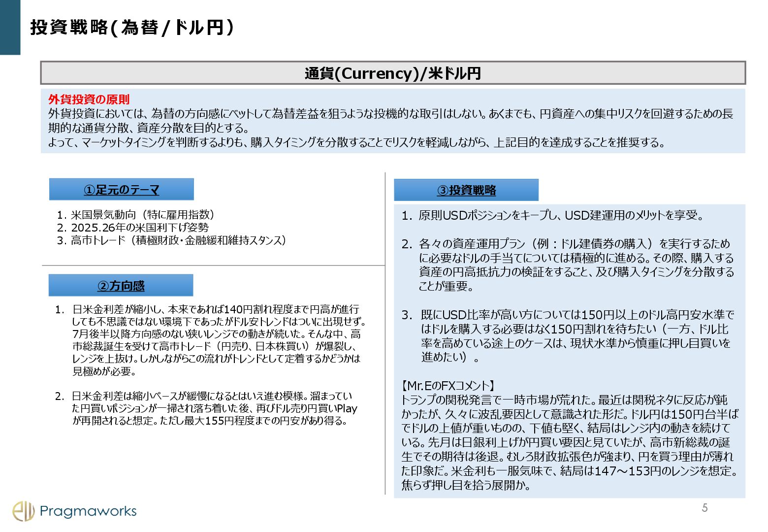 高市トレード(積極財政・金融緩和維持スタンス) 1. 日米金利差が縮小し、本来であれば140円割れ程度まで円高が進行 しても不思議ではない環境下であったがドル安トレンドはついに出現せず。 7月後半以降方向感のない狭いレンジでの動きが続いた。そんな中、高 市総裁誕生を受けて高市トレード(円売り、日本株買い)が爆裂し、 レンジを上抜け。しかしながらこの流れがトレンドとして定着するかどうかは 見極めが必要。 2. 日米金利差は縮小ペースが緩慢になるとはいえ進む模様。溜まってい た円買いポジションが一掃され落ち着いた後、再びドル売り円買いPlay が再開されると想定。ただし最大155円程度までの円安があり得る。 外貨投資の原則 外貨投資においては、為替の方向感にベットして為替差益を狙うような投機的な取引はしない。あくまでも、円資産への集中リスクを回避するための⾧ 期的な通貨分散、資産分散を目的とする。 よって、マーケットタイミングを判断するよりも、購入タイミングを分散することでリスクを軽減しながら、上記目的を達成することを推奨する。 1. 原則USDポジションをキープし、USD建運用のメリットを享受。 2. 各々の資産運用プラン(例:ドル建債券の購入)を実行するため に必要なドルの手当てについては積極的に進める。その際、購入する 資産の円高抵抗力の検証をすること、及び購入タイミングを分散する ことが重要。 3. 既にUSD比率が高い方については150円以上のドル高円安水準で はドルを購入する必要はなく150円割れを待ちたい(一方、ドル比 率を高めている途上のケースは、現状水準から慎重に押し目買いを 進めたい)。 【Mr.EのFXコメント】 トランプの関税発言で一時市場が荒れた。最近は関税ネタに反応が鈍 かったが、久々に波乱要因として意識された形だ。ドル円は150円台半ば でドルの上値が重いものの、下値も堅く、結局はレンジ内の動きを続けて いる。先月は日銀利上げが円買い要因と見ていたが、高市新総裁の誕 生でその期待は後退。むしろ財政拡張色が強まり、円を買う理由が薄れ た印象だ。米金利も一服気味で、結局は147~153円のレンジを想定。 焦らず押し目を拾う展開か。 5