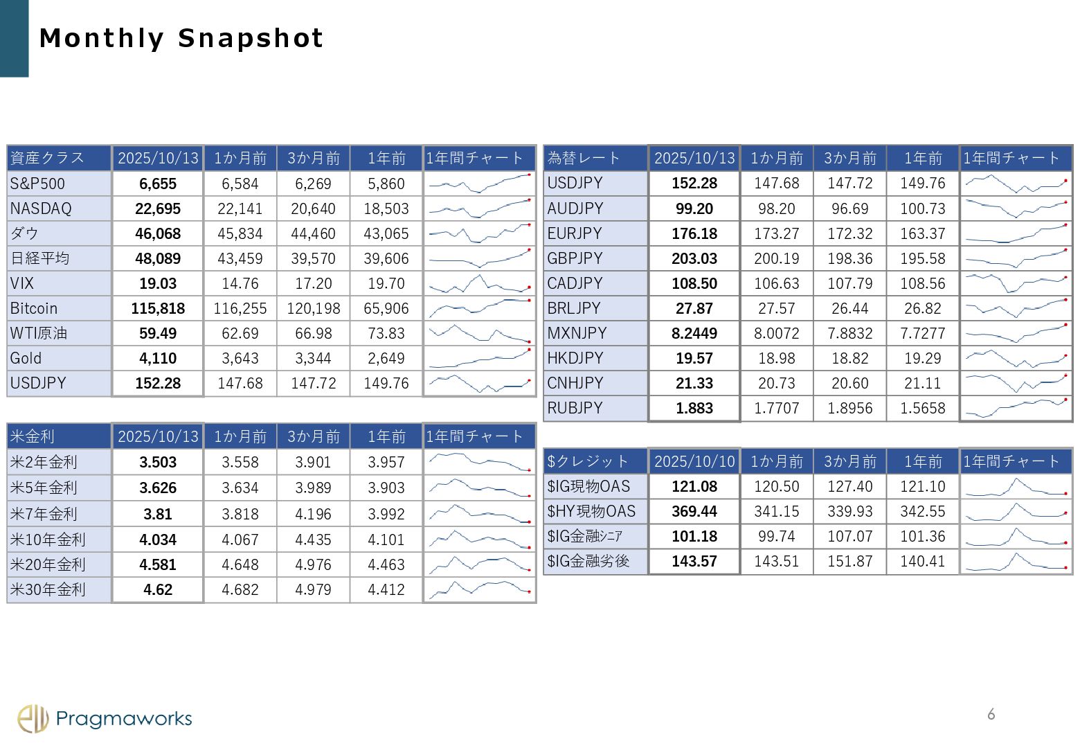 6,655 6,584 6,269 5,860 NASDAQ 22,695 22,141 20,640 18,503 ダウ 46,068 45,834 44,460 43,065 日経平均 48,089 43,459 39,570 39,606 VIX 19.03 14.76 17.20 19.70 Bitcoin 115,818 116,255 120,198 65,906 WTI原油 59.49 62.69 66.98 73.83 Gold 4,110 3,643 3,344 2,649 USDJPY 152.28 147.68 147.72 149.76 米金利 2025/10/13 1か月前 3か月前 1年前 1年間チャート 米2年金利 3.503 3.558 3.901 3.957 米5年金利 3.626 3.634 3.989 3.903 米7年金利 3.81 3.818 4.196 3.992 米10年金利 4.034 4.067 4.435 4.101 米20年金利 4.581 4.648 4.976 4.463 米30年金利 4.62 4.682 4.979 4.412 為替レート 2025/10/13 1か月前 3か月前 1年前 1年間チャート USDJPY 152.28 147.68 147.72 149.76 AUDJPY 99.20 98.20 96.69 100.73 EURJPY 176.18 173.27 172.32 163.37 GBPJPY 203.03 200.19 198.36 195.58 CADJPY 108.50 106.63 107.79 108.56 BRLJPY 27.87 27.57 26.44 26.82 MXNJPY 8.2449 8.0072 7.8832 7.7277 HKDJPY 19.57 18.98 18.82 19.29 CNHJPY 21.33 20.73 20.60 21.11 RUBJPY 1.883 1.7707 1.8956 1.5658 $クレジット 2025/10/10 1か月前 3か月前 1年前 1年間チャート $IG現物OAS 121.08 120.50 127.40 121.10 $HY現物OAS 369.44 341.15 339.93 342.55 $IG金融シニア 101.18 99.74 107.07 101.36 $IG金融劣後 143.57 143.51 151.87 140.41