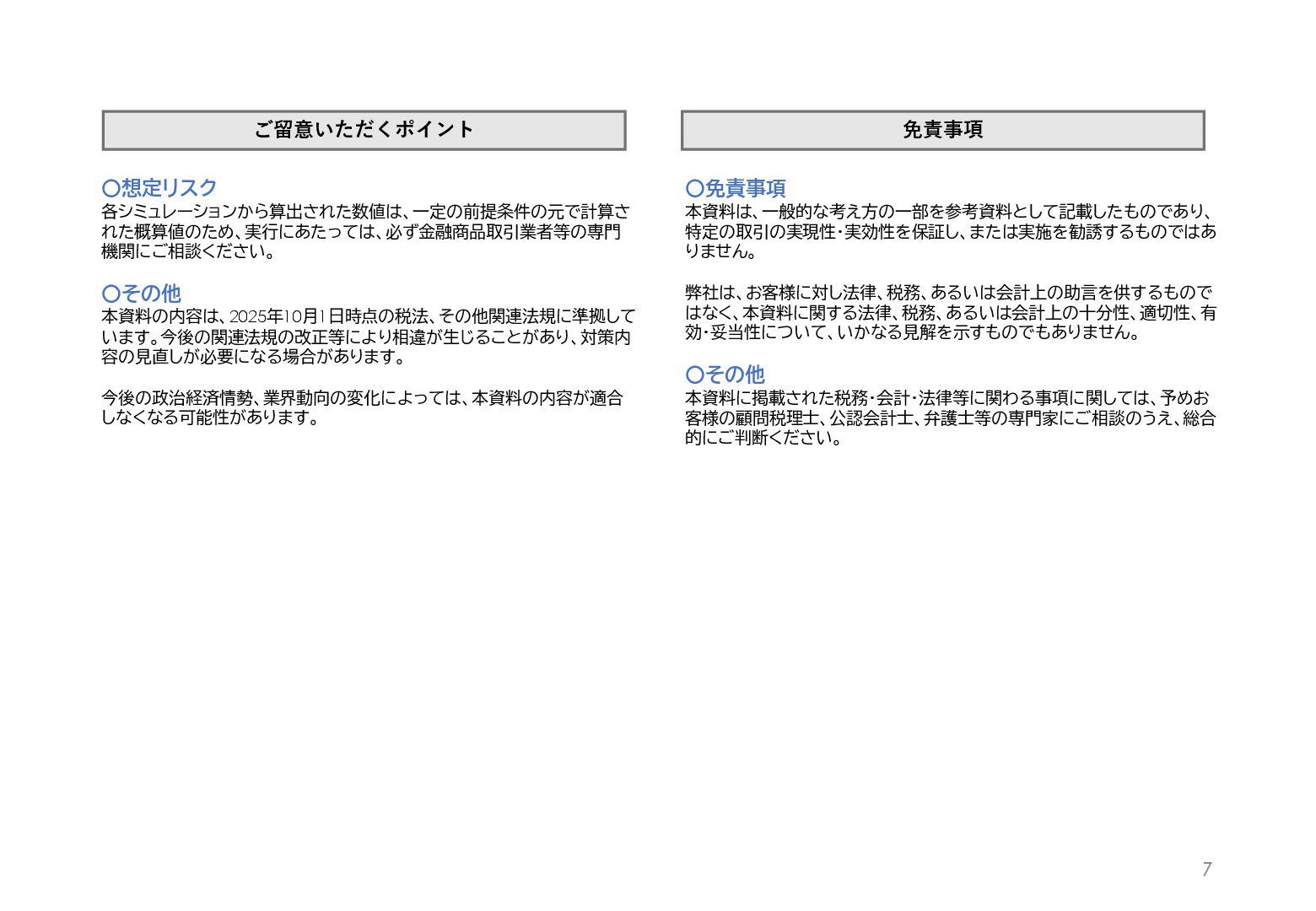 5. ご留意いただくポイント 〇想定リスク 各シミュレーションから算出された数値は、一定の前提条件の元で計算さ れた概算値のため、実行にあたっては、必ず金融商品取引業者等の専門 機関にご相談ください。 〇その他 本資料の内容は、2025年10月1日時点の税法、その他関連法規に準拠して います。今後の関連法規の改正等により相違が生じることがあり、対策内 容の見直しが必要になる場合があります。 今後の政治経済情勢、業界動向の変化によっては、本資料の内容が適合